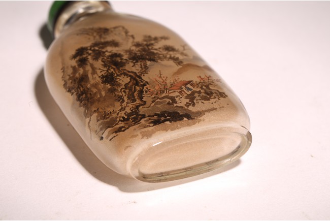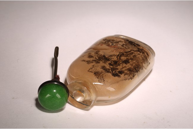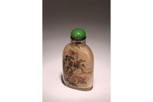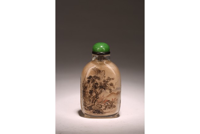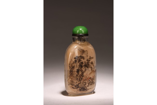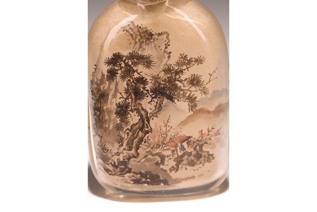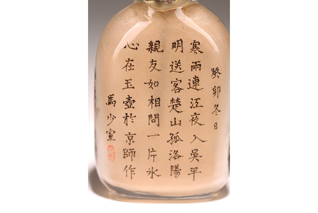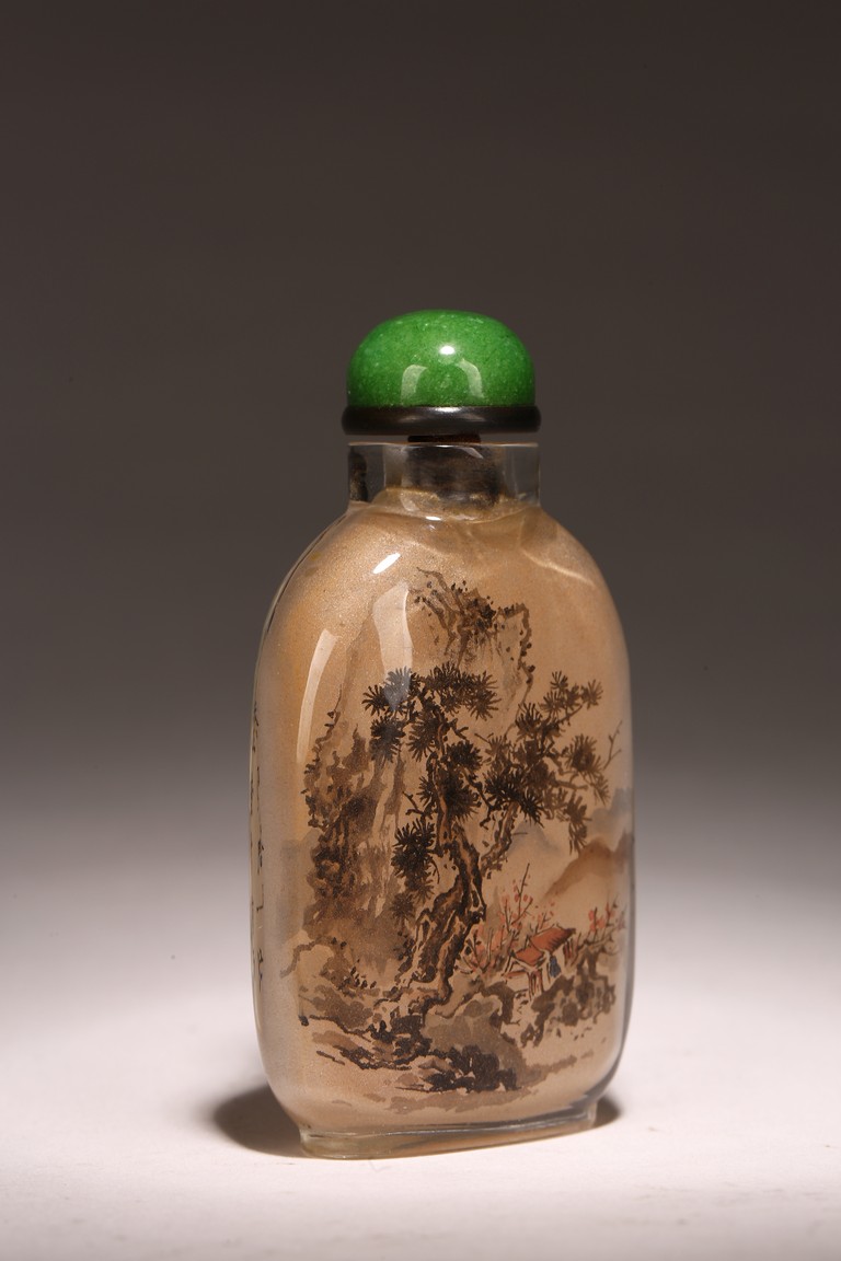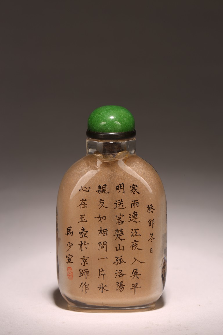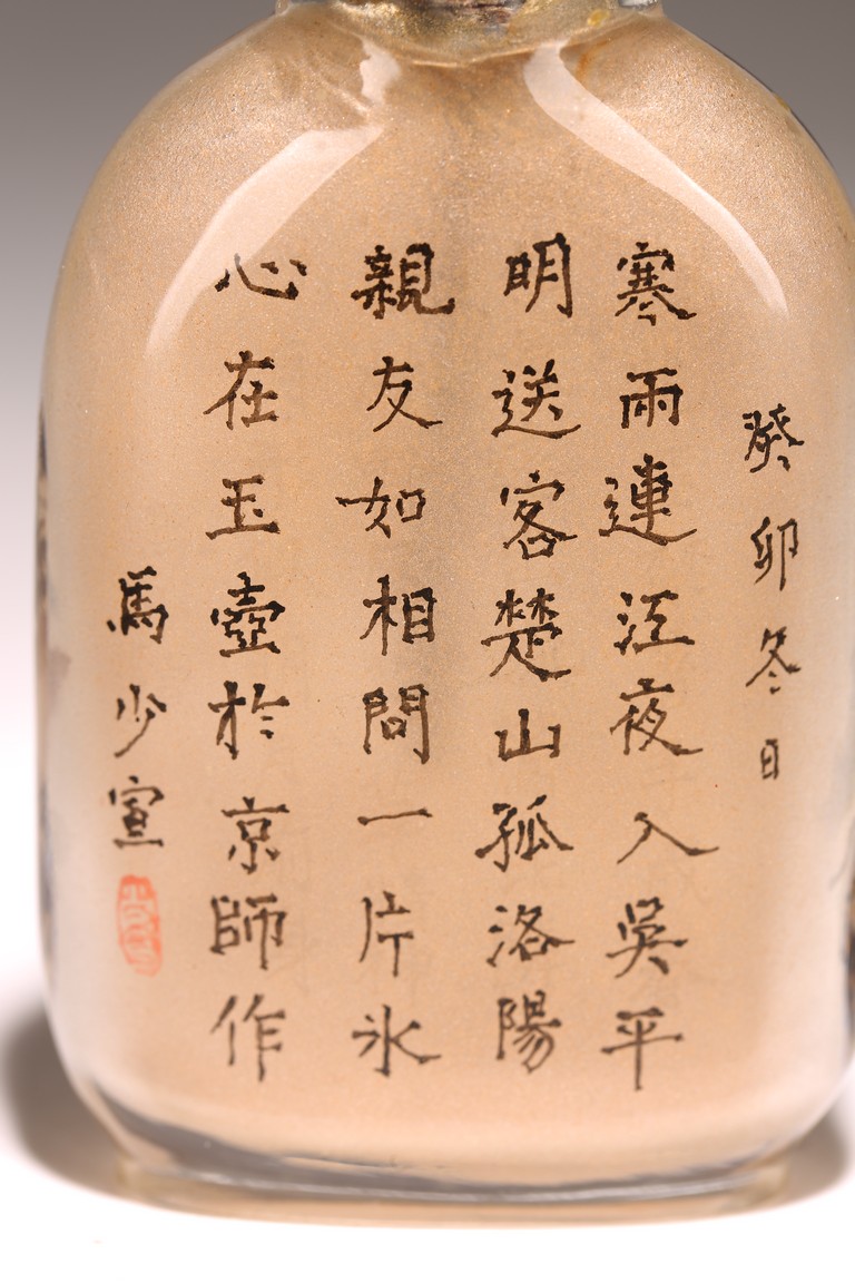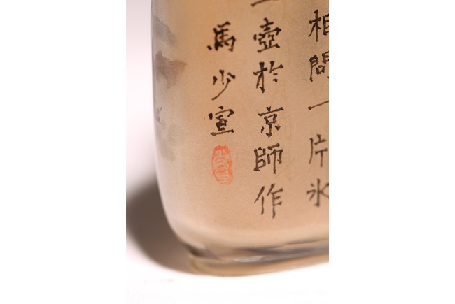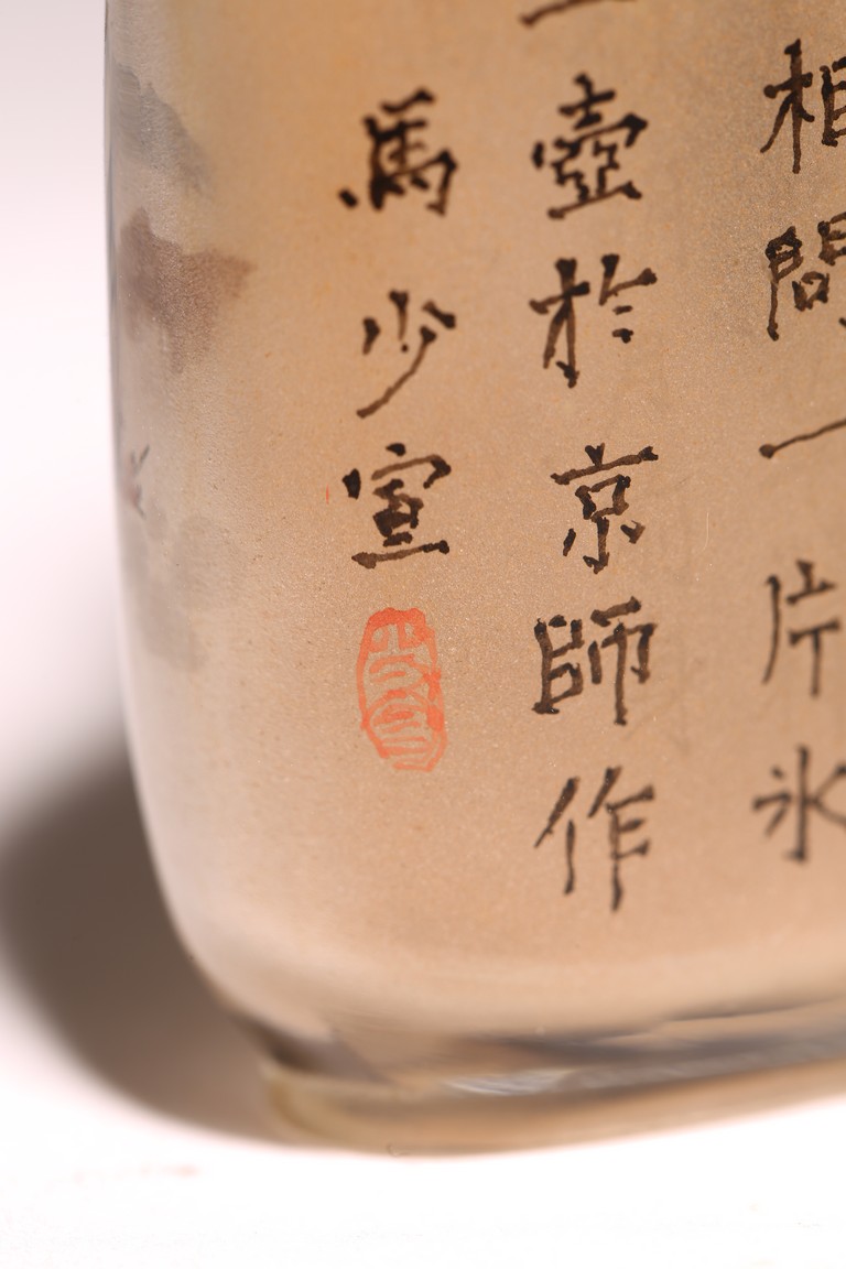 Qing Dynasty period. Of rounded rectangular form, painted with mountain landscape scene depicting a pavillion on the foot of hills and under two large pine trees, the reverse inscribed with poetic inscriptions signed Ma Shaoxuan.