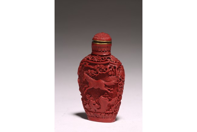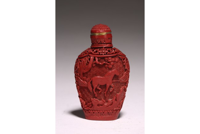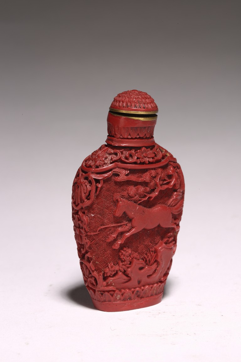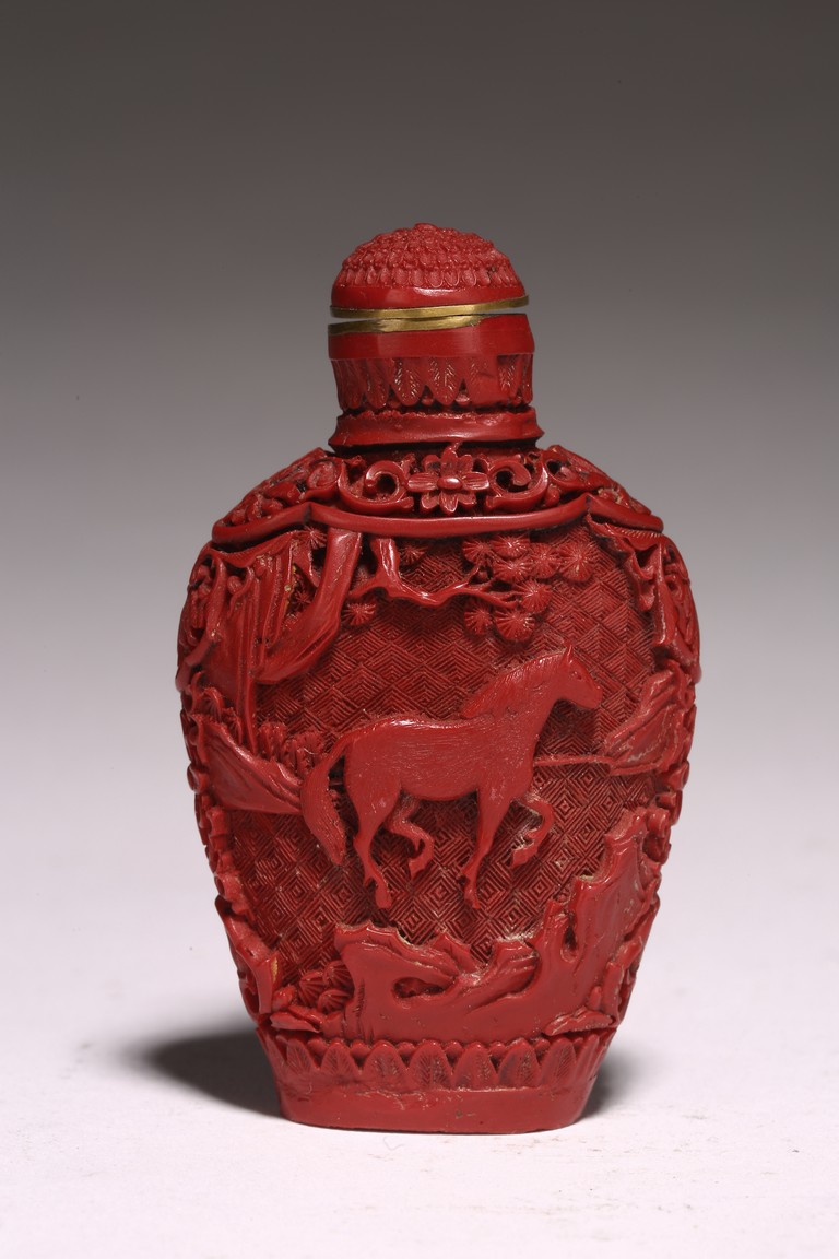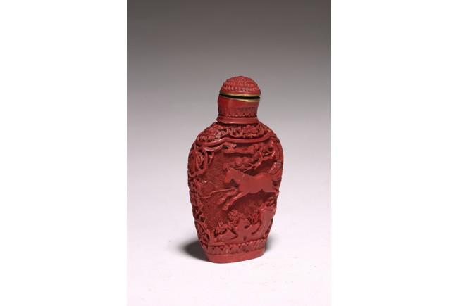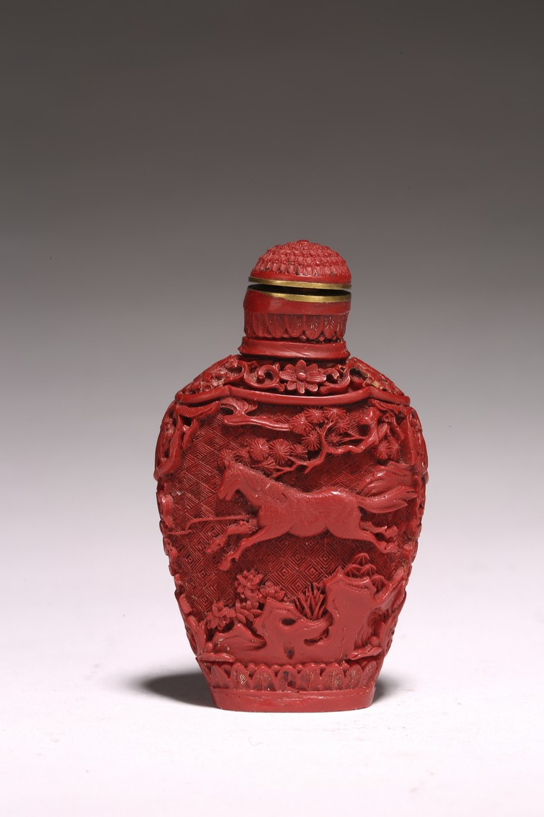 Qing Dynasty period. comprising a cinnabar lacquer snuff bottle carved with horses and a circular cinnabar lacquer pendant carved with stylized longevity character.