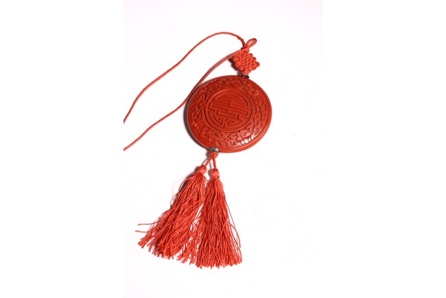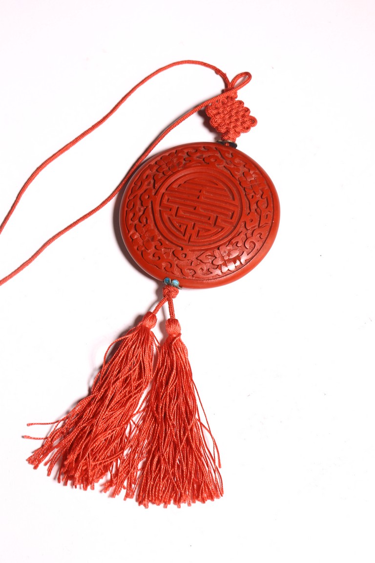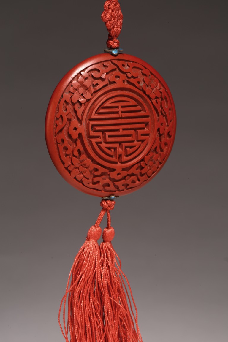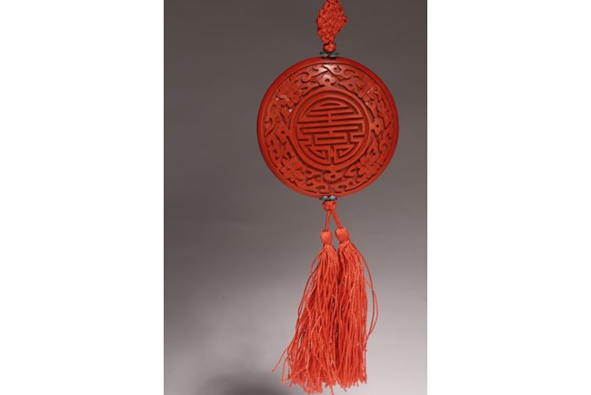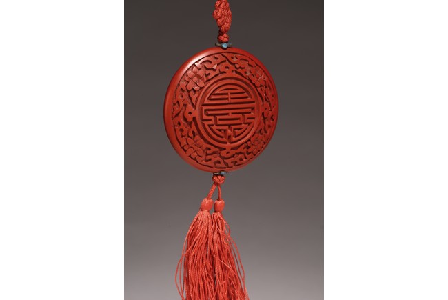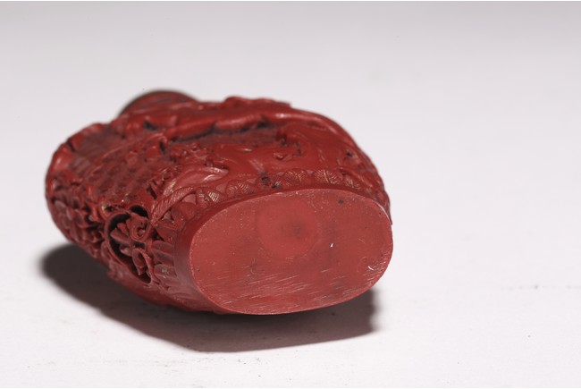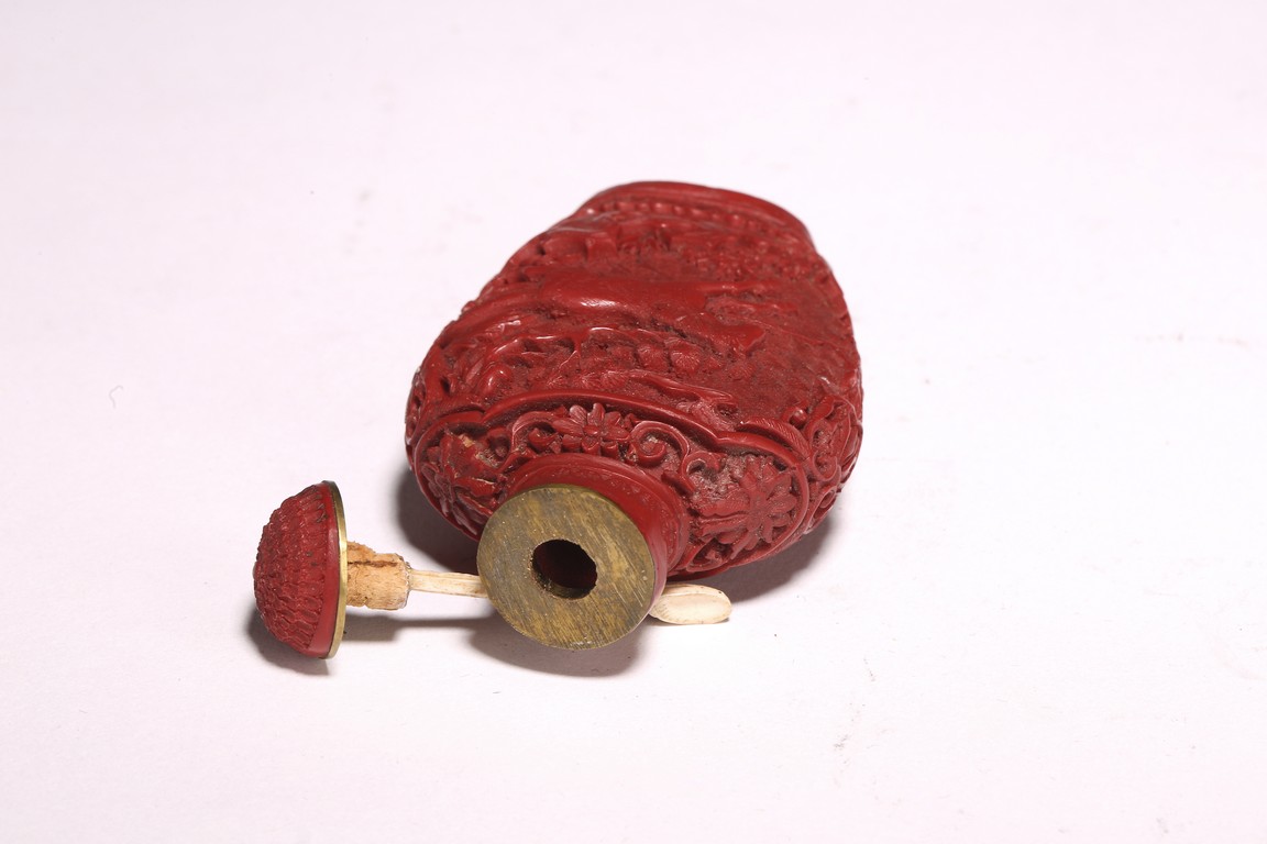 Qing Dynasty period. comprising a cinnabar lacquer snuff bottle carved with horses and a circular cinnabar lacquer pendant carved with stylized longevity character.