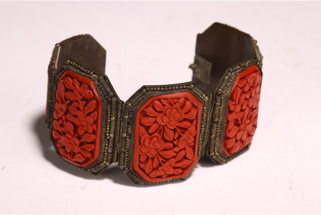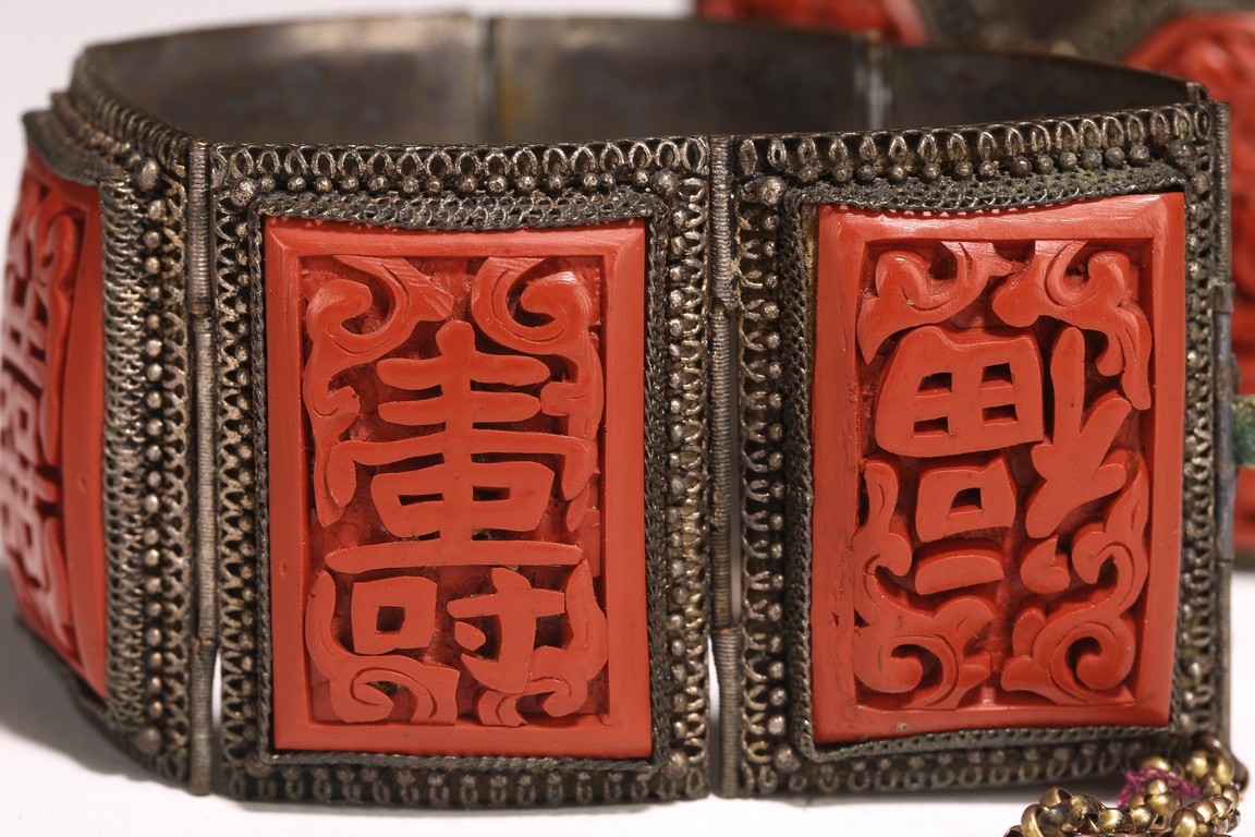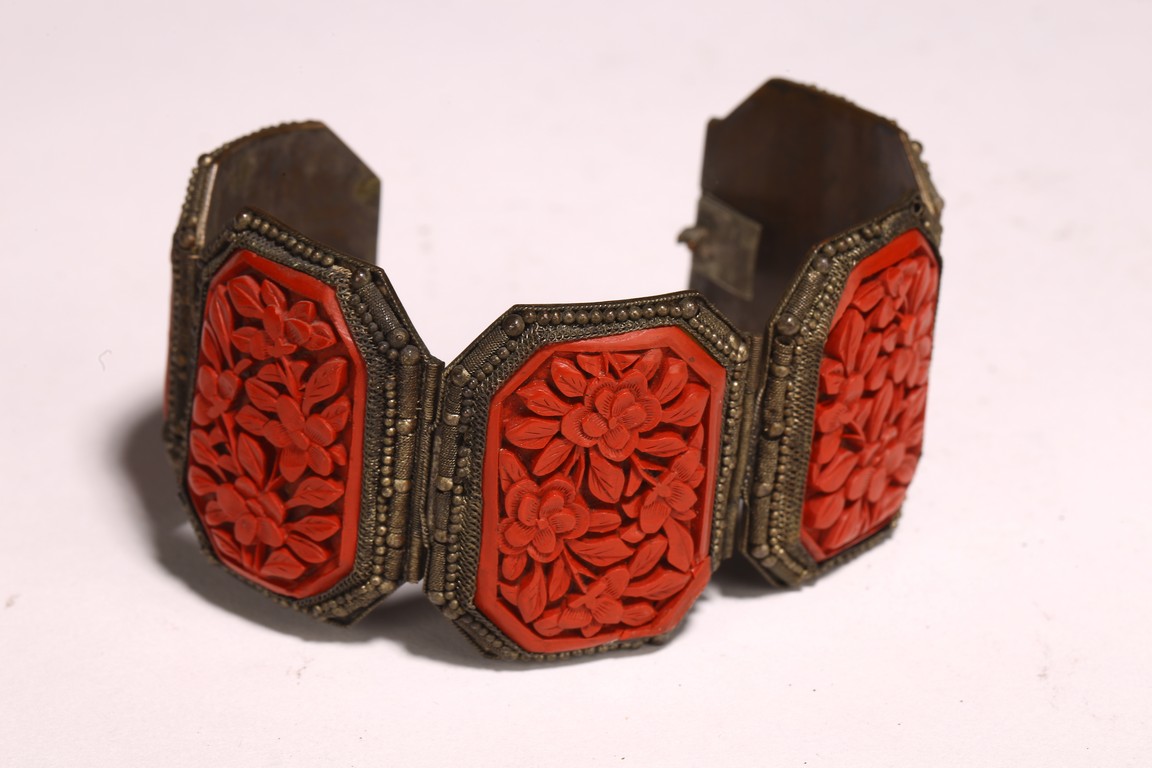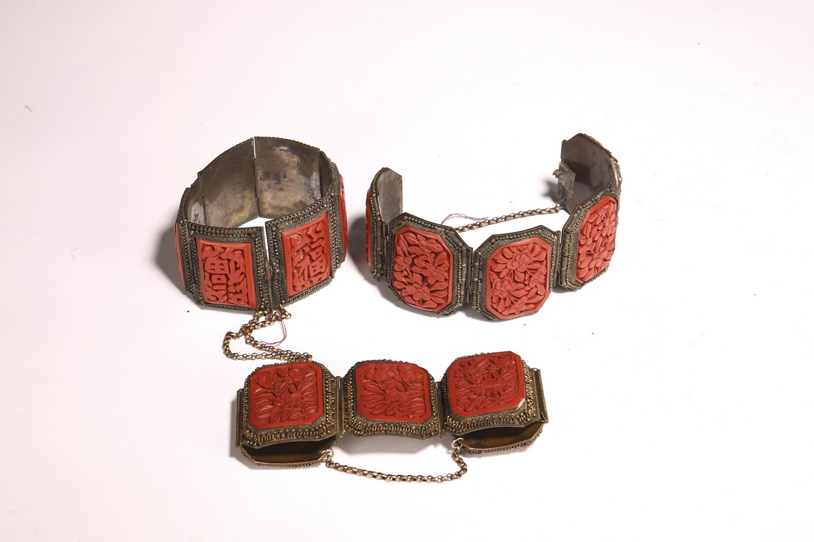Late Qing/Republic period. comprising three bracelets each inlaid with cinnabar lacquer panels carved with flowers and auspicious characters in relief.