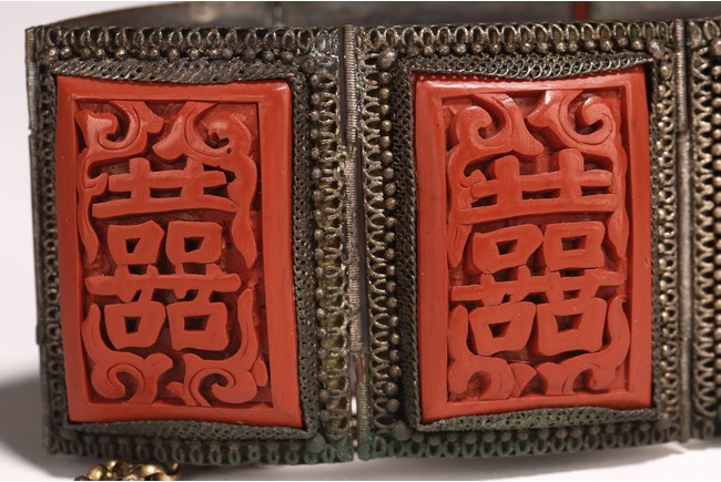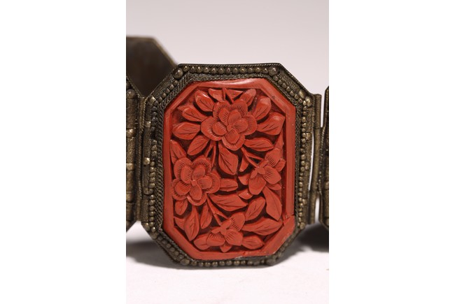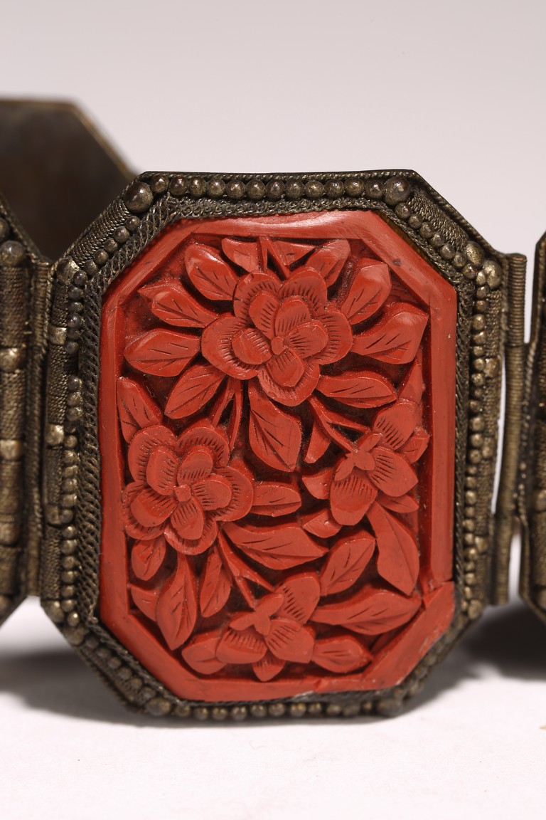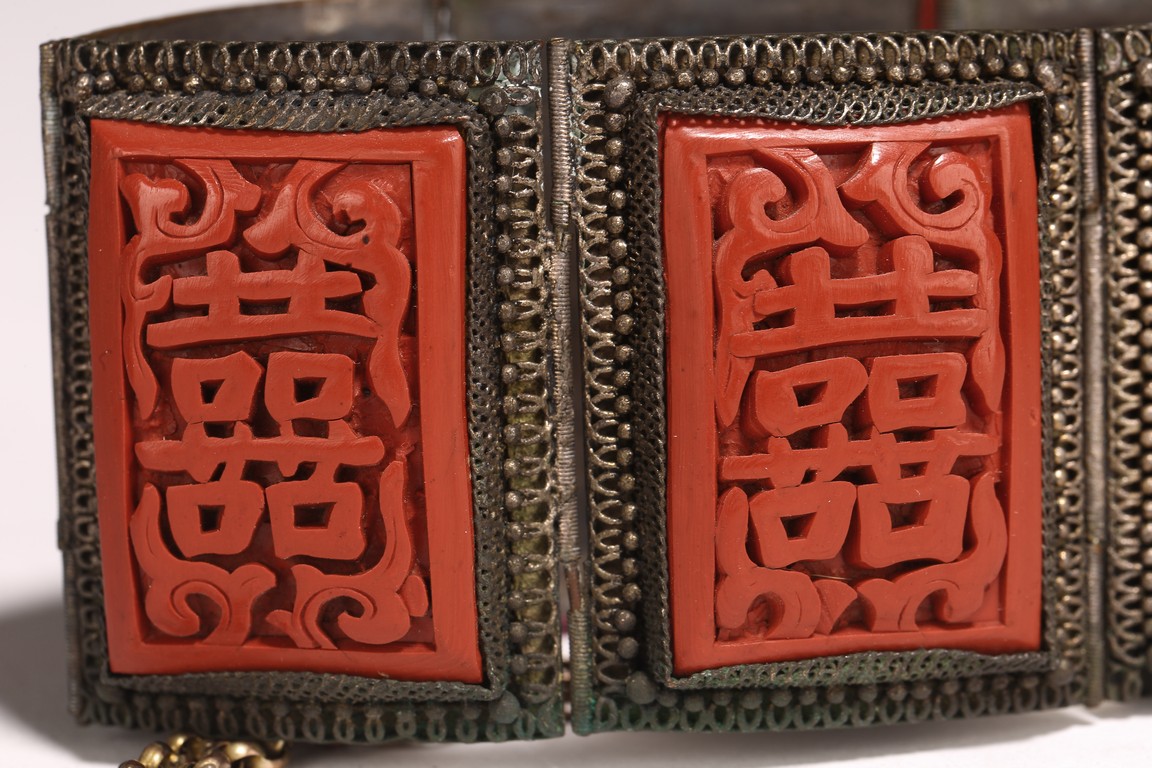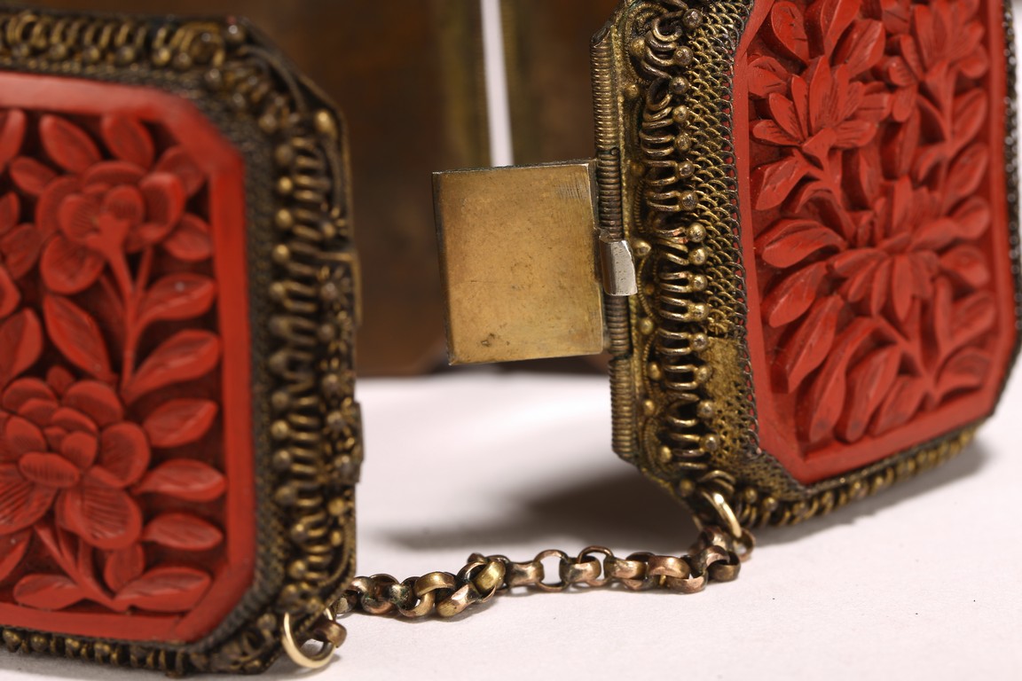 Late Qing/Republic period. comprising three bracelets each inlaid with cinnabar lacquer panels carved with flowers and auspicious characters in relief.