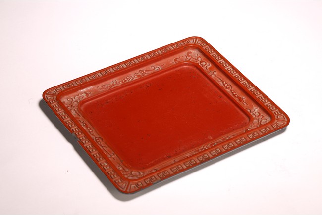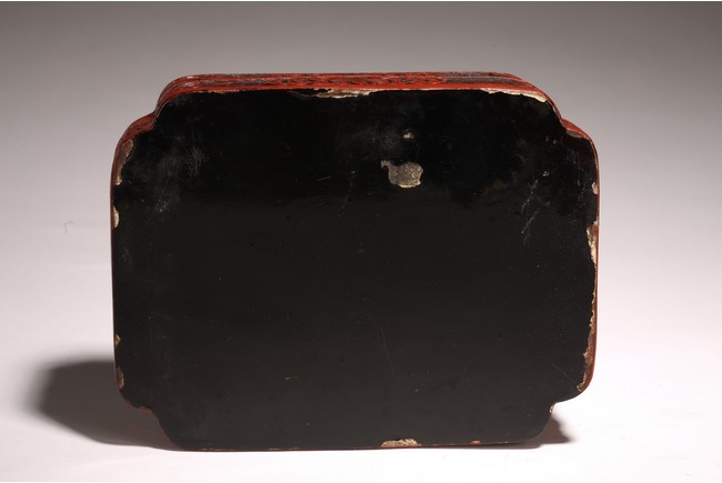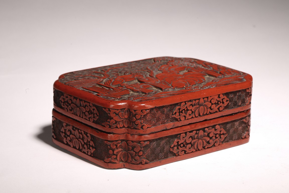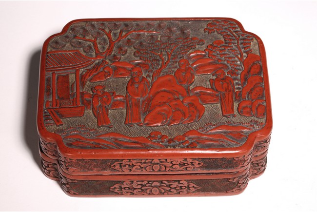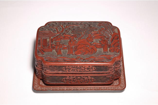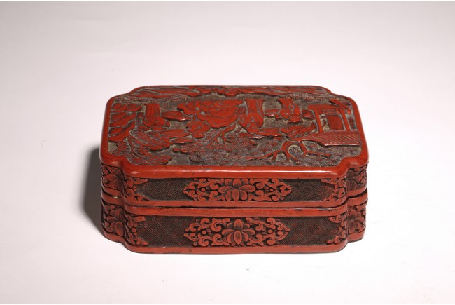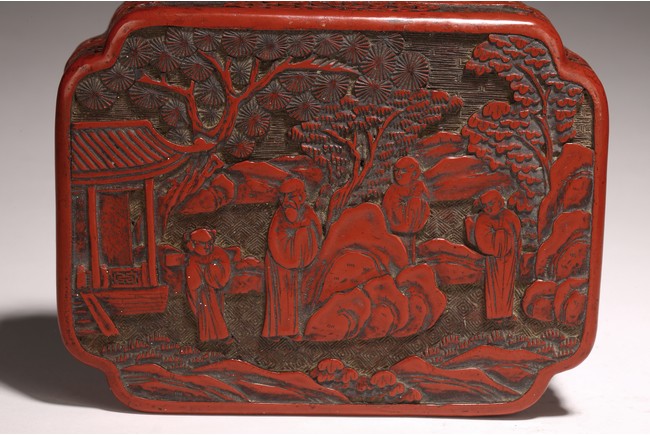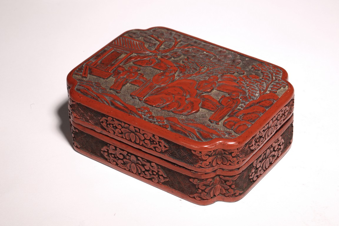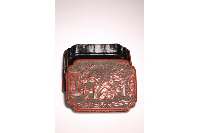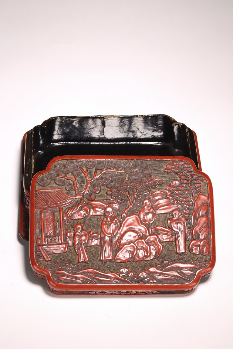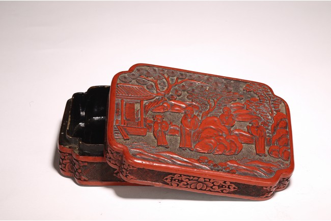 蓋盒爲海棠形,子母口,底部帶托盤。通體髹朱漆,蒼松挺立,樓閣掩映 於山石間,老者側頭回望,四周童子跟隨其旁。整器雕法精準嫻熟,工致華麗, 繁縟細巧,用刀犀利大膽,鋒芒畢露,以多種錦地表現不同空間,營造出立體 充實的感官特效。