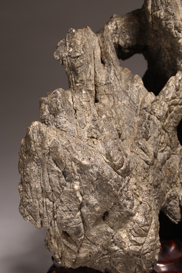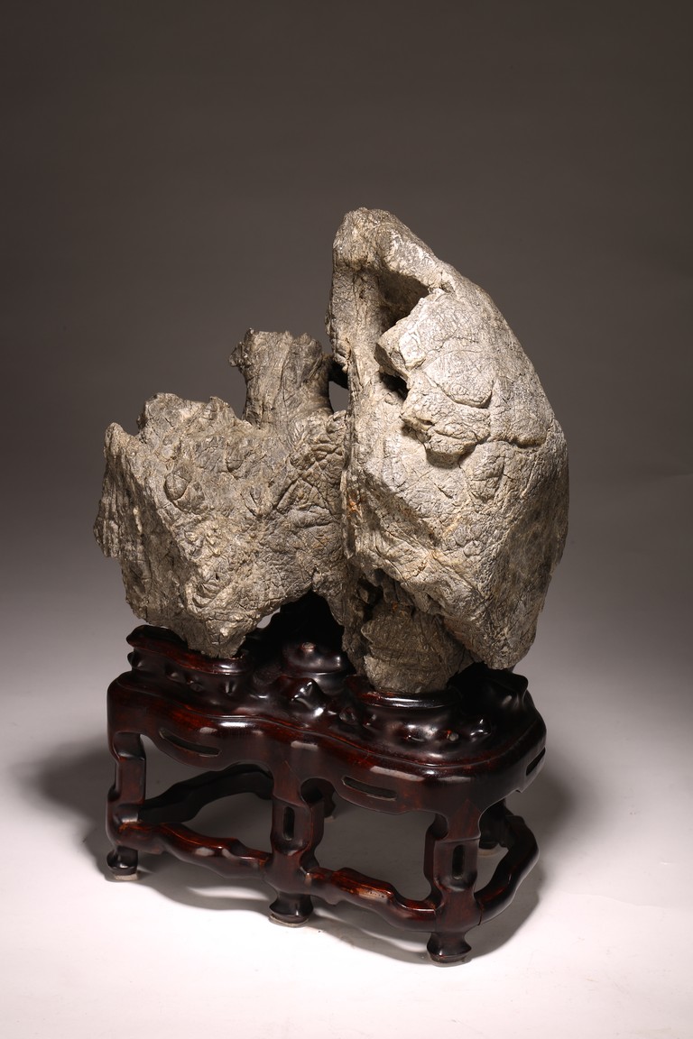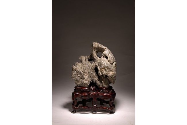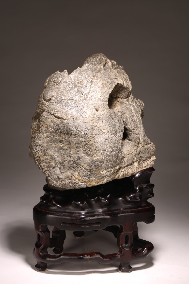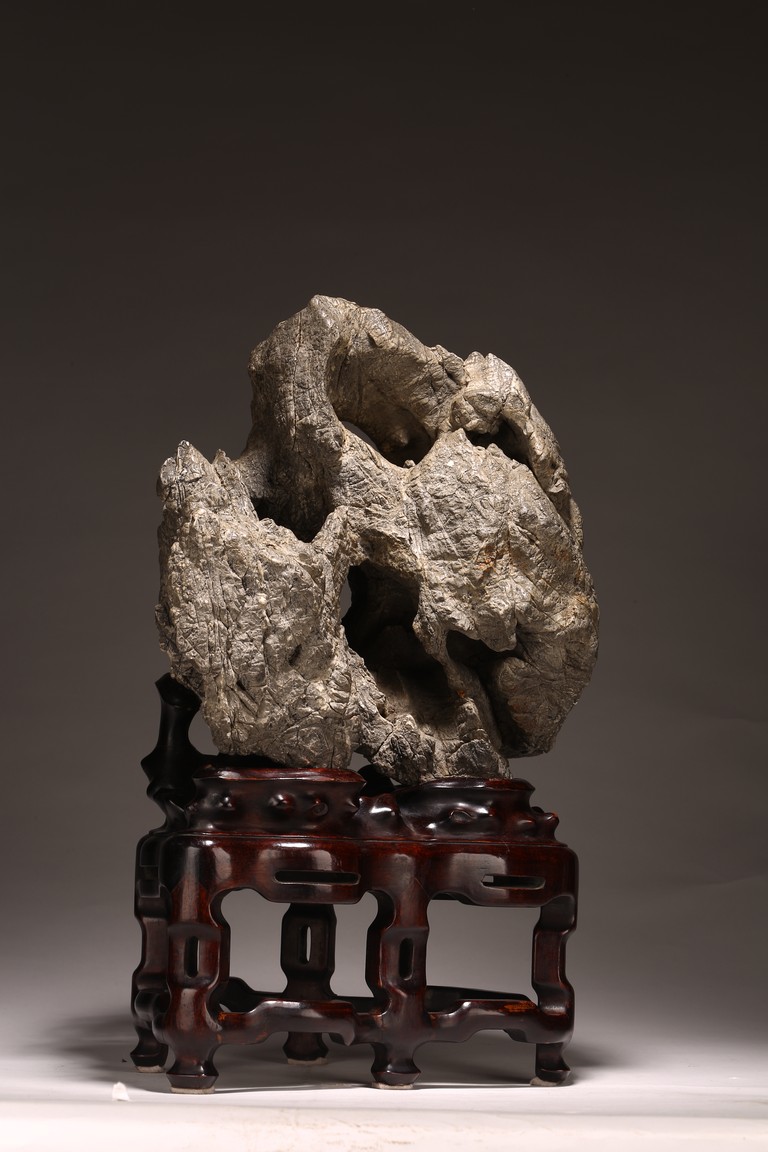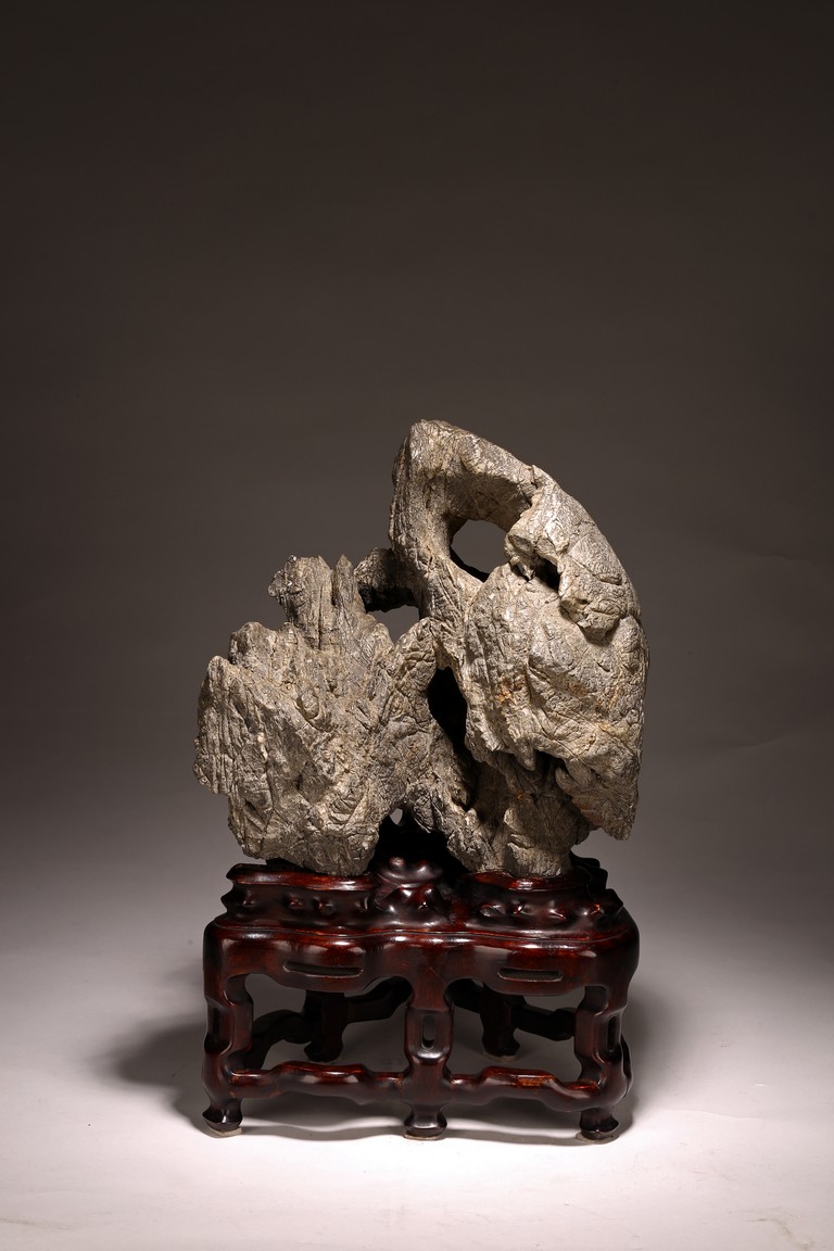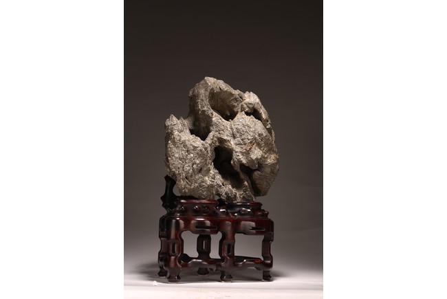 太湖石,又名窟窿石、假山石,是由石灰岩遭到長時間侵蝕後 慢慢形成的,分有水石和幹石兩種。形狀各異,姿態萬千,通靈剔 透的太湖石,最能體現“皺、漏、瘦、透”之美。太湖石擺件爲文 人書齋案頭陳設美物。本器自然隨型而成,質地細膩堅密,石表蒼 潤嶙峋,有明顯的風化剝蝕,石體孔洞嵌空玲珑,連環貫通,有“皺、 漏、瘦、透”之美。帶紅木高腳底座。此石刻詩文並署名顧麟士, 應為清末著名書畫收藏家顧文彬(道光21年進士)之孫所藏. 顧麟士, (1865~1930)名麟士,字鶴逸,諤一,自號西津漁父,別署西津、鶴廬、筠鄰。元和(今江蘇蘇州)人 來源: 洛杉磯重要私人藏家收藏 Provenance: Property from an important private collection, Los Angeles