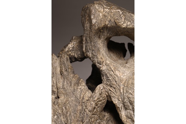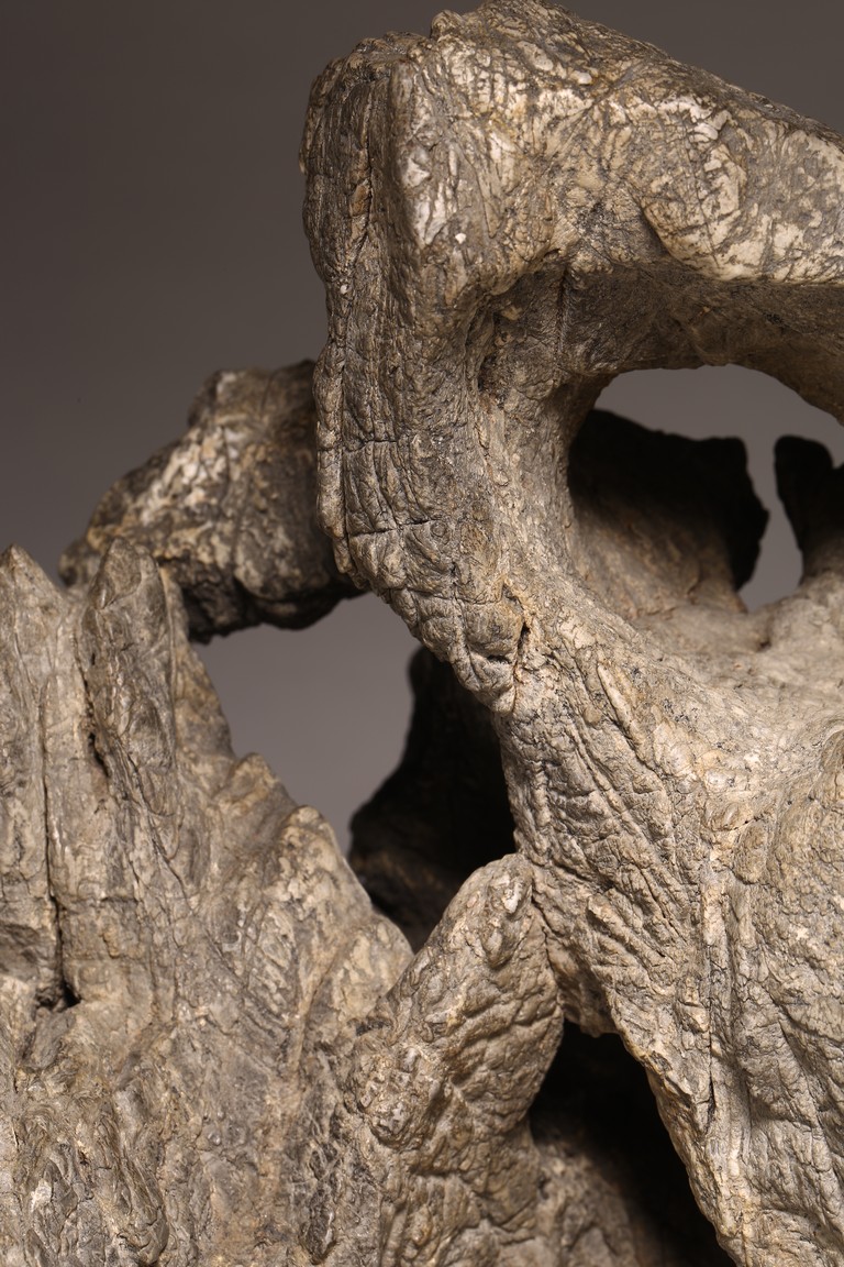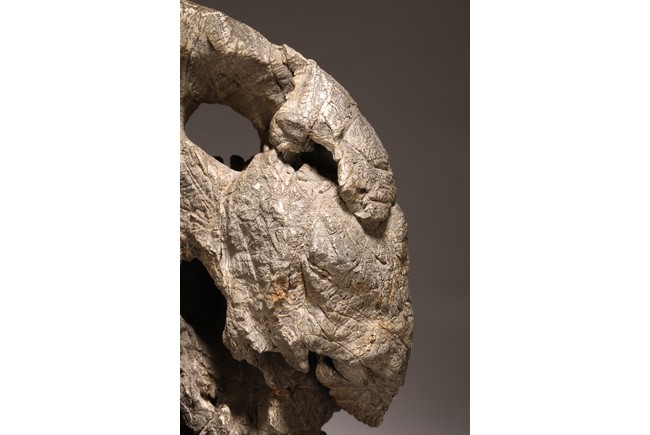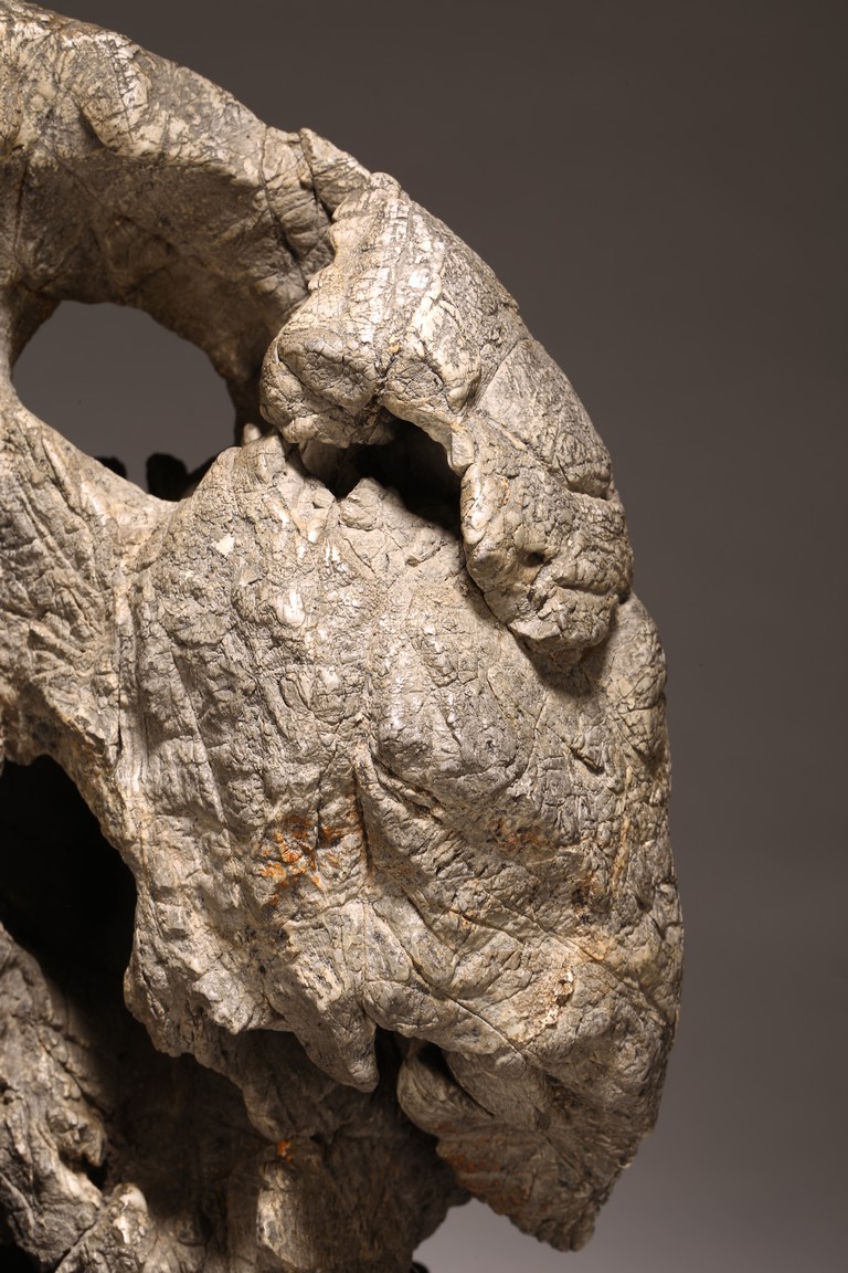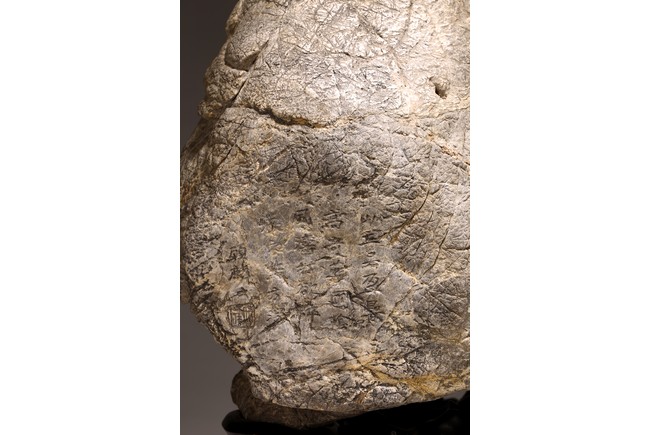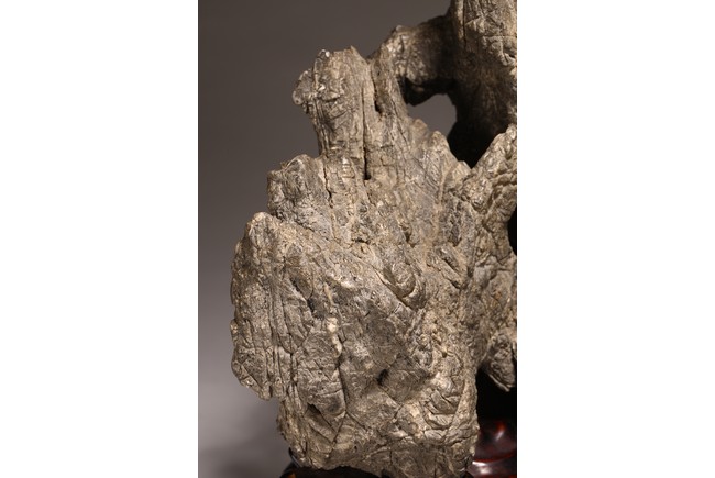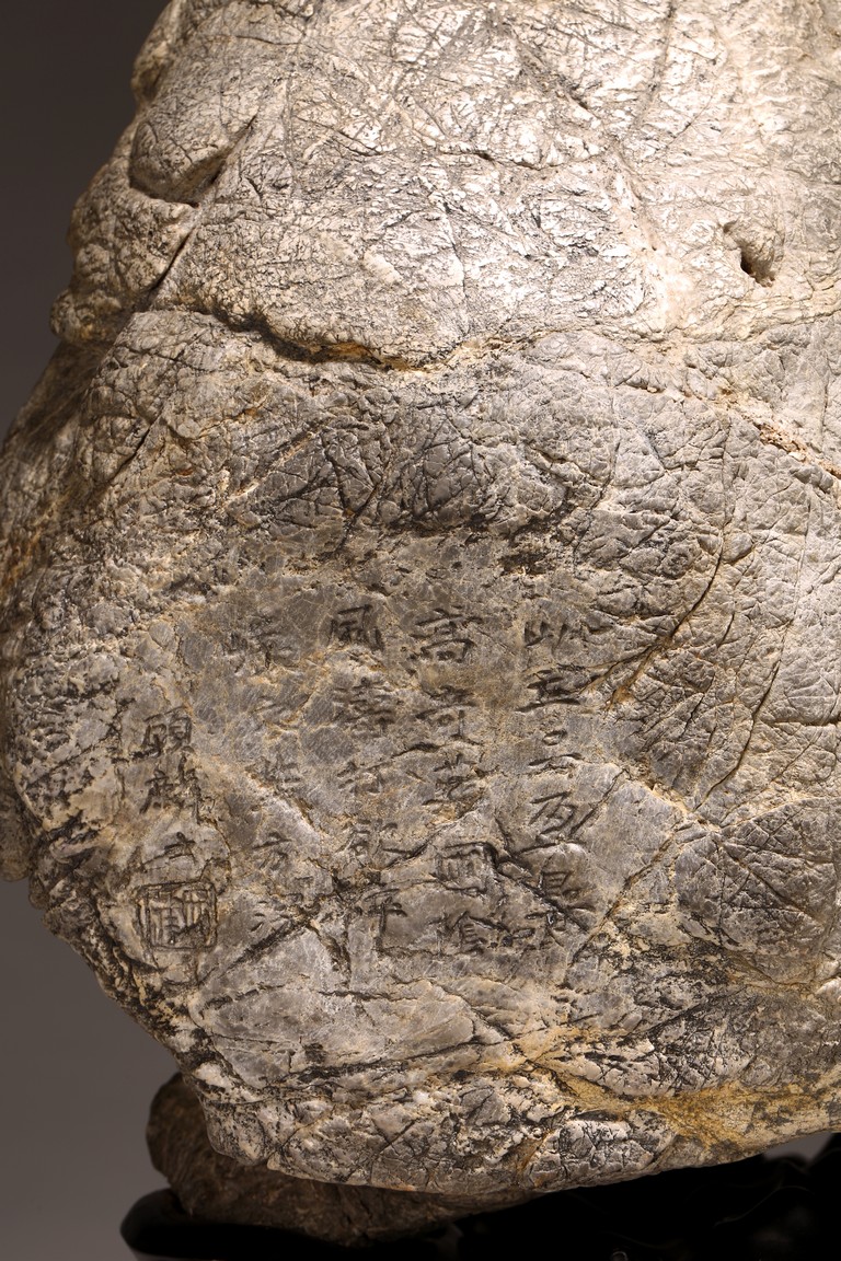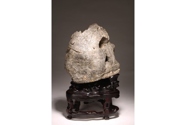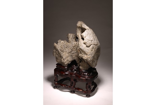 太湖石,又名窟窿石、假山石,是由石灰岩遭到長時間侵蝕後 慢慢形成的,分有水石和幹石兩種。形狀各異,姿態萬千,通靈剔 透的太湖石,最能體現“皺、漏、瘦、透”之美。太湖石擺件爲文 人書齋案頭陳設美物。本器自然隨型而成,質地細膩堅密,石表蒼 潤嶙峋,有明顯的風化剝蝕,石體孔洞嵌空玲珑,連環貫通,有“皺、 漏、瘦、透”之美。帶紅木高腳底座。此石刻詩文並署名顧麟士, 應為清末著名書畫收藏家顧文彬(道光21年進士)之孫所藏. 顧麟士, (1865~1930)名麟士,字鶴逸,諤一,自號西津漁父,別署西津、鶴廬、筠鄰。元和(今江蘇蘇州)人 來源: 洛杉磯重要私人藏家收藏 Provenance: Property from an important private collection, Los Angeles