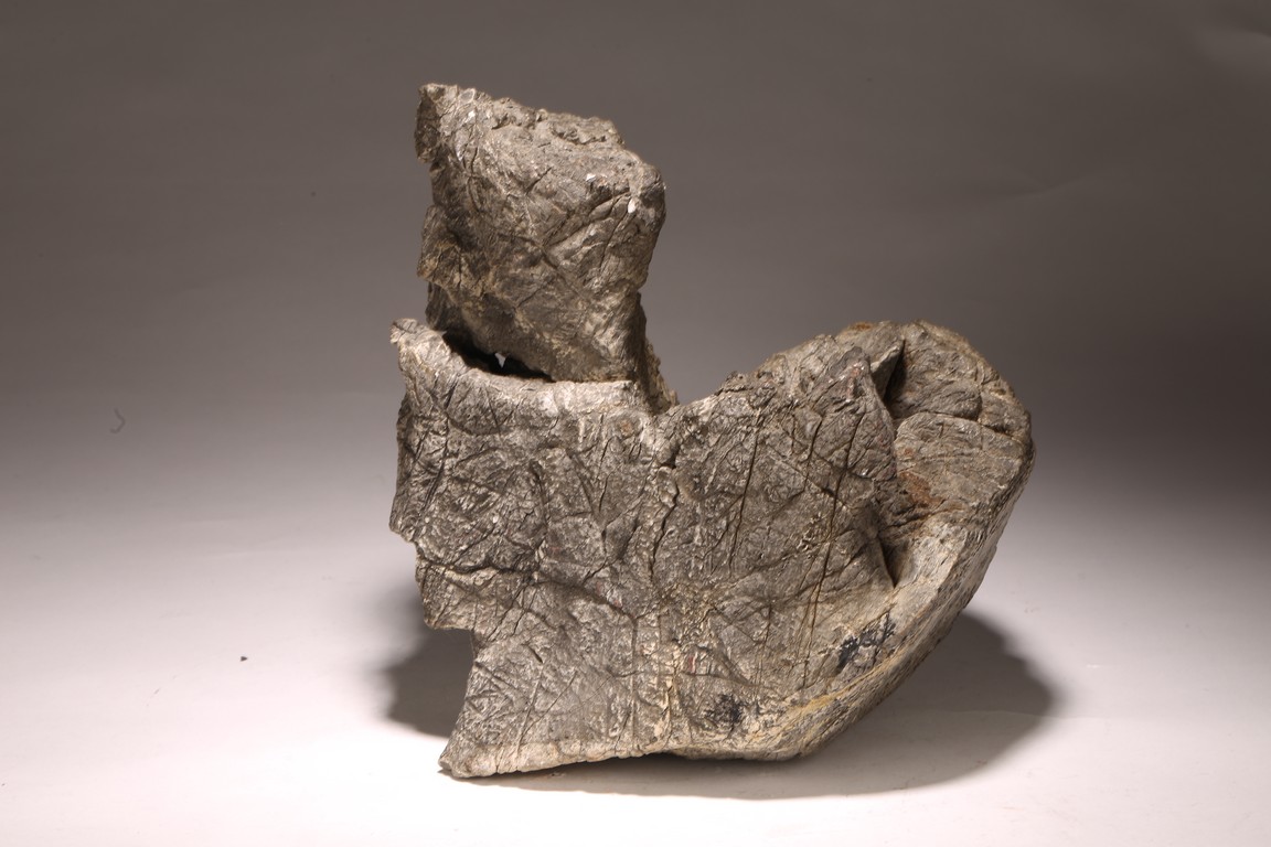Qing Dynasty period. The stone of light grey color of horizontal orientation, with irregular craggy surfaces and openings, inscribed and signed Gu Linshi with seal mark, all supported on a conforming rosewood stand,