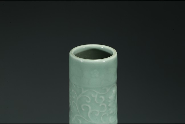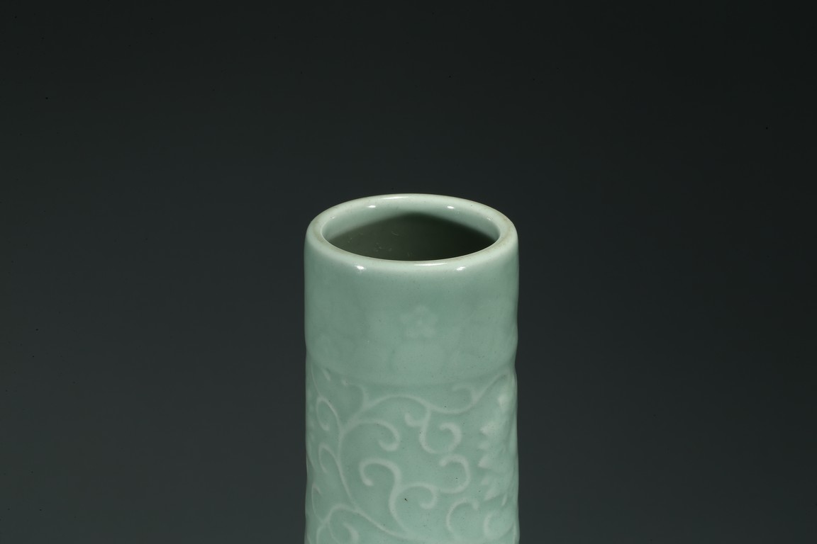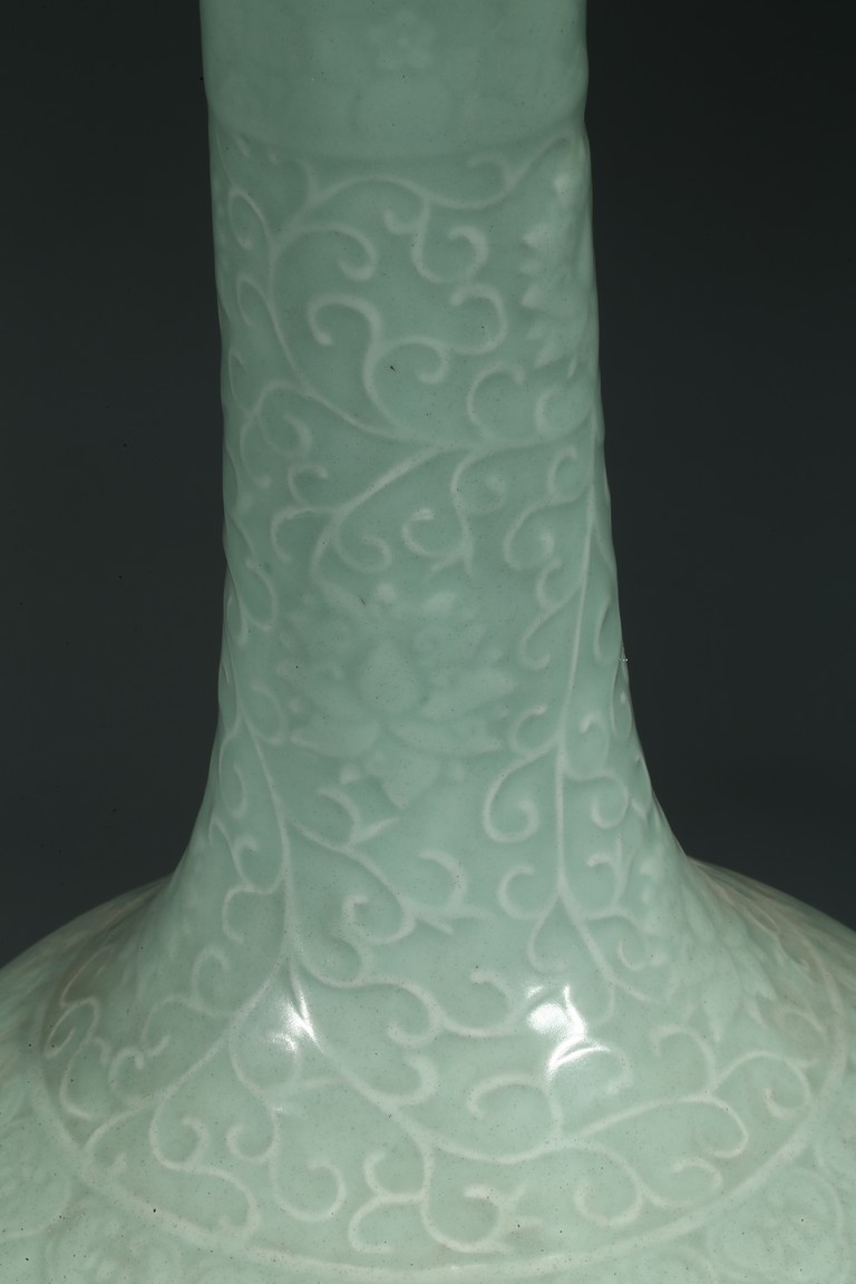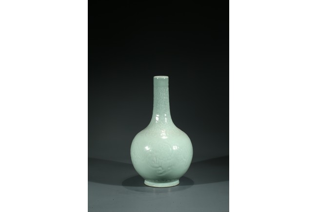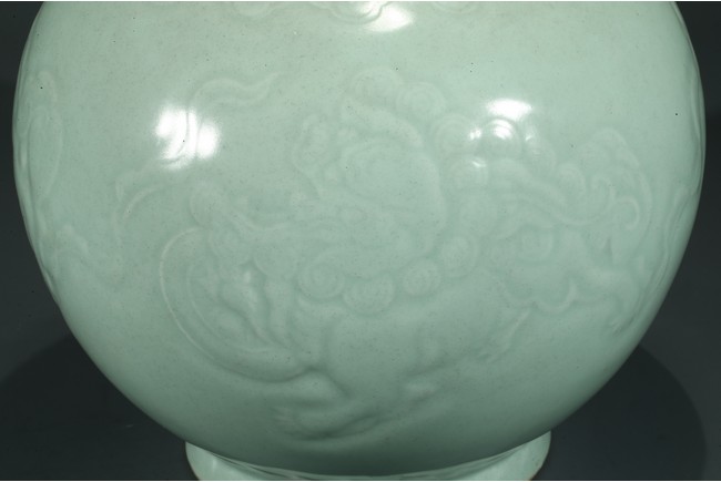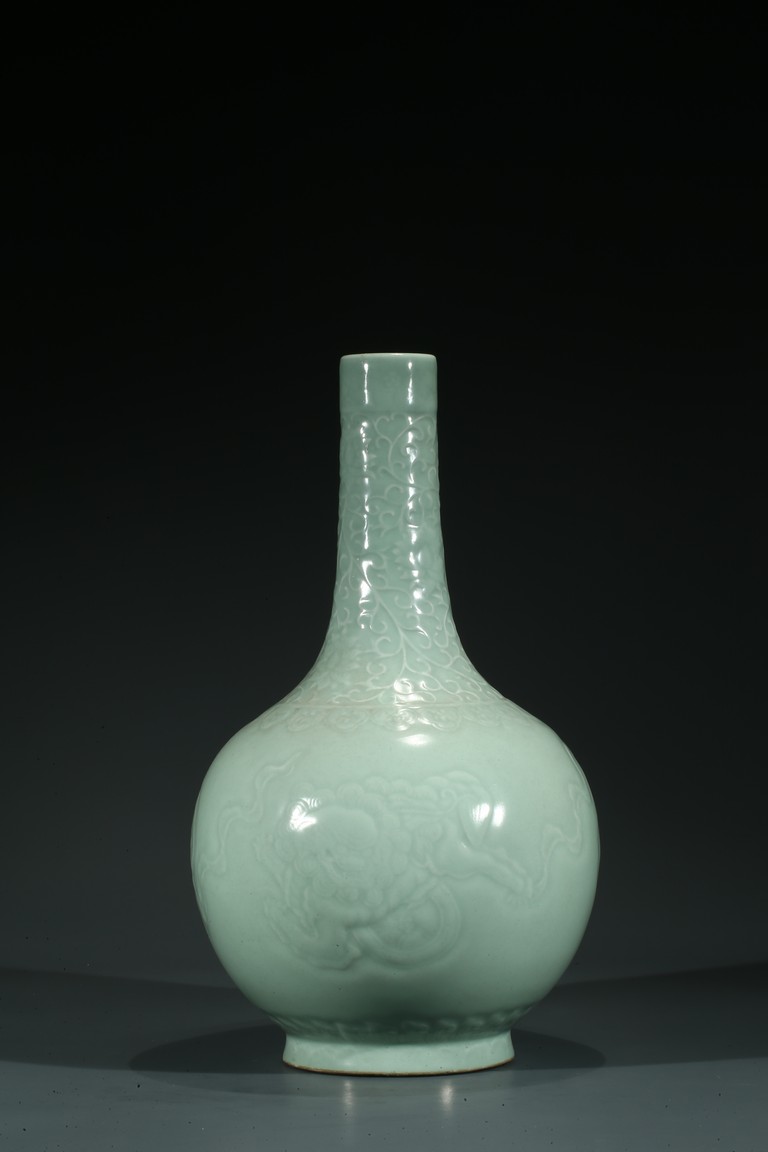 本品長頸,鼓腹,腹部下收,足外撇。通體施青釉,釉色青翠。頸部劃刻纏枝花卉紋,腹部繪雄獅紋,圓眼大睜,鬃發後拂,微微迴首,氣勢凌人的威嚴神態中露出些須憨厚可愛的情趣。整器青釉厚腴溫潤,碧翠怡人。
