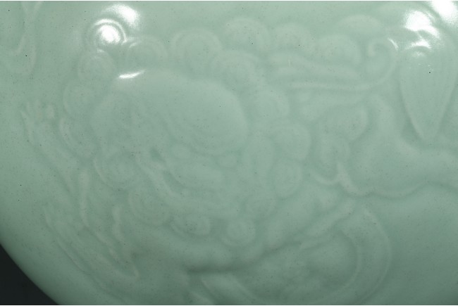 Qing Dynasty period. The globular body applied overall with a translucent celadon glaze decorated with buddhist lions flanked by bands lotus leaves and upright leaves above and below, the neck moulded with meandering lotus scrolls, the base in white glaze.