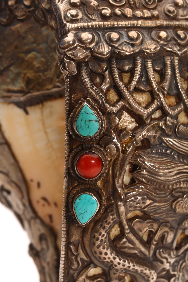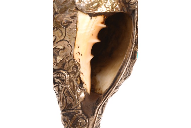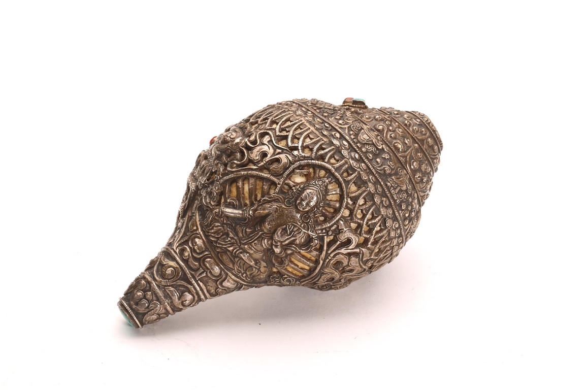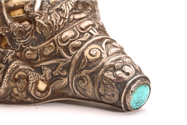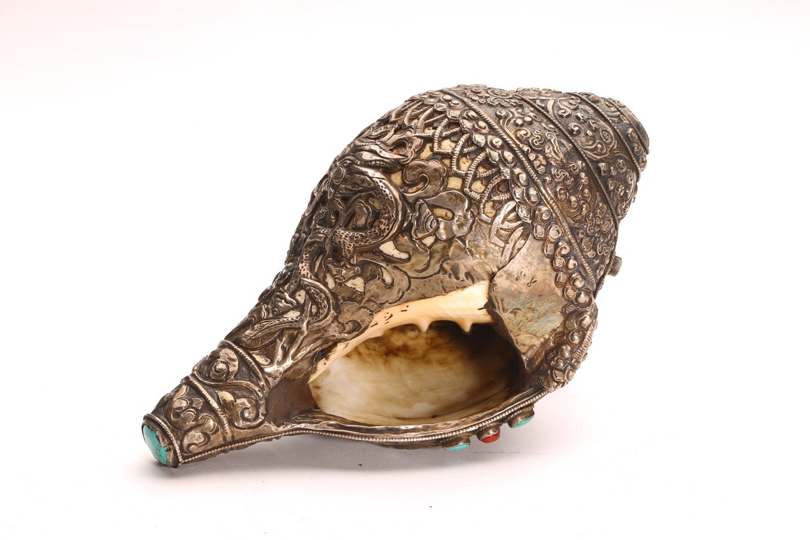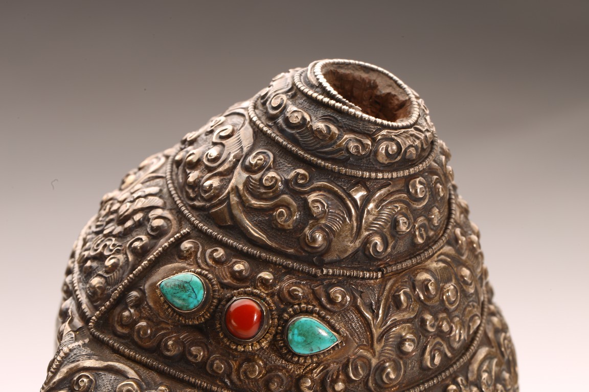 Qing Dynasty period. The exterior of the conch shell covered with silver, the surface decorated with bodhisattva and dragon motifs, inlaid with turquoise and coral beads, with a turquoise finial.