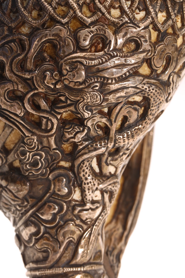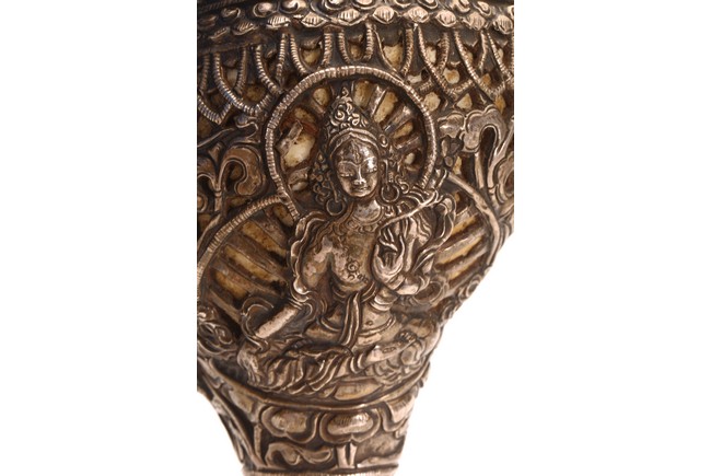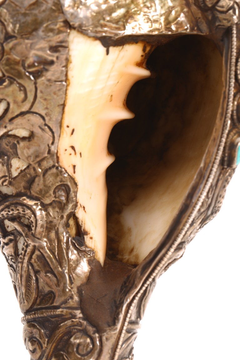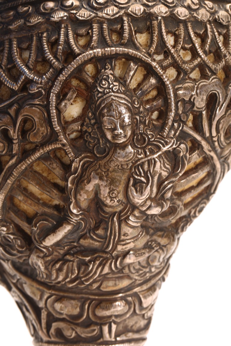 佛陀講經說法時聲音嘹亮,猶如大海螺的聲音響徹四方,在世就以海螺之音代表佛陀 的法音召喚,故稱之爲法螺。本器用銀制而成,上刻“八寶紋”“卷草紋”“白度母像”,整 器紋飾精美,工藝精湛。 來源: 洛杉磯資深私人藏家舊藏 Provenance: From an important Los Angeles Private collection