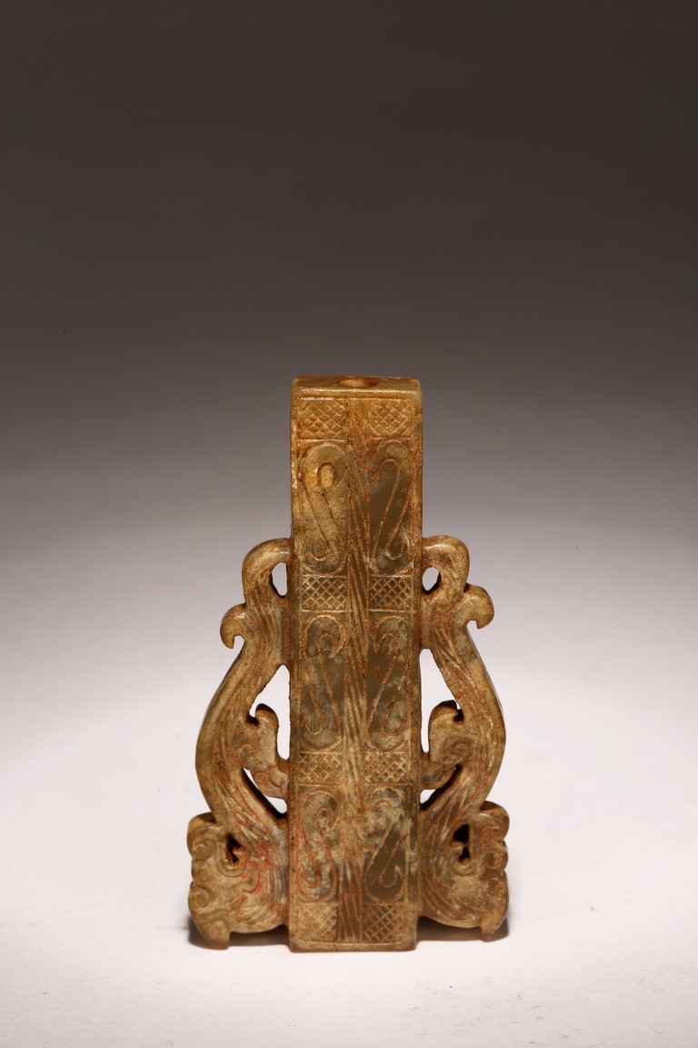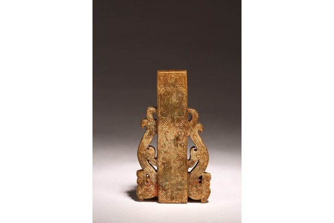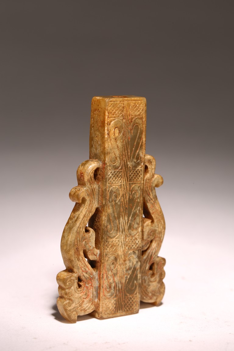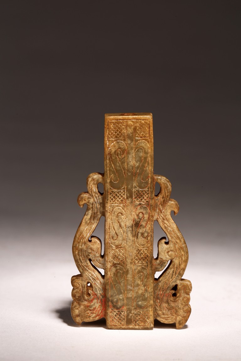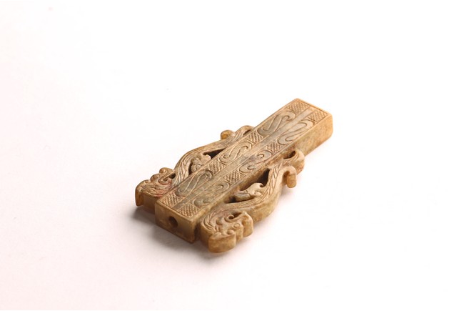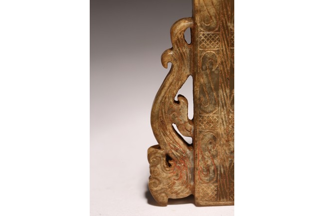 Warring State Period. Of rectangular form, symmetrically carved with two bands of geometric S pattern, flanked by pair of stylized dragon handles on both sides, with holes on both ends.