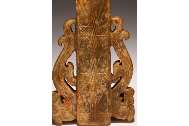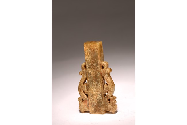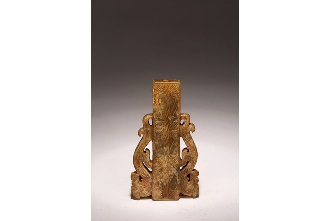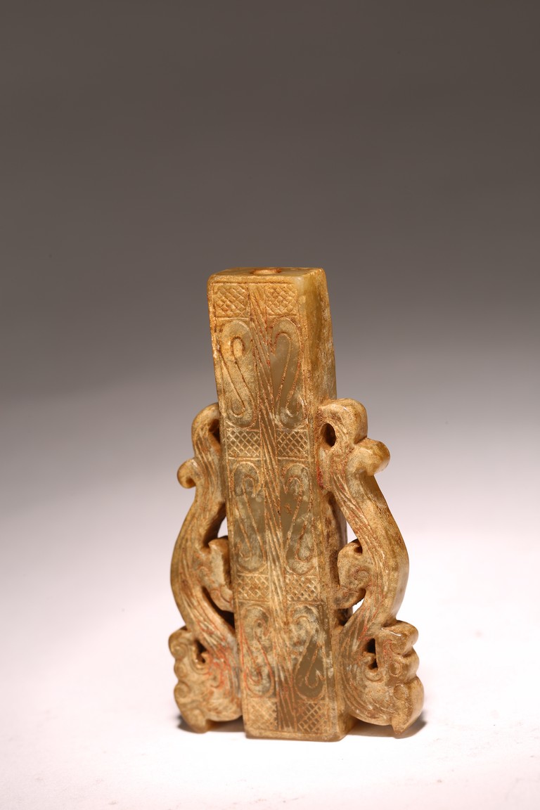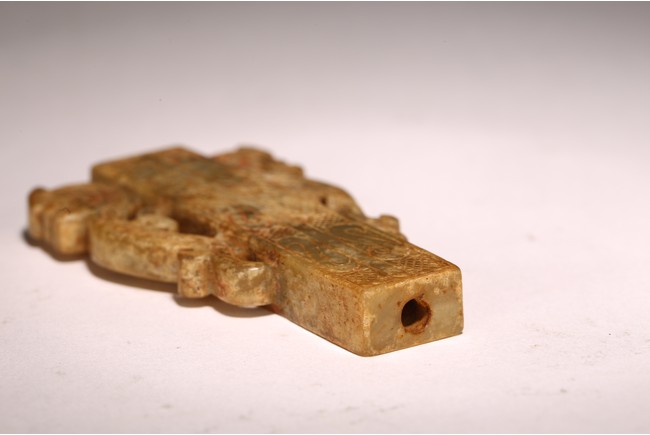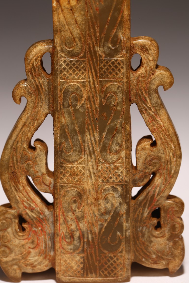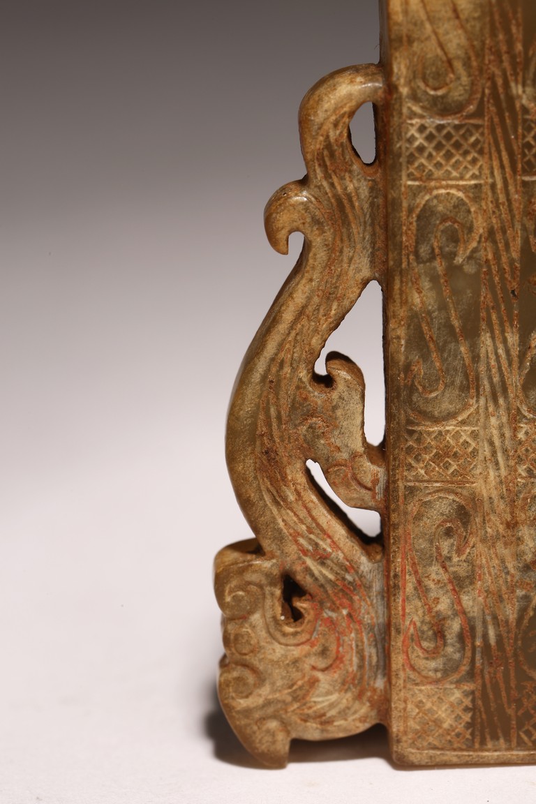 Warring State Period. Of rectangular form, symmetrically carved with two bands of geometric S pattern, flanked by pair of stylized dragon handles on both sides, with holes on both ends.