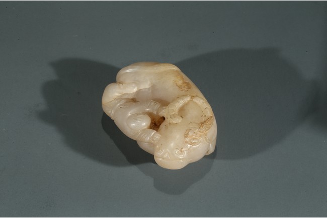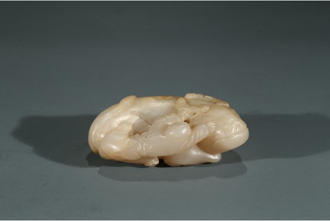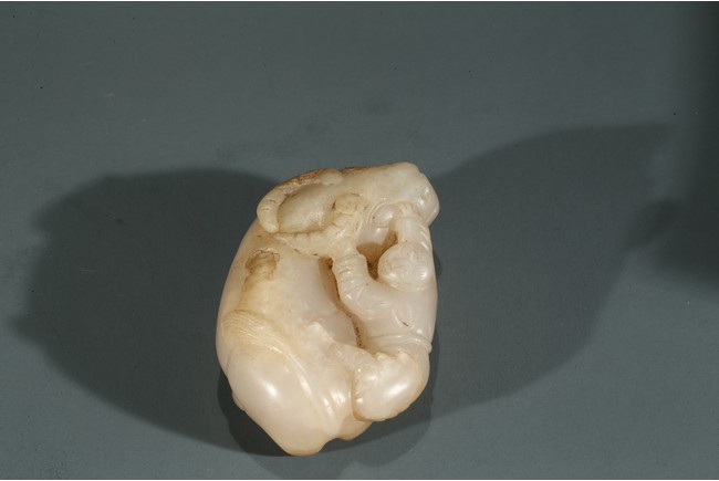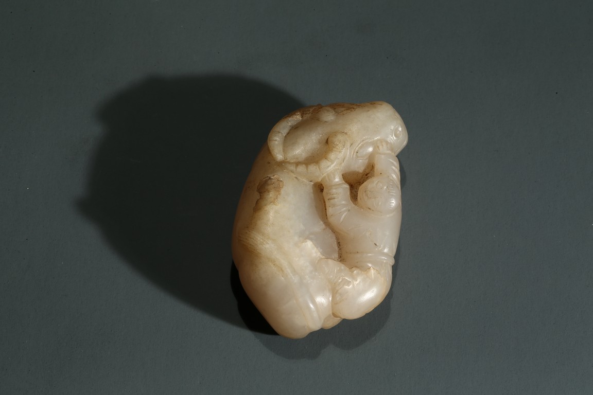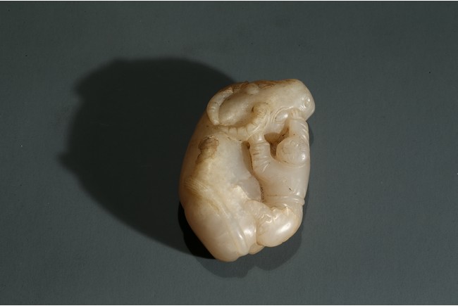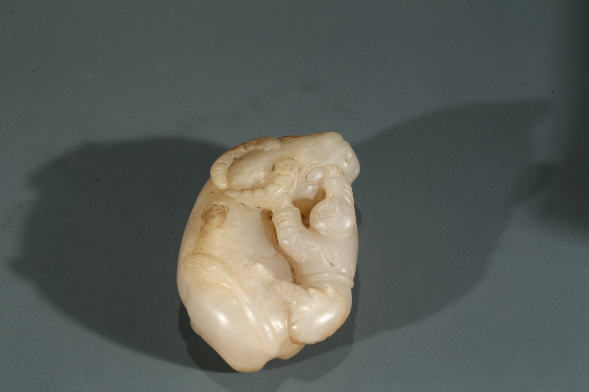 Carved in the form of boy playfully clambering on a buffalo.