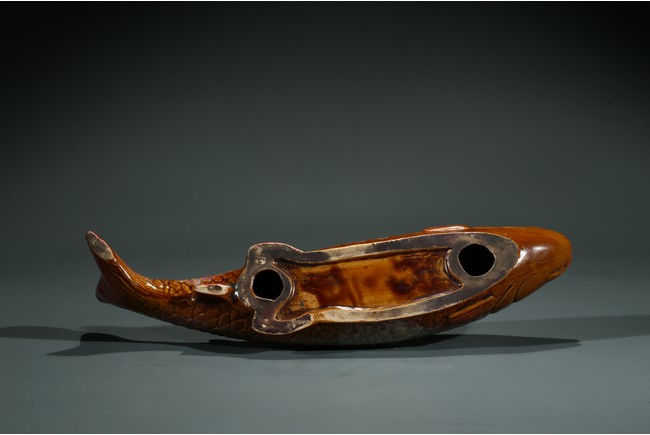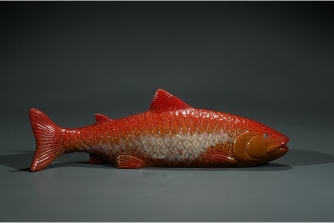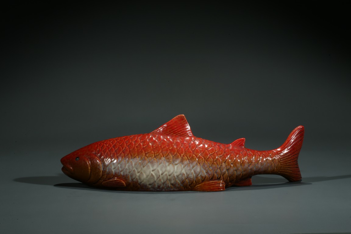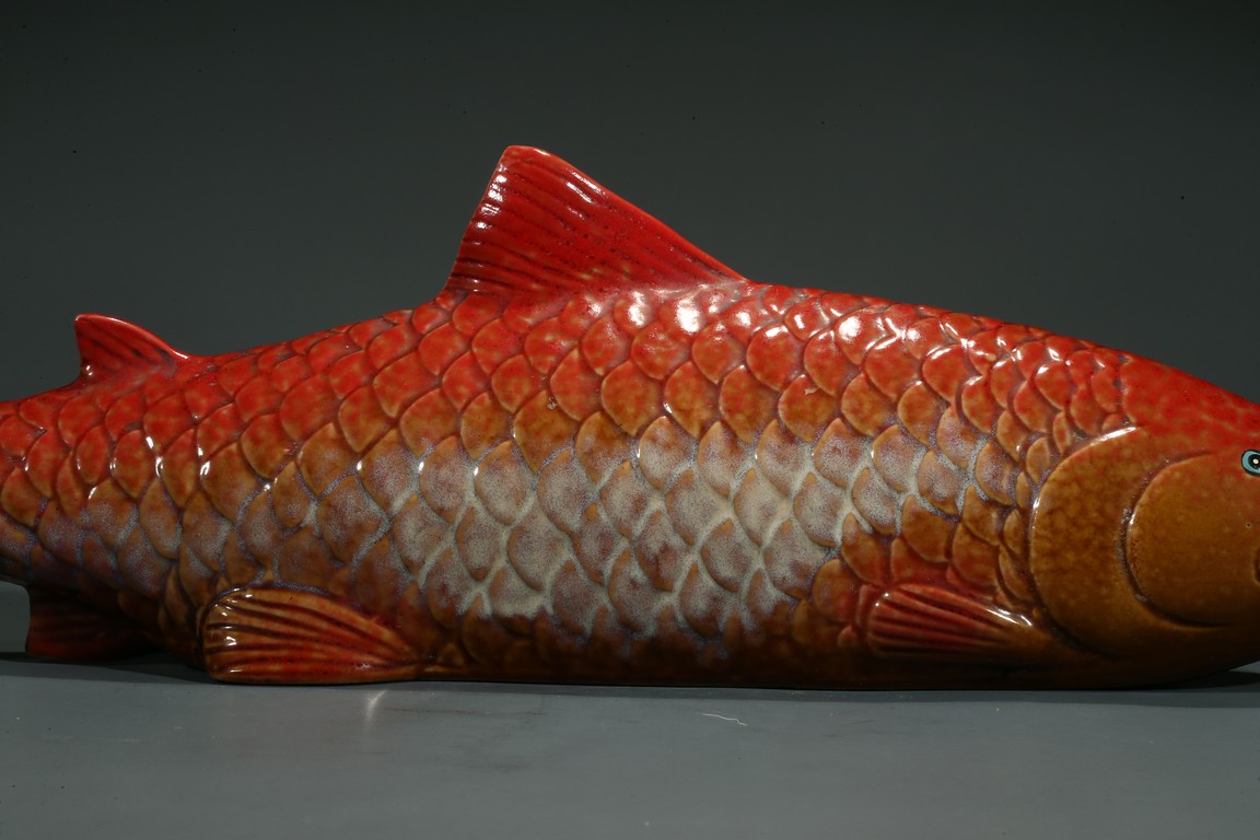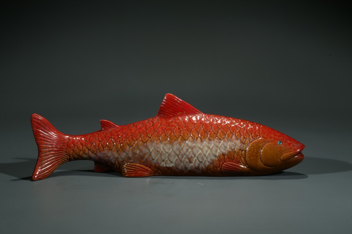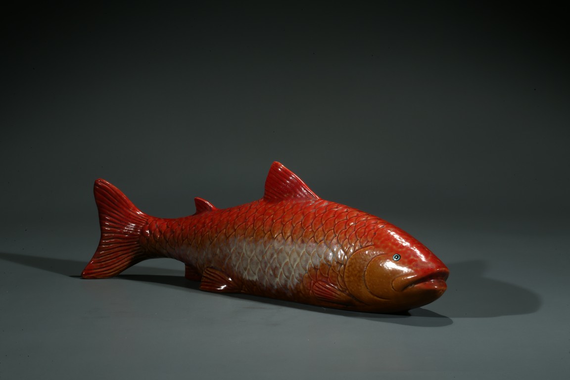 魚在清代為十分喜愛的紋飾,因其“魚”同“餘”的諧音相近,又寓意“年年有餘”之意十分討巧。以鯉魚為造型,造型逼真生動,魚的雙鰭與魚尾構成飾件的三個支點,魚嘴微張,魚鰓鼓動,魚鱗刻畫細緻,這一系列的形象完美地詮釋了鯉魚從水中沖躍而出的動感與力量。通體滿飾紅釉,色彩絢麗,紅豔鮮明,釉汁肥厚。