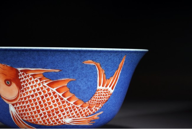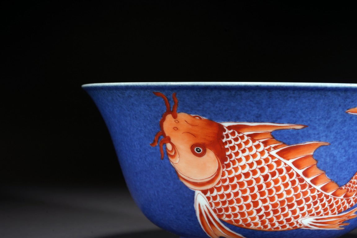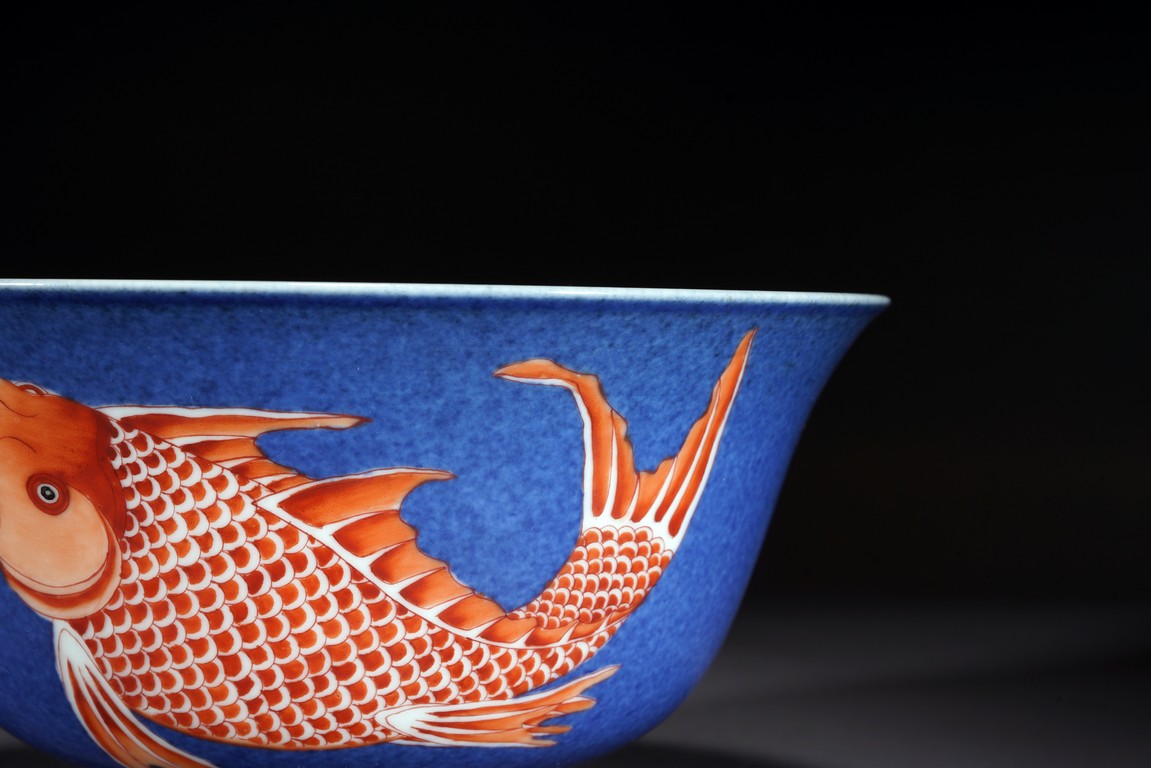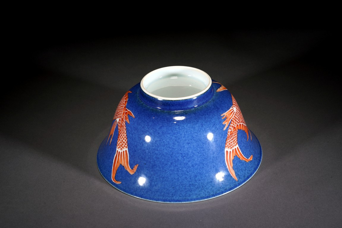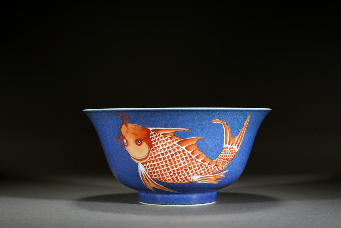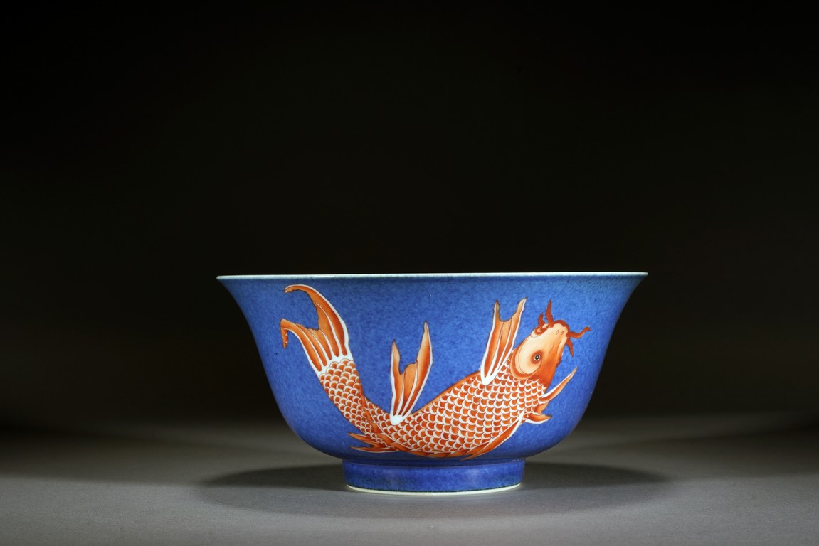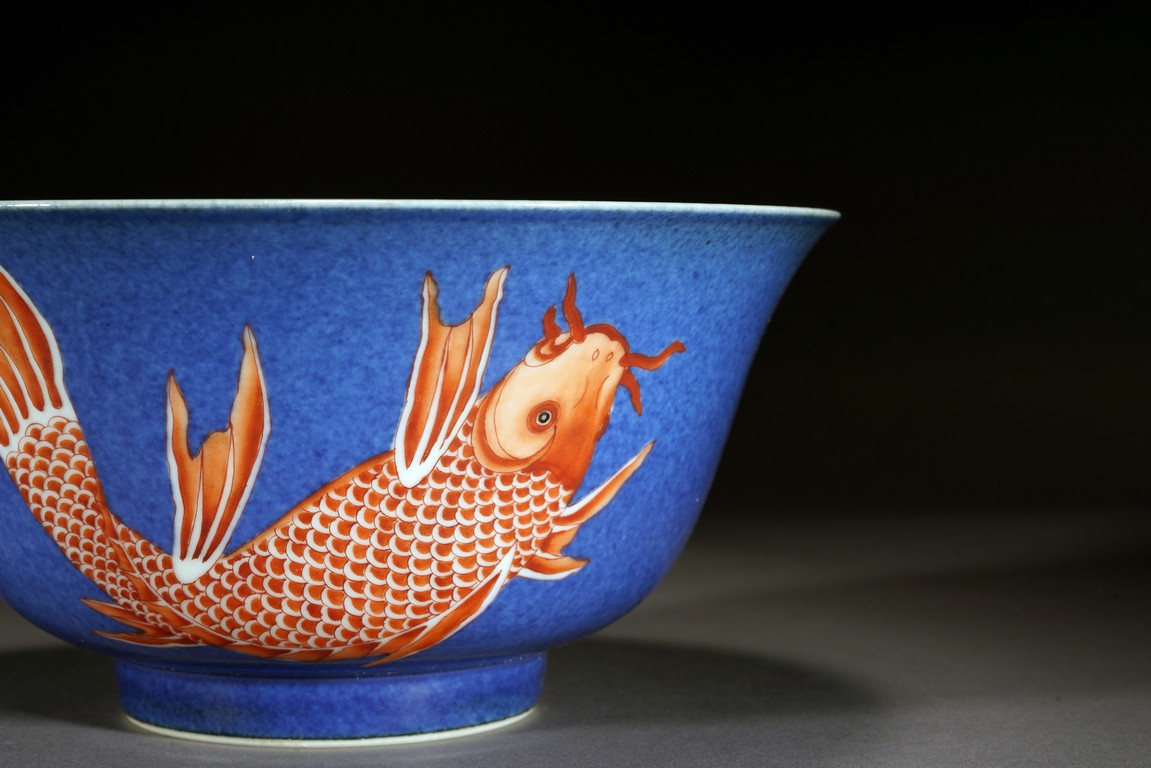 Qing Dynasty period. Elegantly potted with deep rounded sides rising from a slightly tapered foot to a gently flared rim, the body decorated with carp fish in iron red reserved on blue glazed ground.