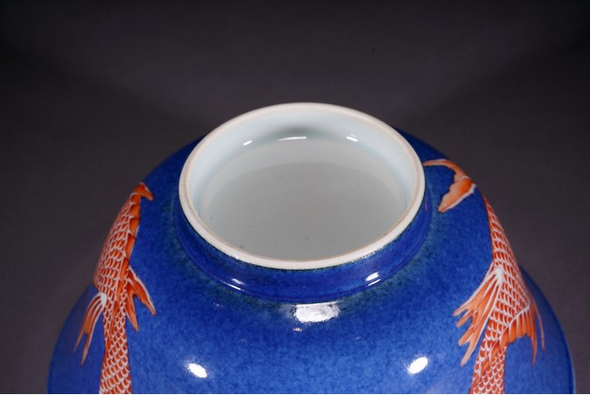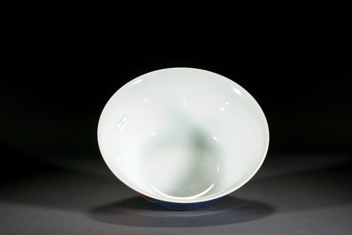 此碗敞口微侈,弧腹,圈足。外灑藍工藝,釉水溫潤,礬紅繪魚紋紋飾,寓意吉祥,造型端莊俊美。