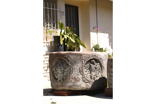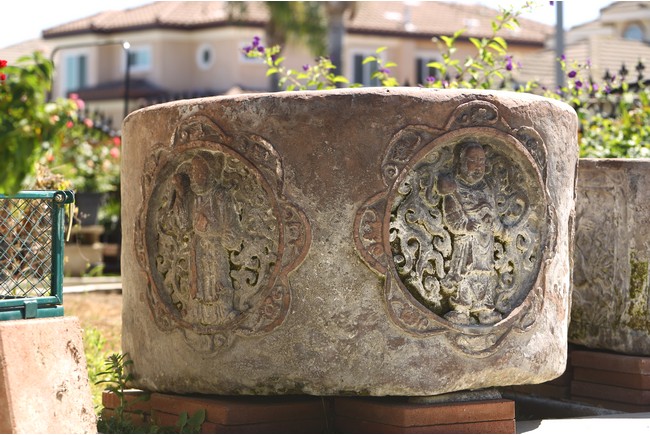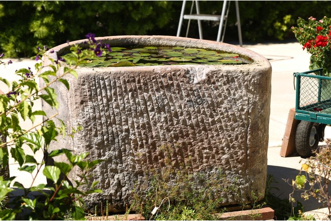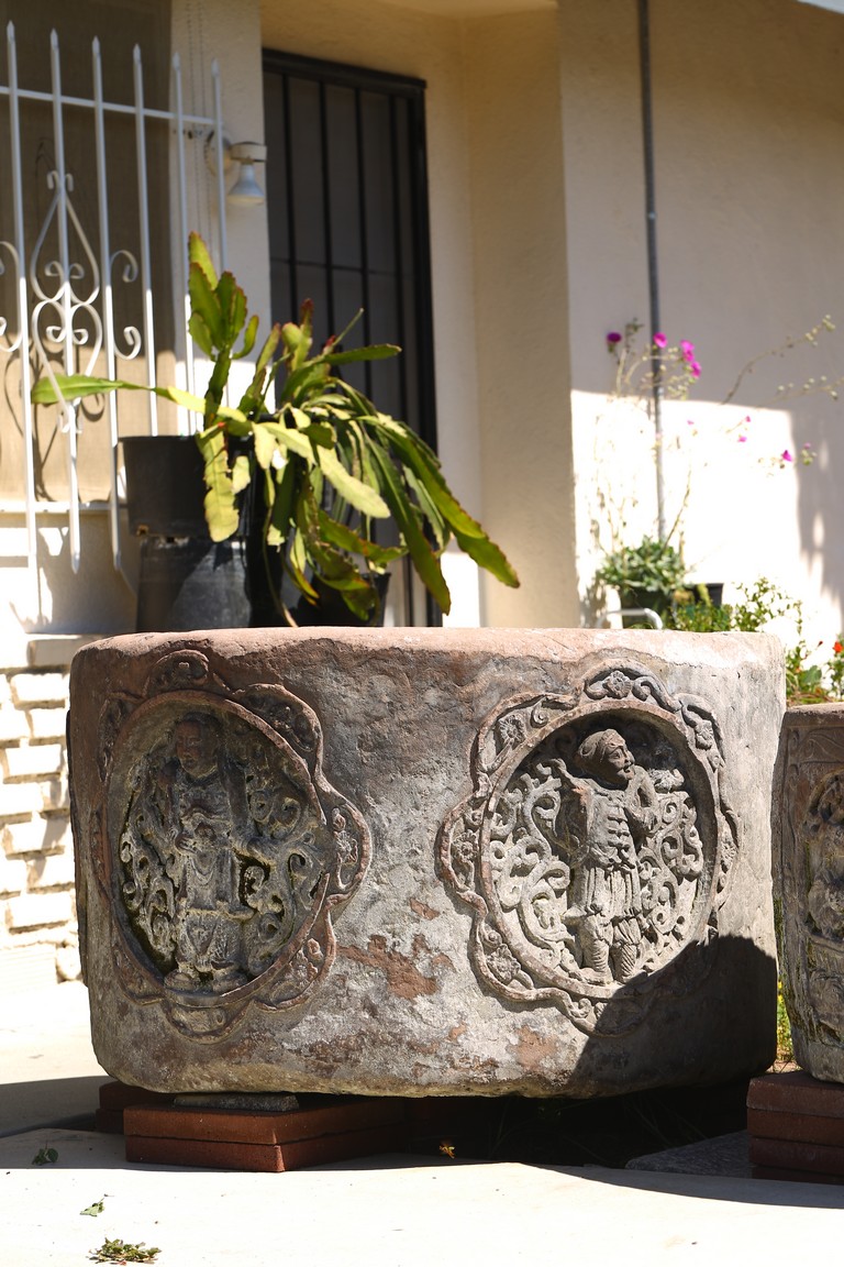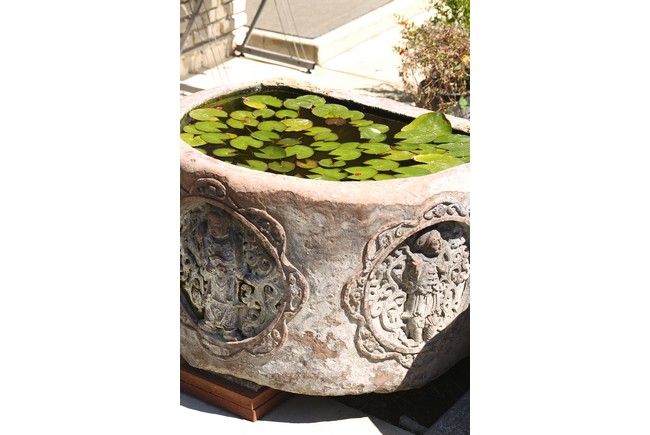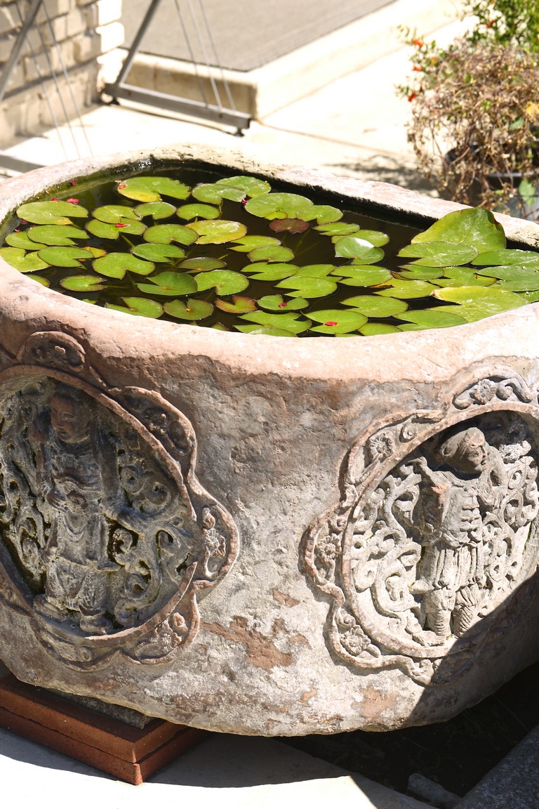 此人物石水缸過去主要用於儲水,如遇火災就近取水,平時缸裏載種荷花並養觀賞魚,此缸體型碩大,石質缸體,內掏膛規矩,四周開窗刻人物,內容豐富,人物刻畫生動,形態各異,適合庭院擺設極其優雅。