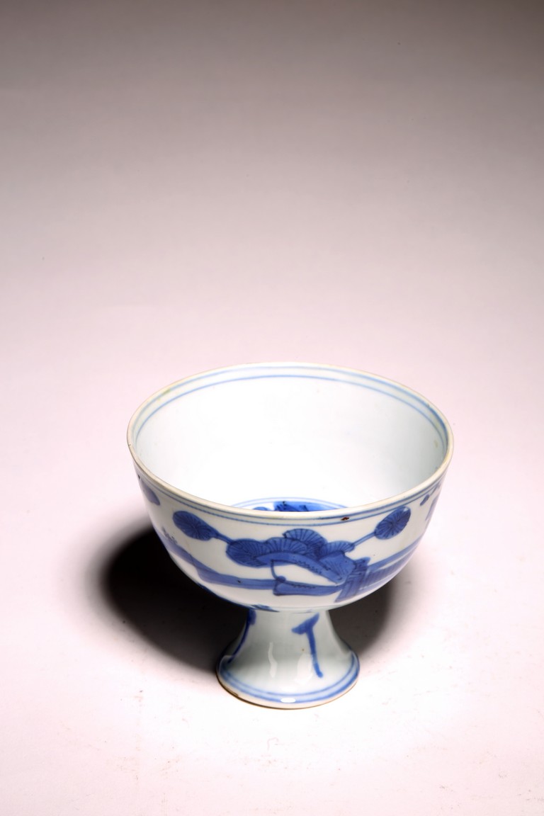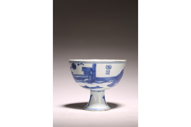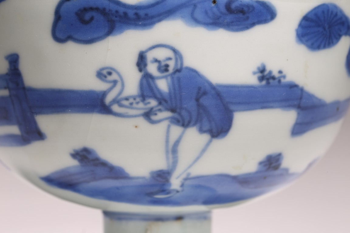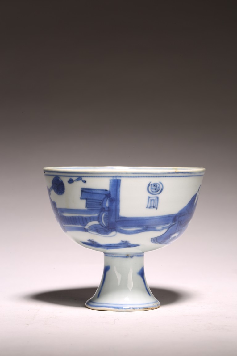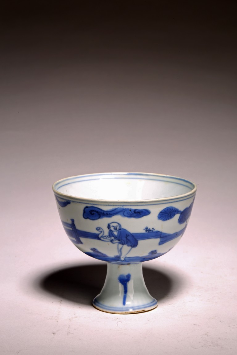 敞口,深腹,高足外撇,器身青花繪“羲之愛鵝”紋樣,此紋樣被當作文人雅士情趣 生活的體現,是文人雅事、陶冶情操。整體青花發色明麗,胎質堅實,釉色潔白細膩, 畫工精細。 來源:洛杉磯重要私人收藏 Provenance: Important Private collection, Los Angeles