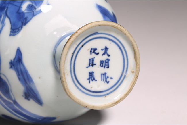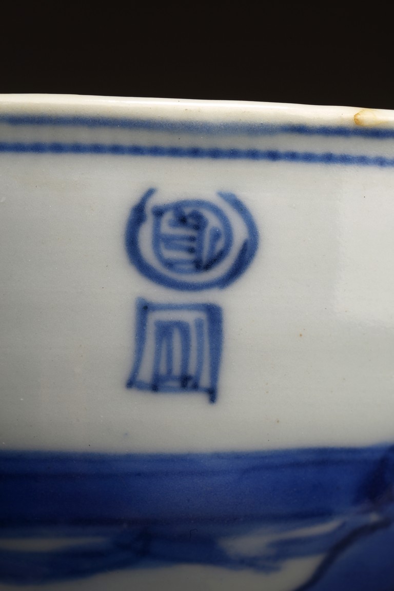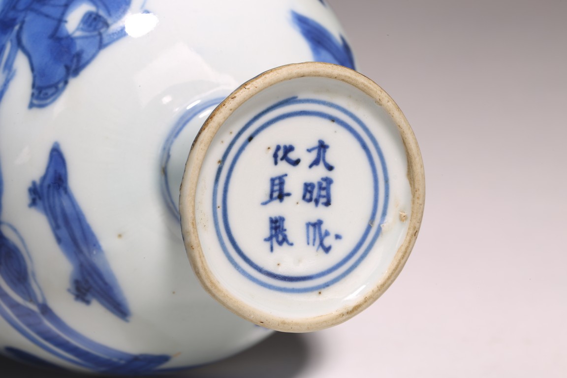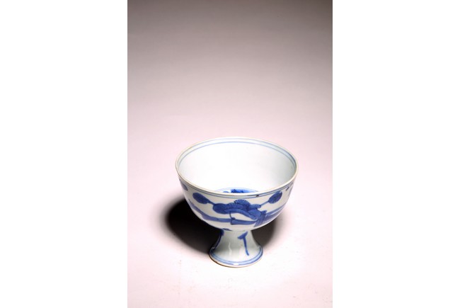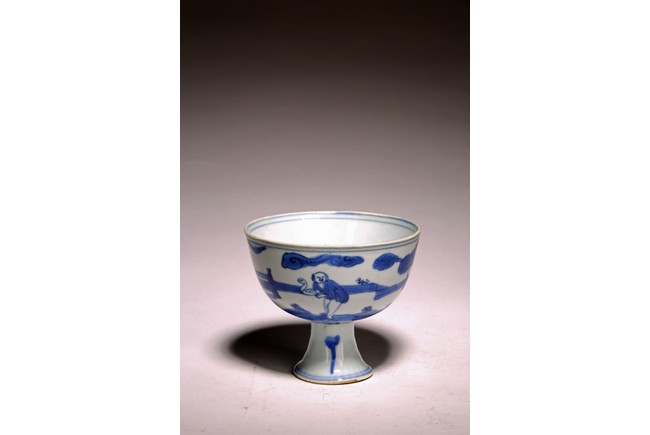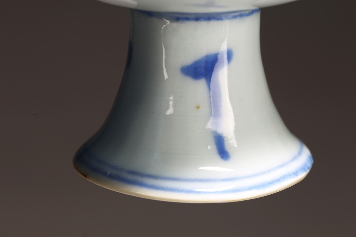 敞口,深腹,高足外撇,器身青花繪“羲之愛鵝”紋樣,此紋樣被當作文人雅士情趣 生活的體現,是文人雅事、陶冶情操。整體青花發色明麗,胎質堅實,釉色潔白細膩, 畫工精細。 來源:洛杉磯重要私人收藏 Provenance: Important Private collection, Los Angeles