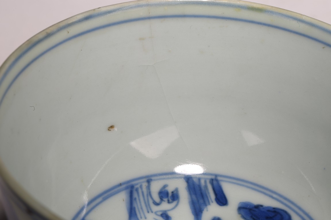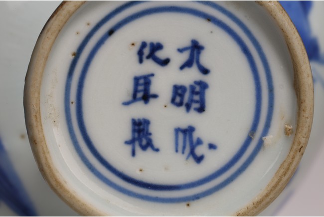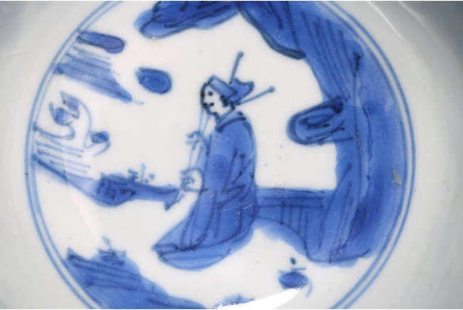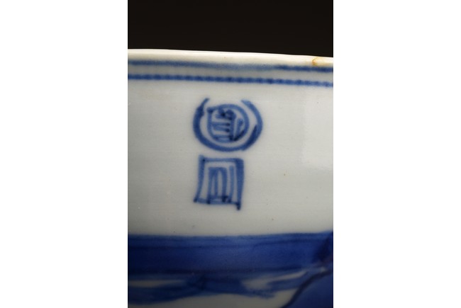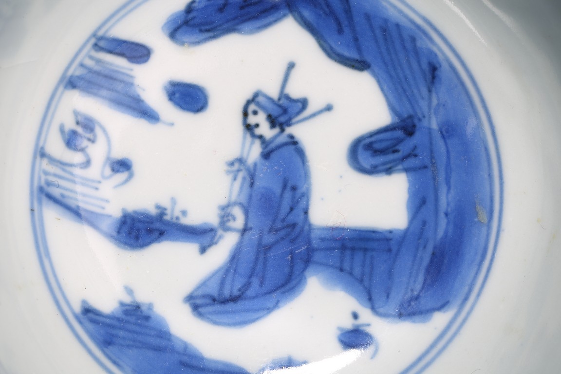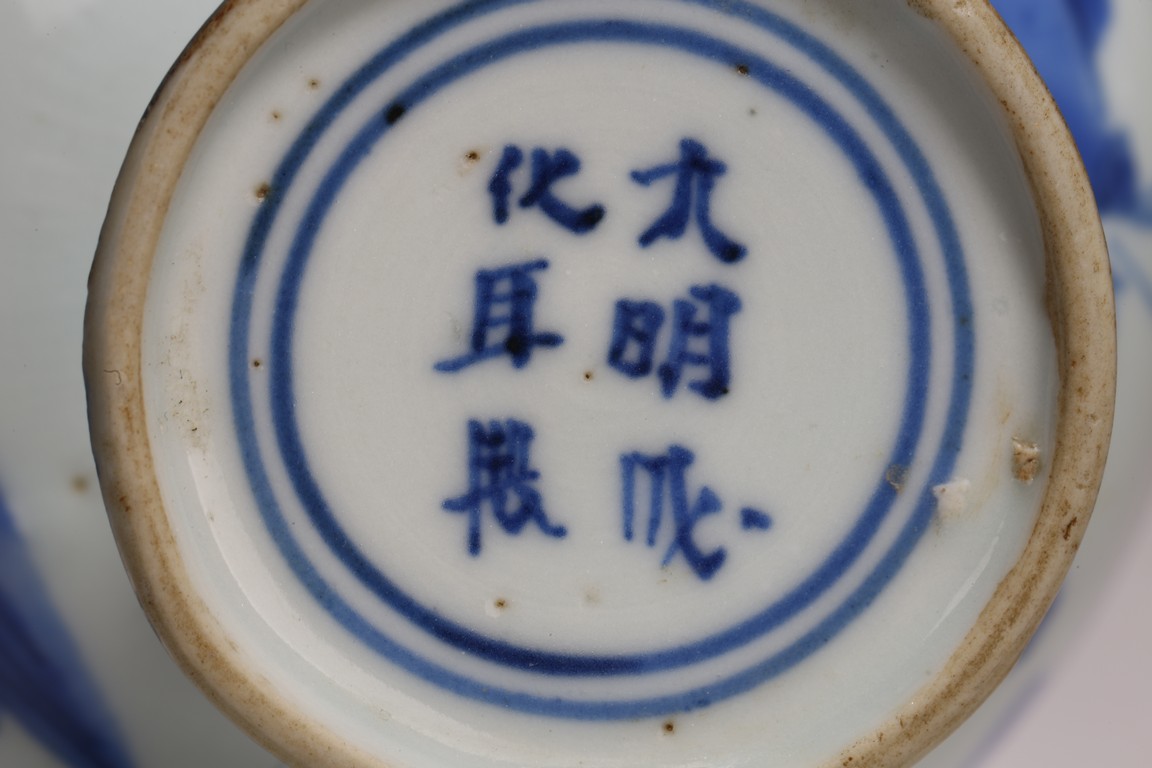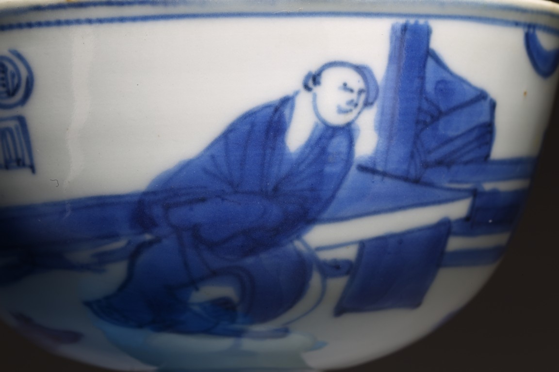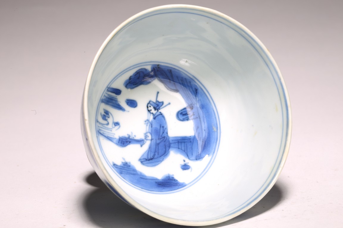Ming Dynasty period. The U-shaped body rising to a flared rim, supported on splayed stem foot, freely painted to the exterior with figural scenes and two 'seal marks', the interior decorated with a seated scholar, the base inscribed with six character Ming reign mark.