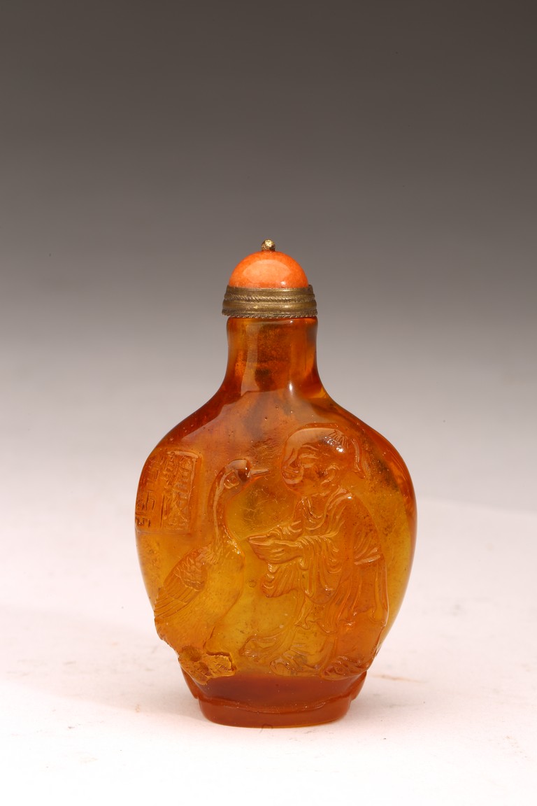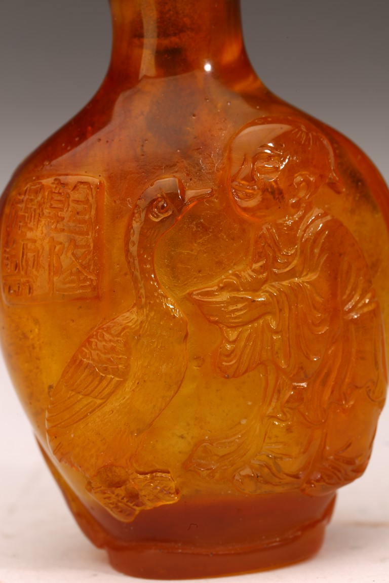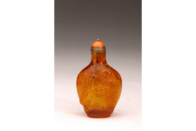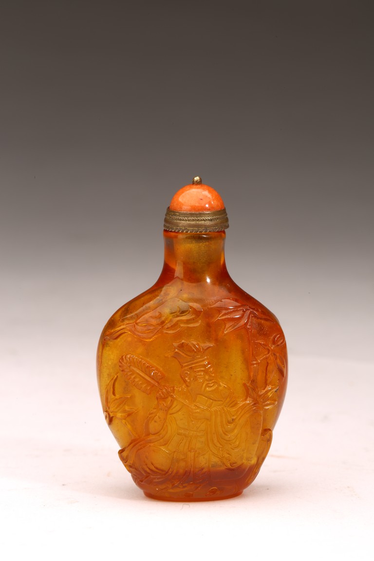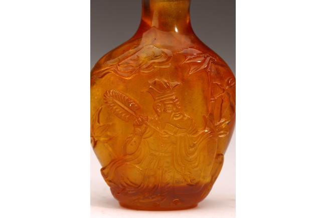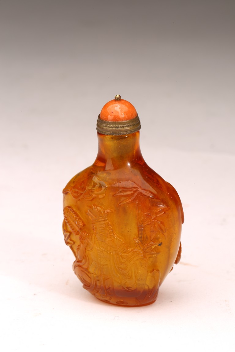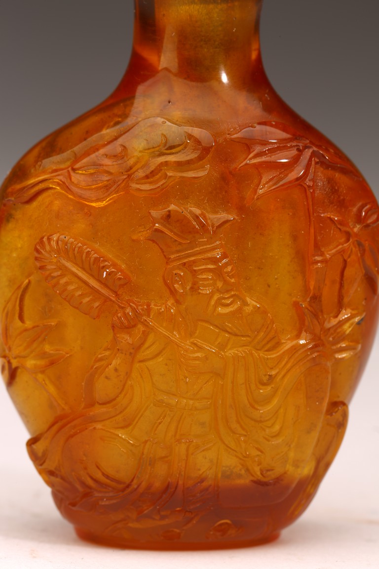 Qing Dynasty period. The snuff bottle finely carved in relief with figures on both front and back, the amber of translucent golden caramel tone, with stopper.