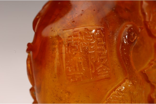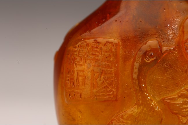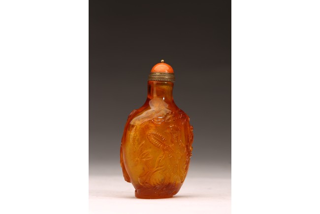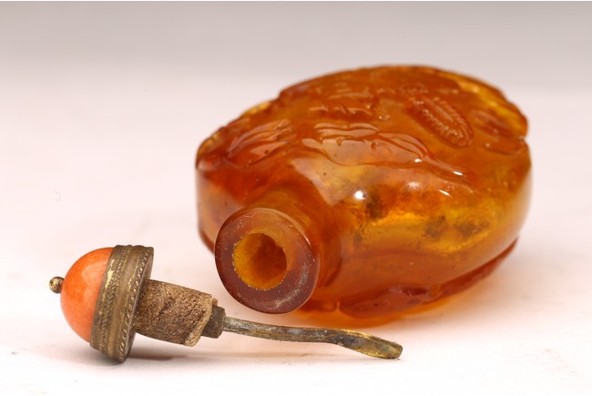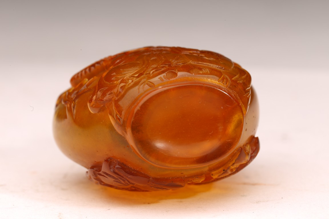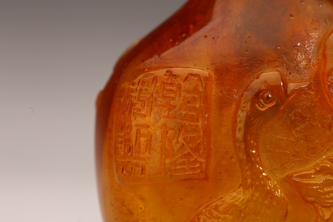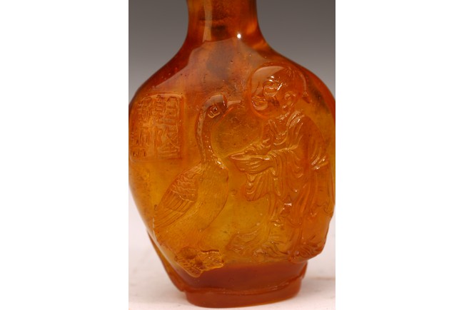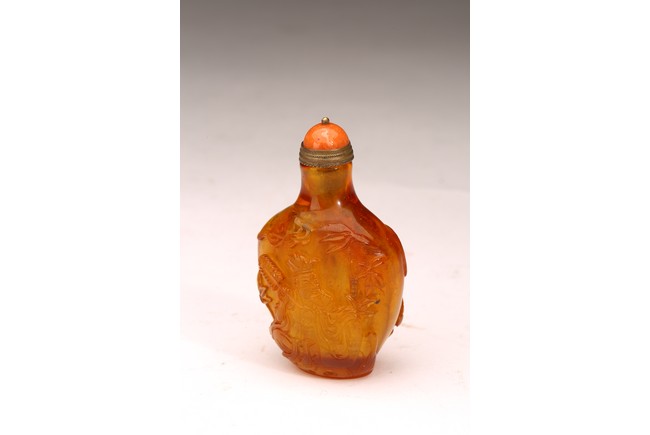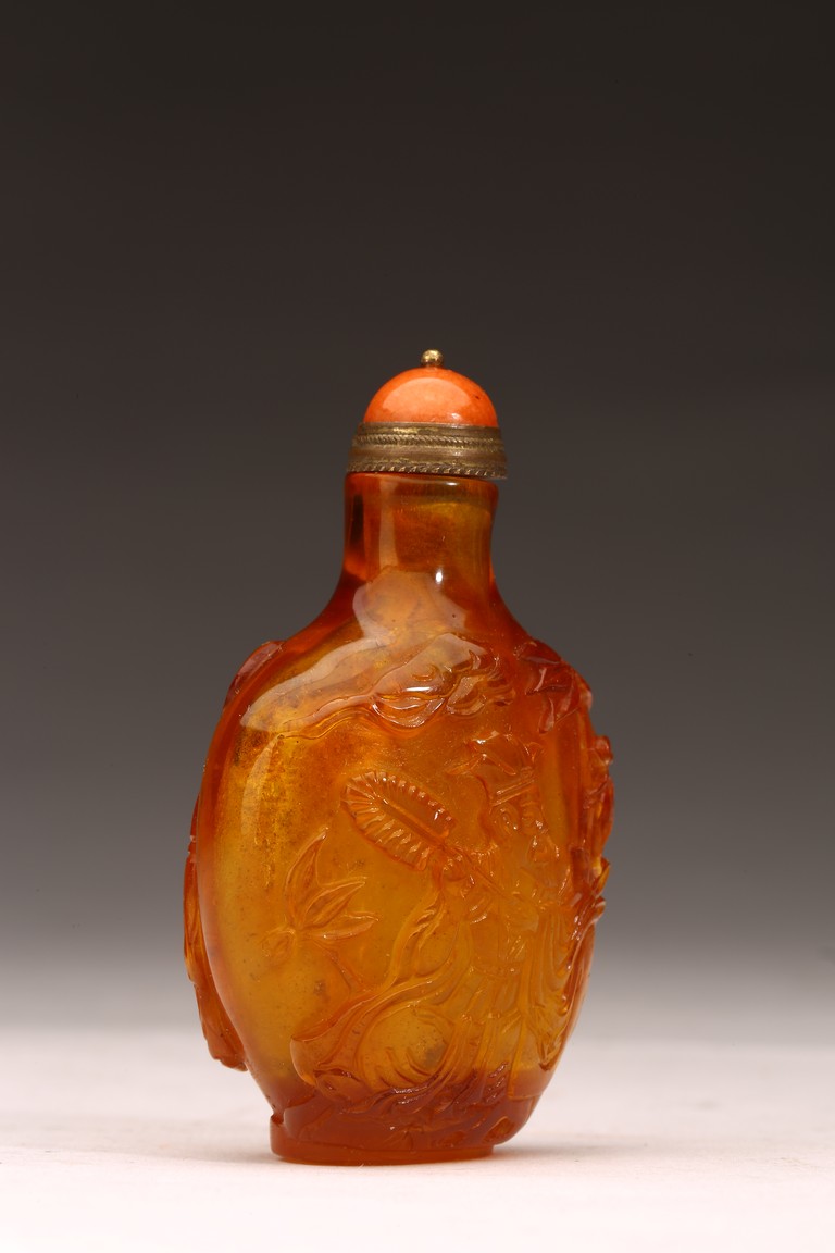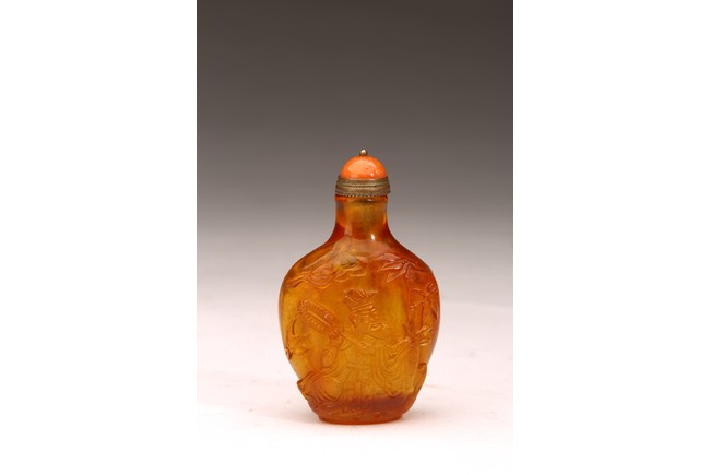 Qing Dynasty period. The snuff bottle finely carved in relief with figures on both front and back, the amber of translucent golden caramel tone, with stopper.