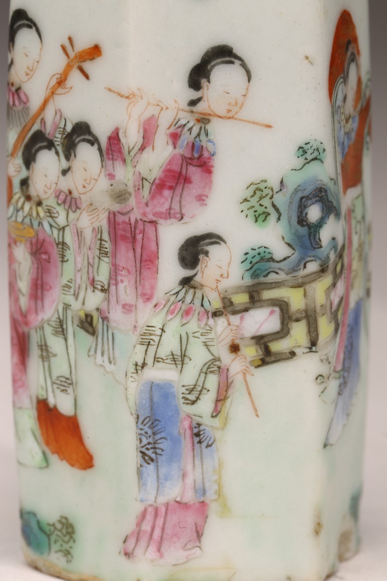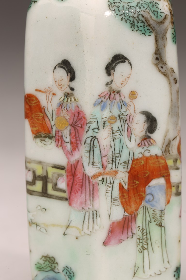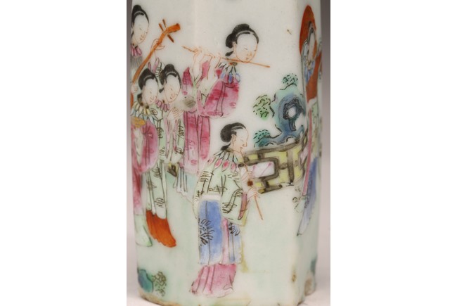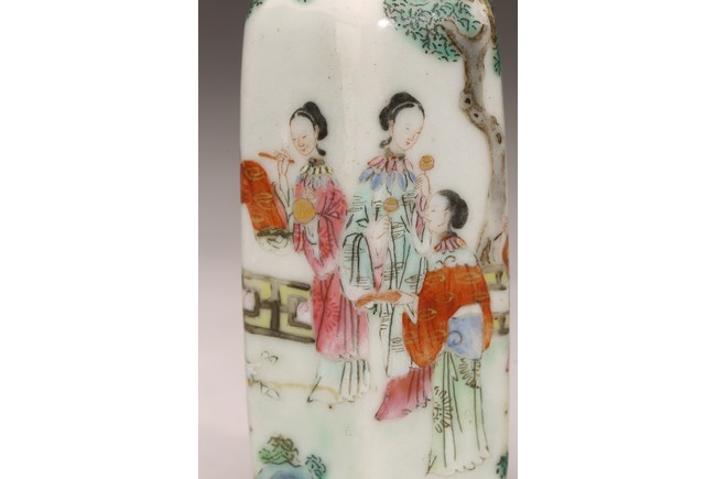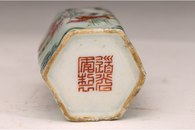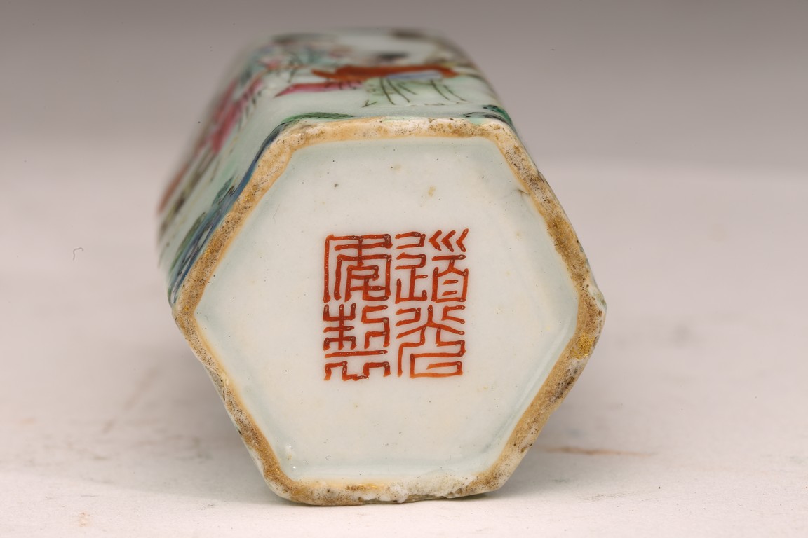 直頸,器呈六邊形,器身粉彩繪仕女人物,仕女面容安詳,身著長衣長裙,腰間系帶,頭 頂雲鬢,身段優雅,端莊清秀,整體色彩濃艷,筆觸細膩,繪畫技藝嫻熟流暢 ,“道光年製” 款識。 來源:南加州Costa Mesa市私人收藏 Provenance: Private collection, Costa Mesa, California