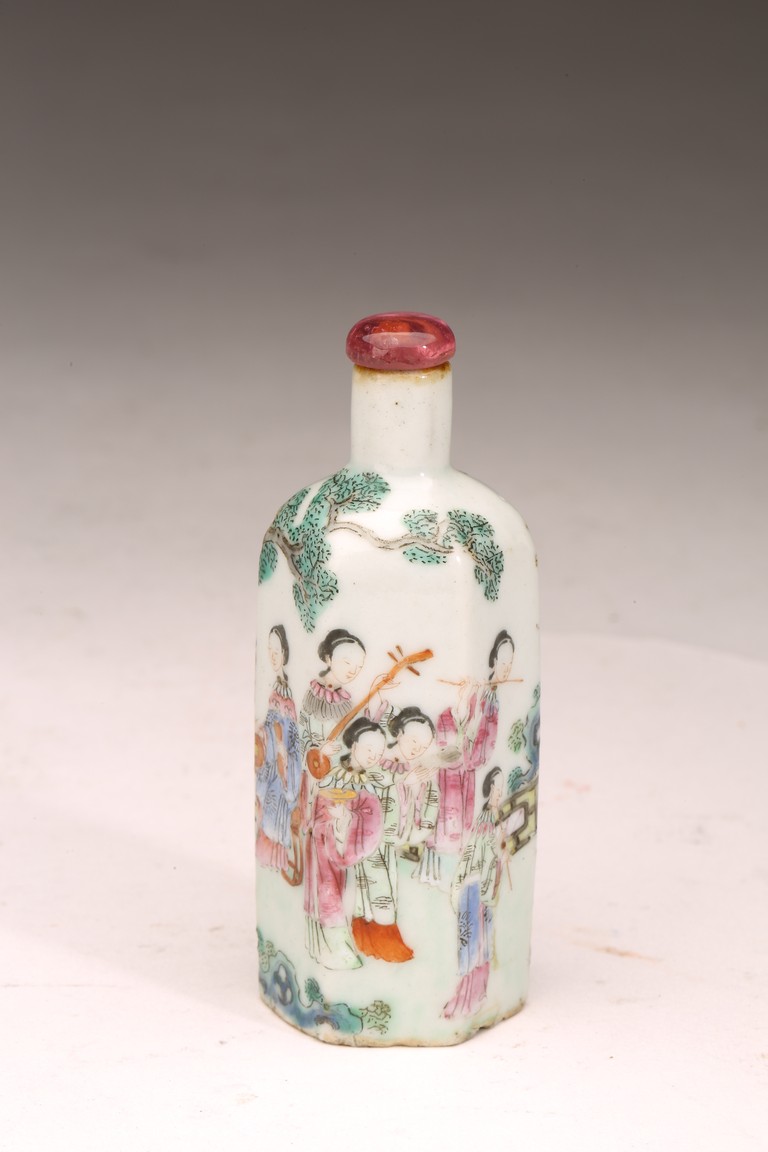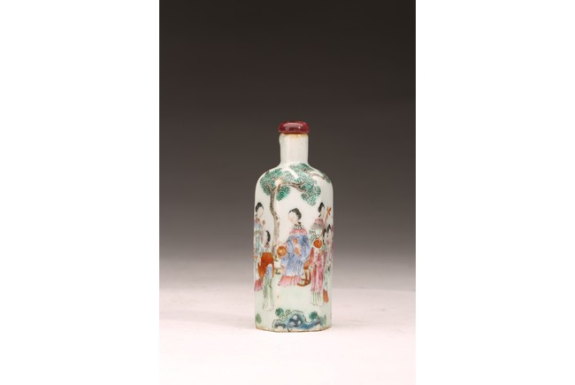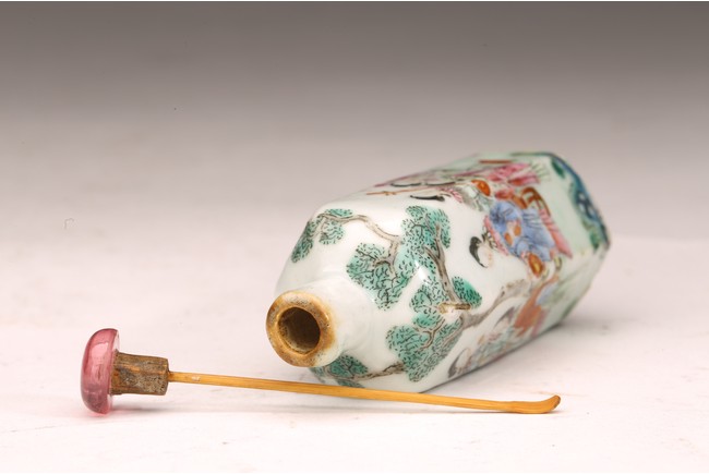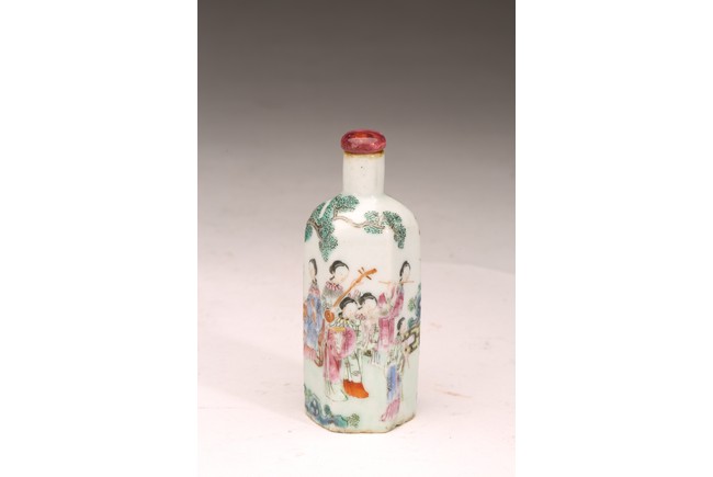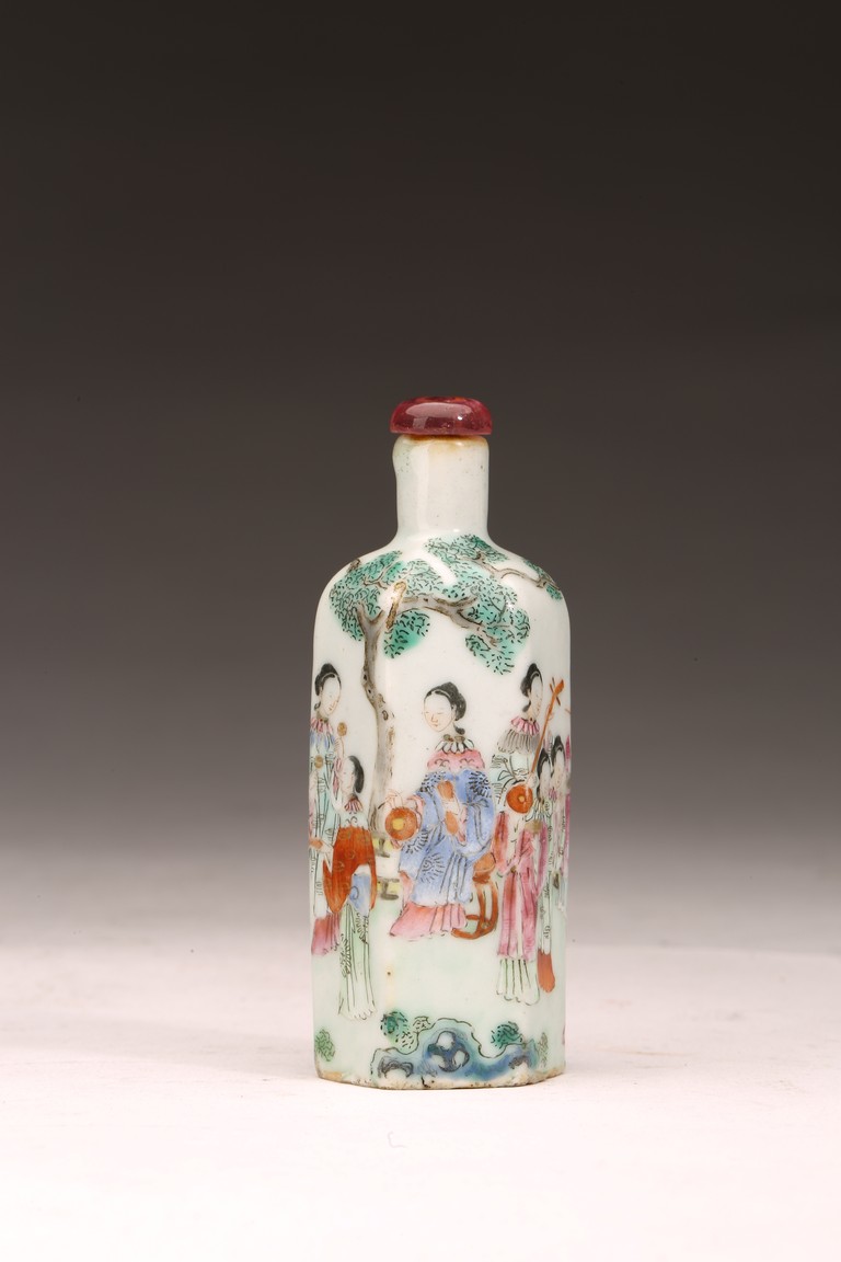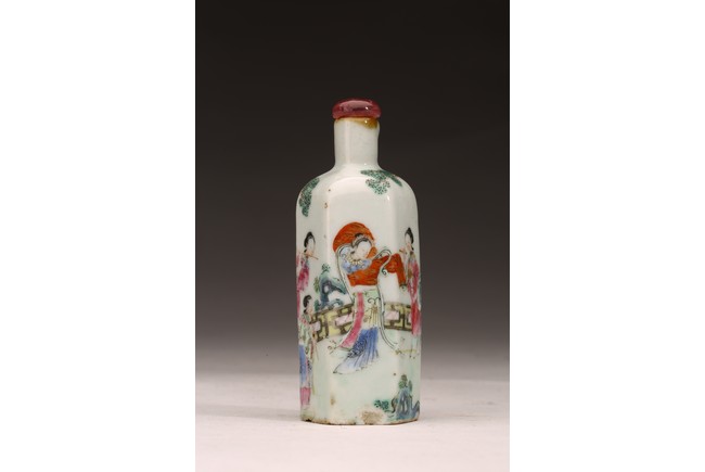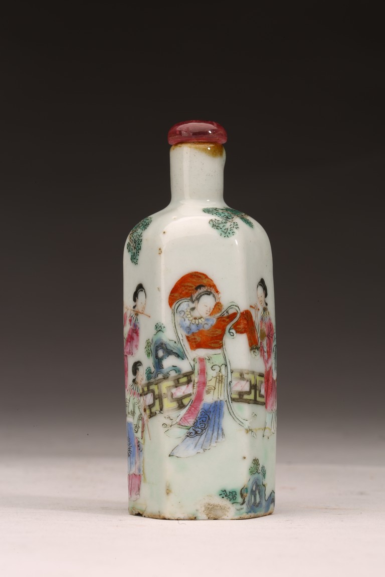 直頸,器呈六邊形,器身粉彩繪仕女人物,仕女面容安詳,身著長衣長裙,腰間系帶,頭 頂雲鬢,身段優雅,端莊清秀,整體色彩濃艷,筆觸細膩,繪畫技藝嫻熟流暢 ,“道光年製” 款識。 來源:南加州Costa Mesa市私人收藏 Provenance: Private collection, Costa Mesa, California