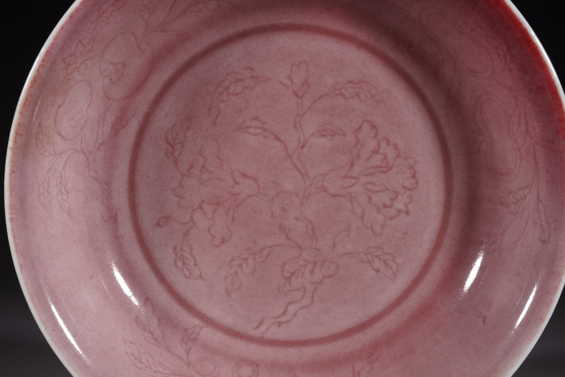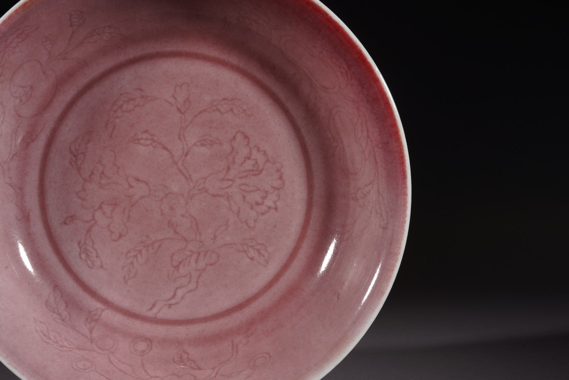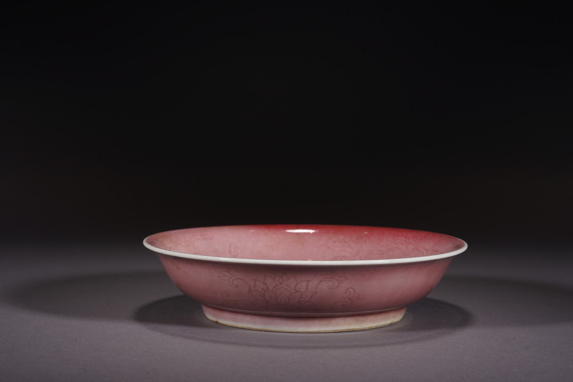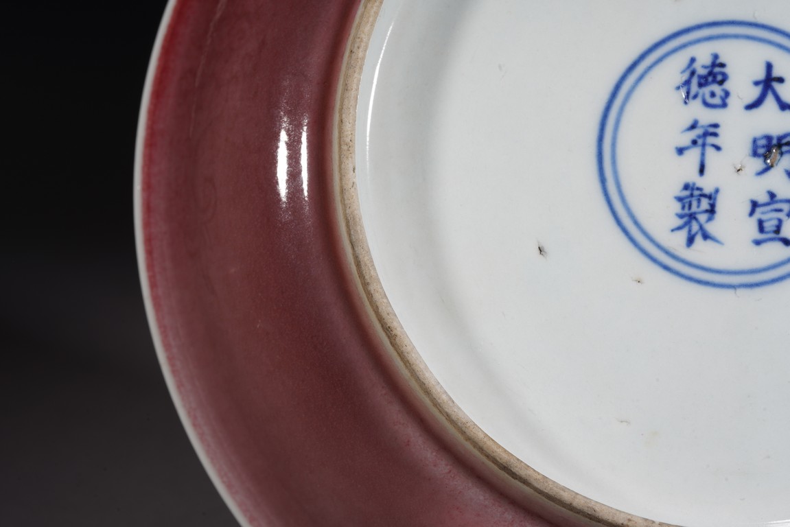 敞口,弧壁,圈足。口沿因高溫熔融使銅紅釉向下流動而露出白色的胎骨,俗稱「燈草邊」。 釉色鮮潤,釉面瑩亮光潤,燒造品質極爲上乘,釉層較厚,釉質肥厚, 釉內氣泡較多,釉 面光潔瑩潤。盤心繪“折枝花卉紋”,四周爲“三多紋”,分別爲“蟠桃、石榴、荔枝”,寓 意多福多壽多子。“大明宣德年制”款識,爲寄托款識。