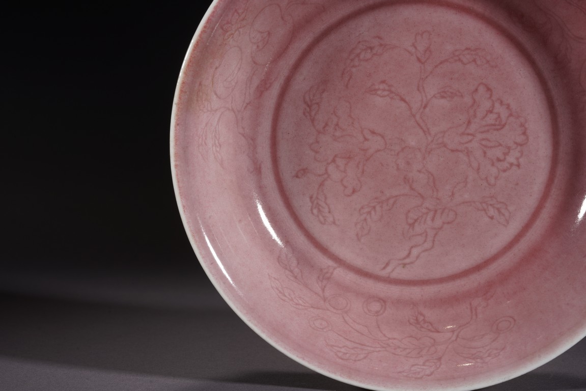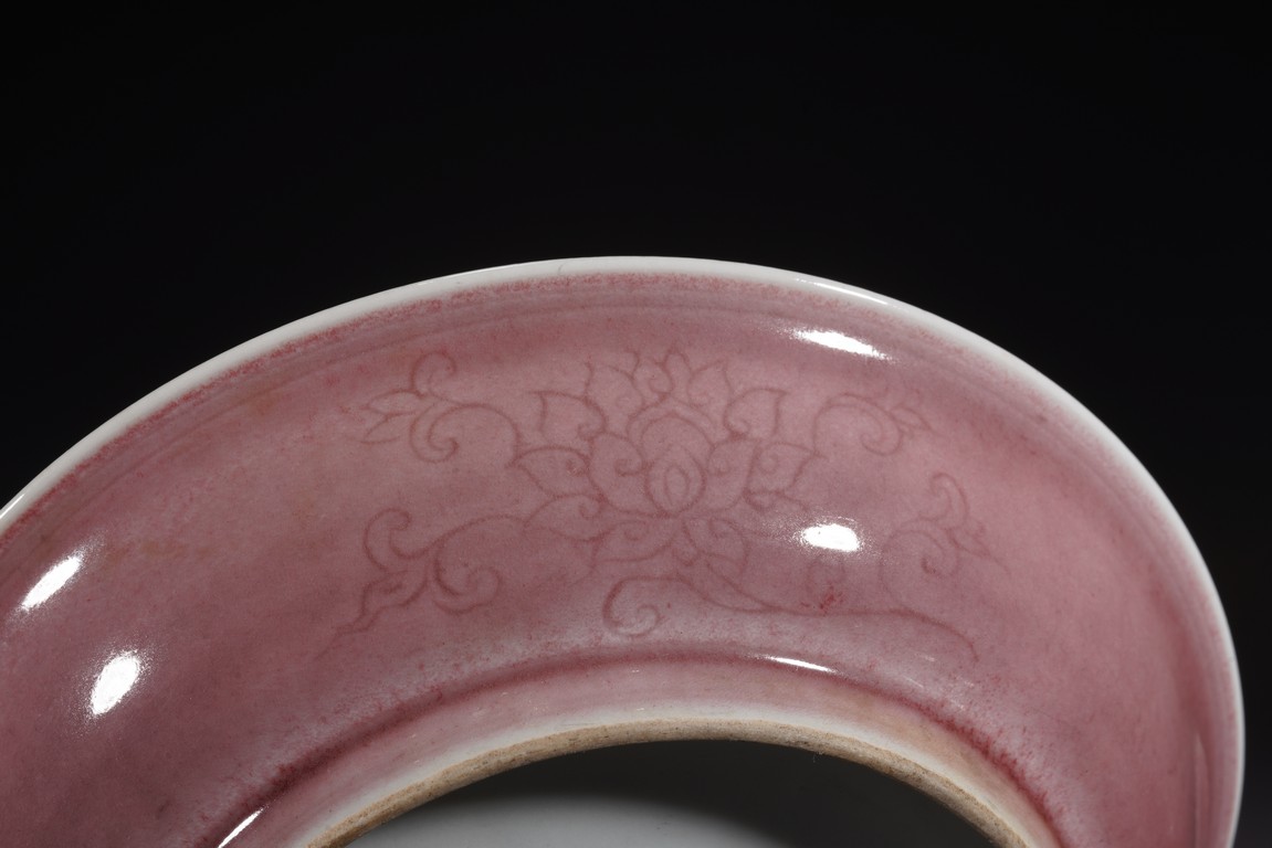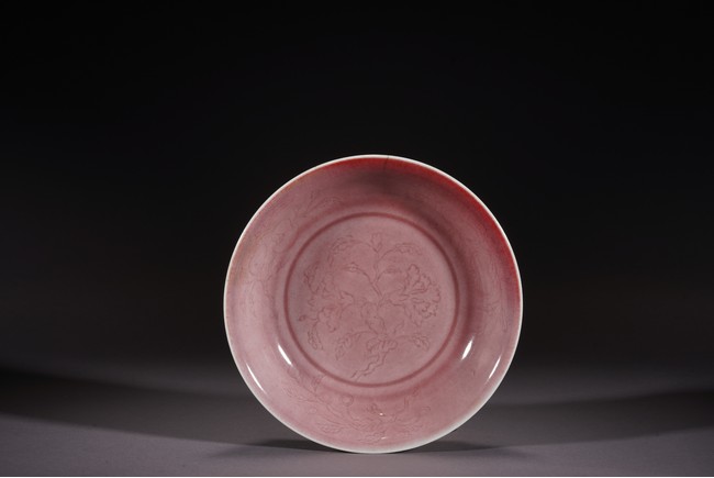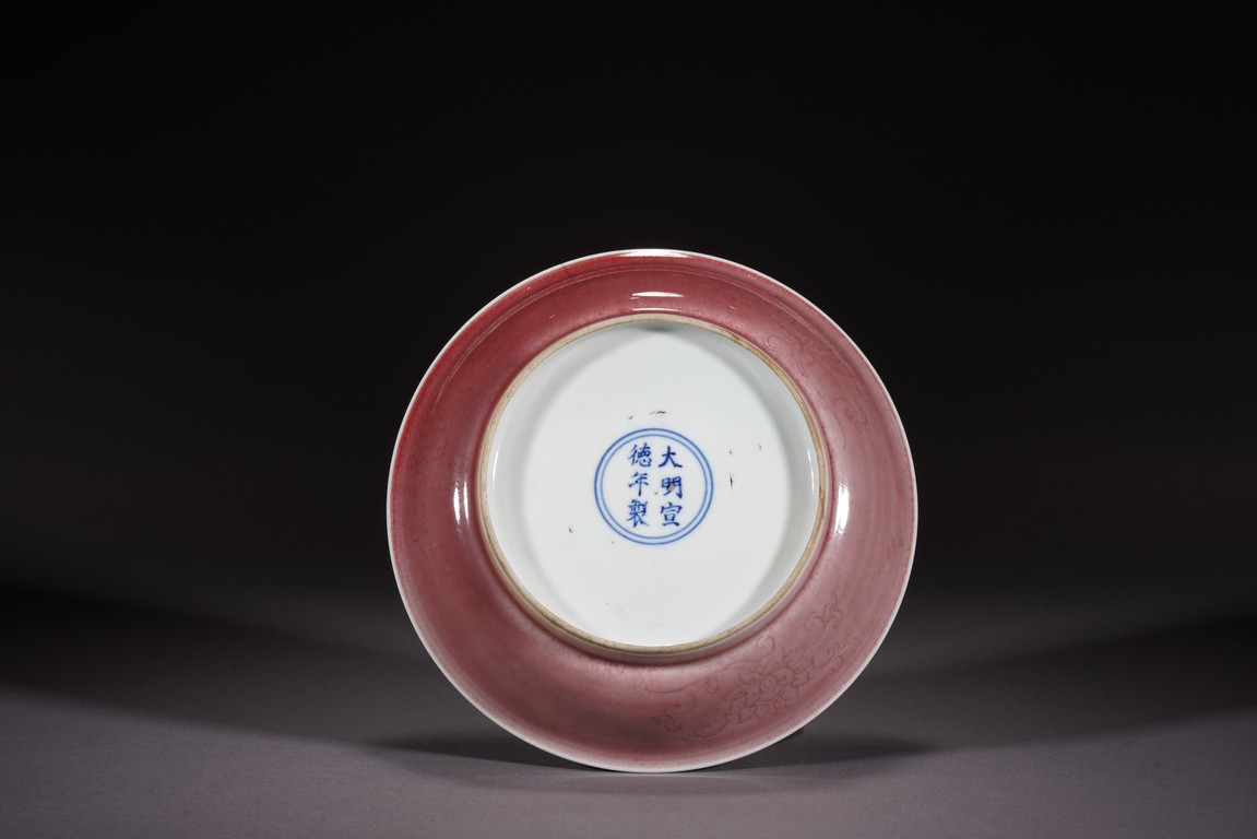 敞口,弧壁,圈足。口沿因高溫熔融使銅紅釉向下流動而露出白色的胎骨,俗稱「燈草邊」。 釉色鮮潤,釉面瑩亮光潤,燒造品質極爲上乘,釉層較厚,釉質肥厚, 釉內氣泡較多,釉 面光潔瑩潤。盤心繪“折枝花卉紋”,四周爲“三多紋”,分別爲“蟠桃、石榴、荔枝”,寓 意多福多壽多子。“大明宣德年制”款識,爲寄托款識。