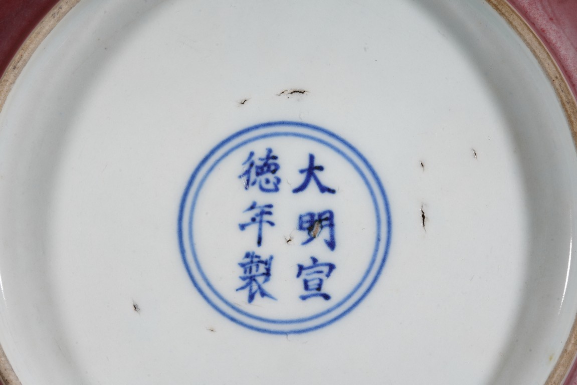 Qing Dynasty period. The shallow rounded sides with lipped rim resting on a footrim covered overall with a copper-red glaze, the interior painted with flowering and fruiting branches of the sanduo, base bears apocryphal Xuande mark.