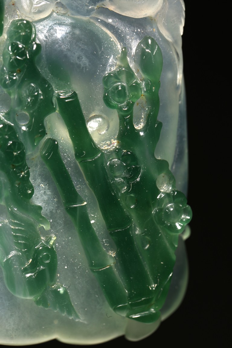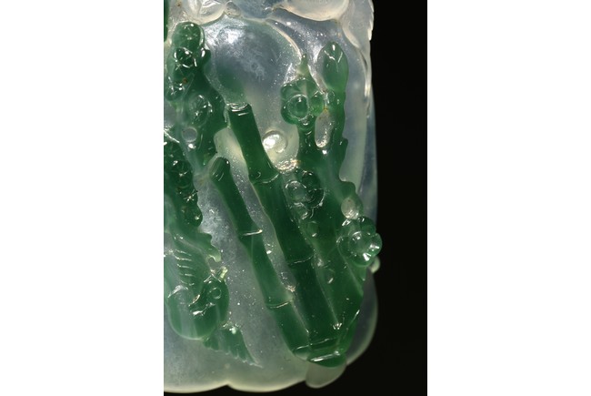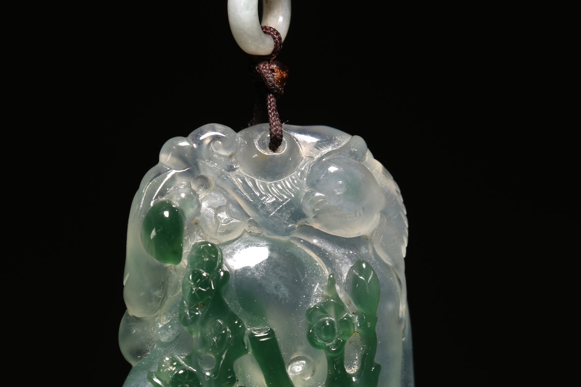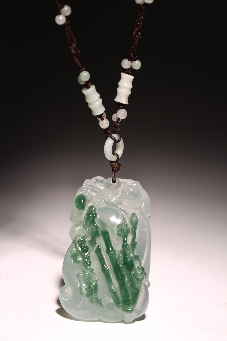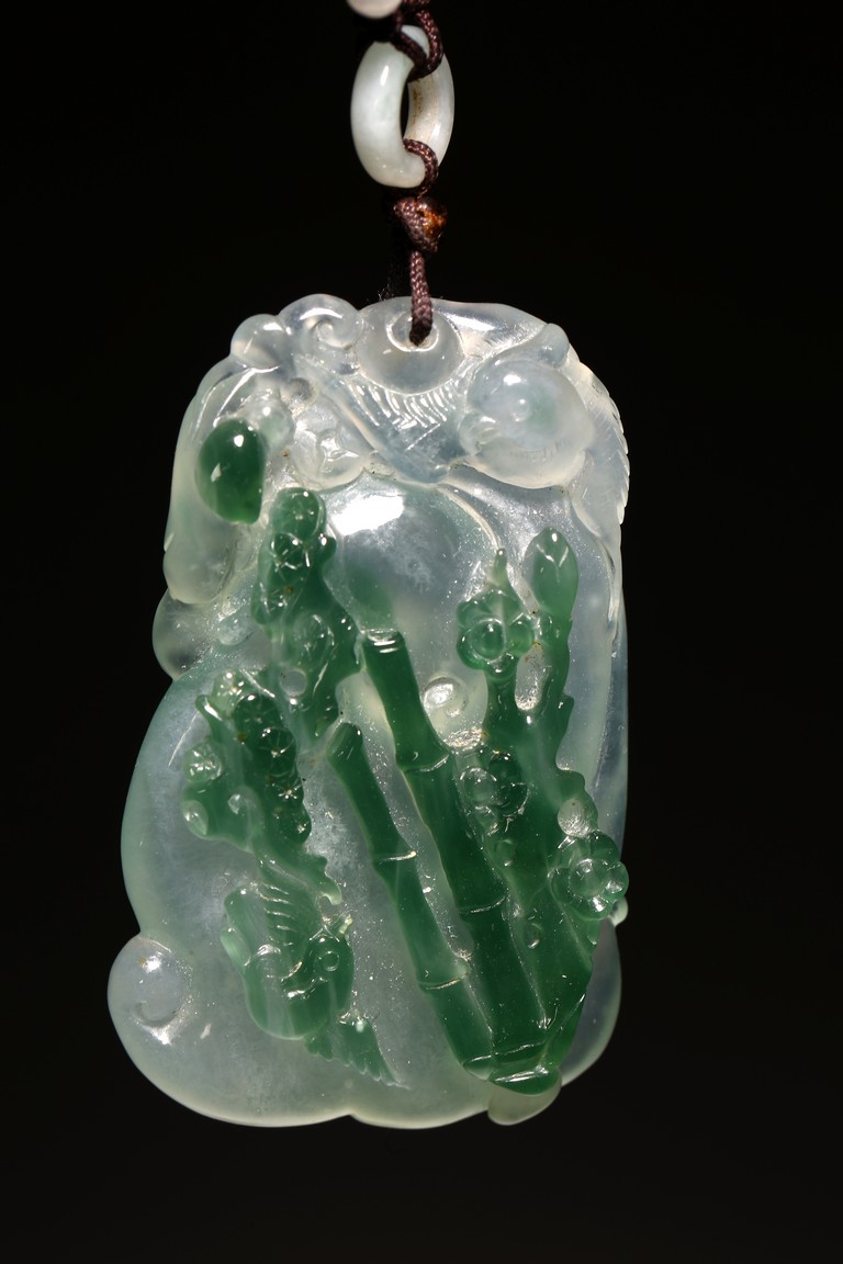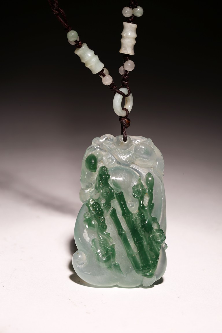 Qing Dynasty period. The plaque finely carved in relief with bamboo and pines with green skin against background of icy jadeite carved bird flying above.