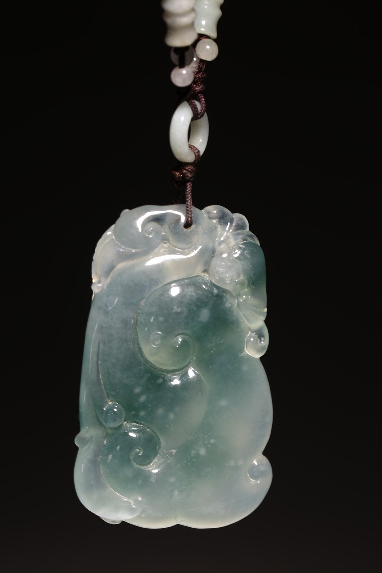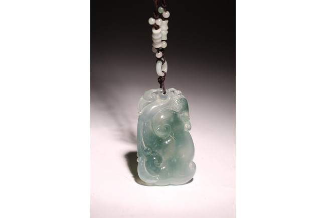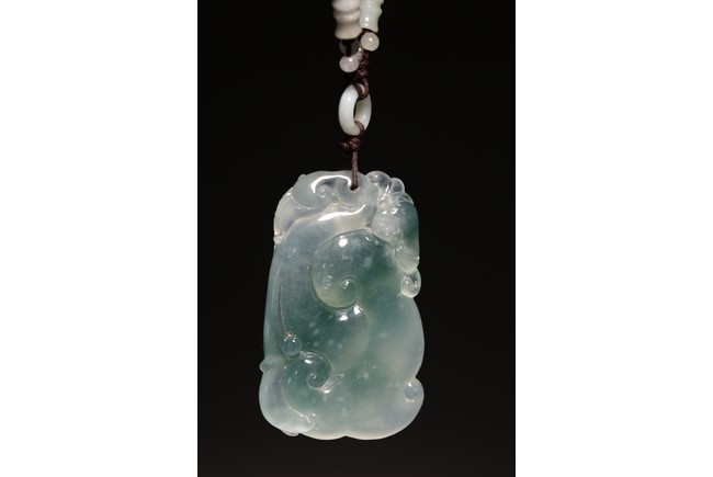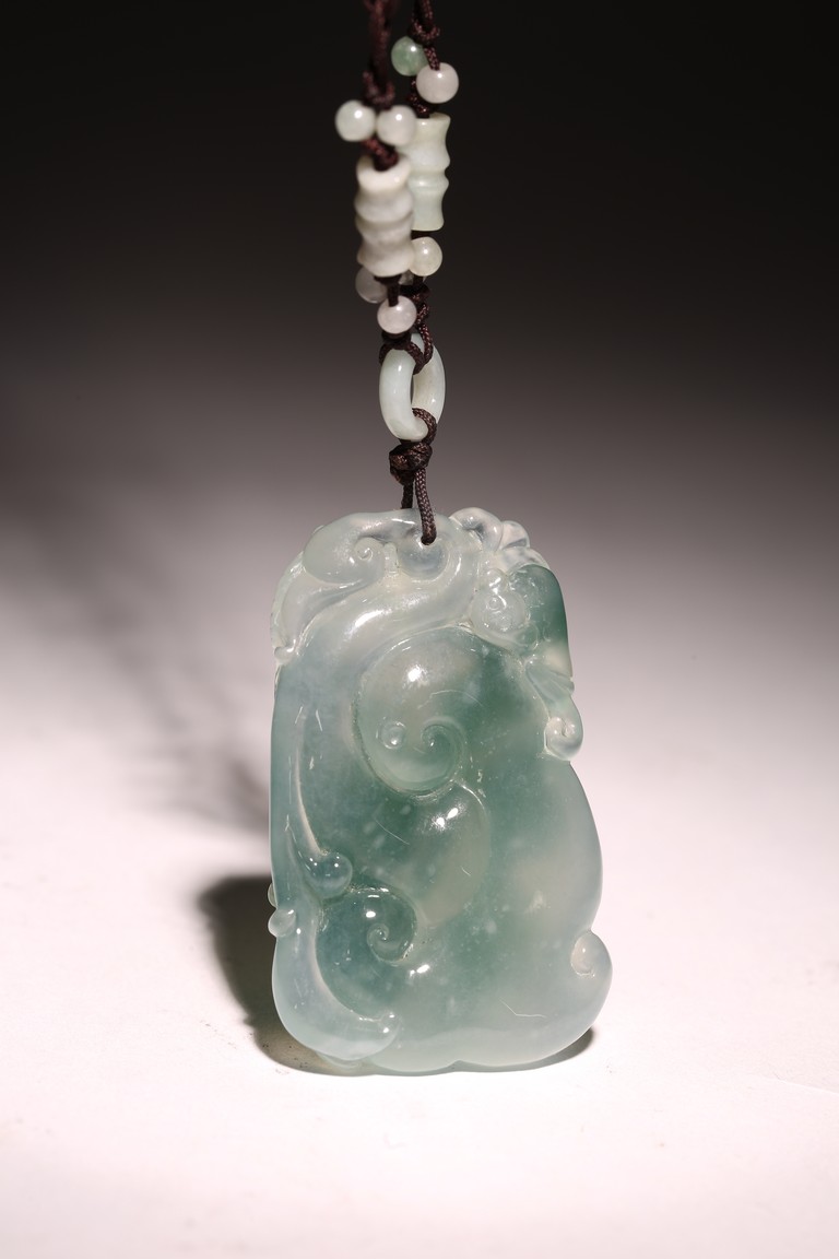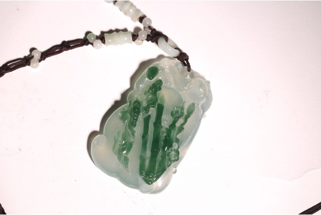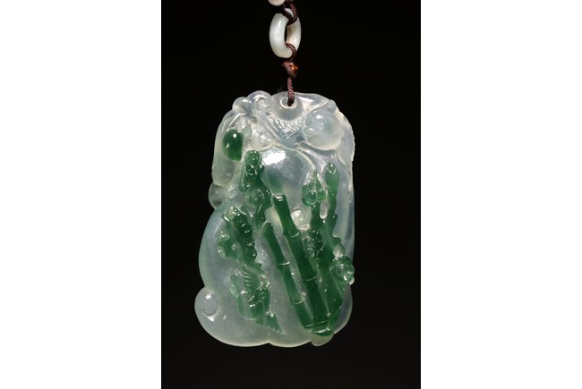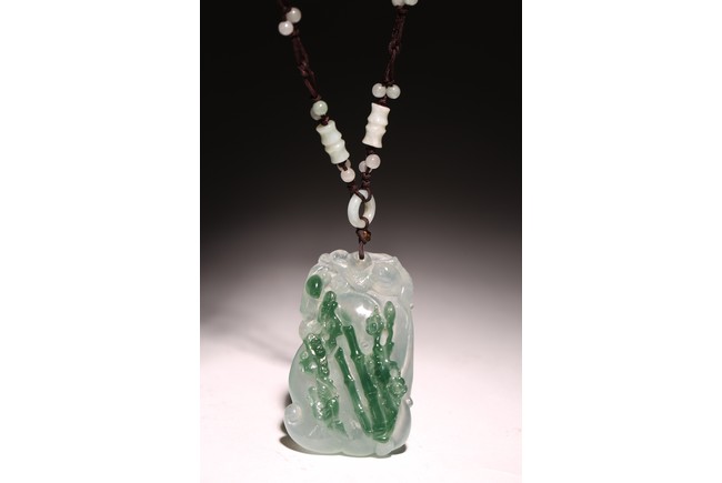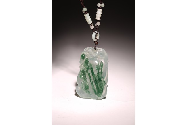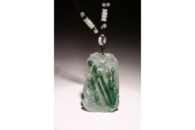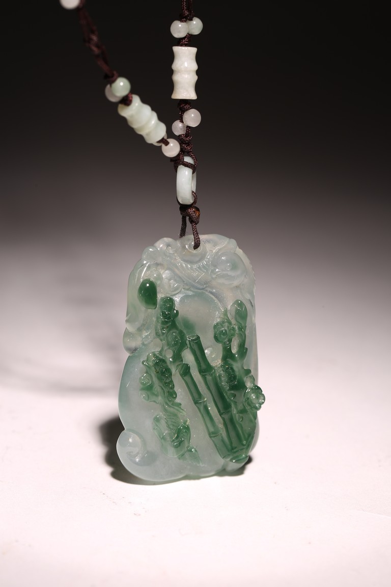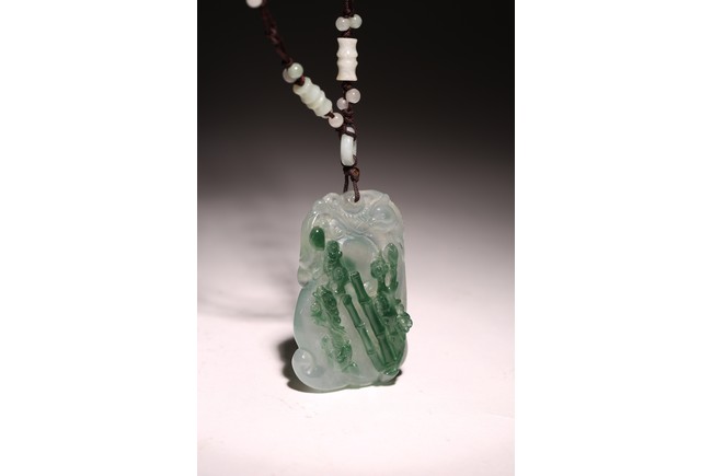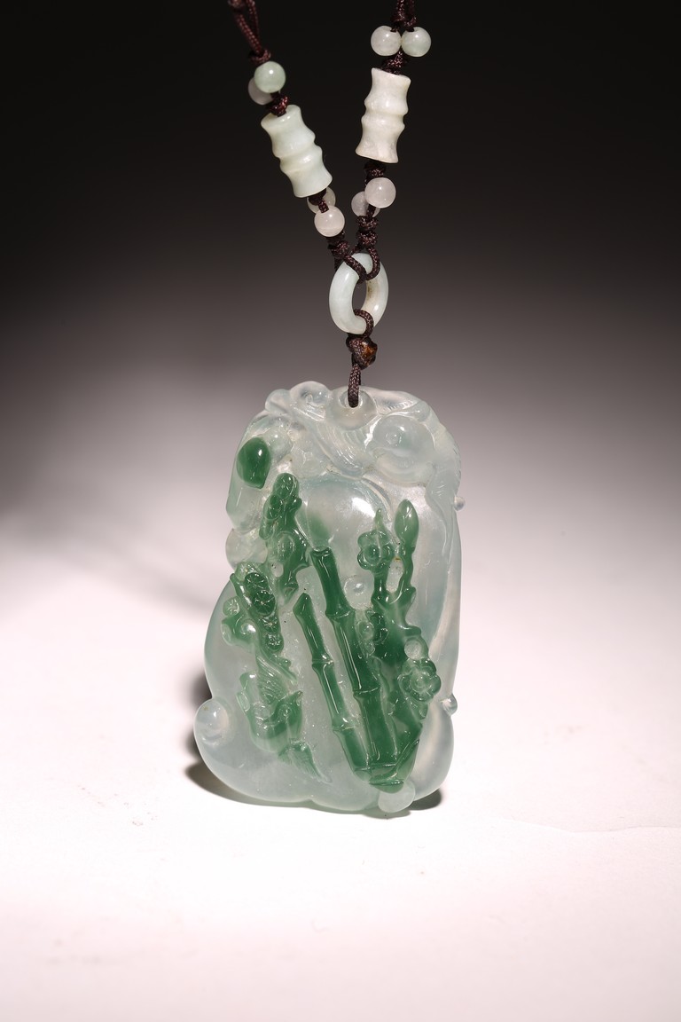 "本品用翡翠雕琢而成,質地堅密均勻,呈半透明,顔色均一,正面浮雕刻"松竹 紋",呈現均勻的淺水綠色,種水俱佳,適宜佩戴。"