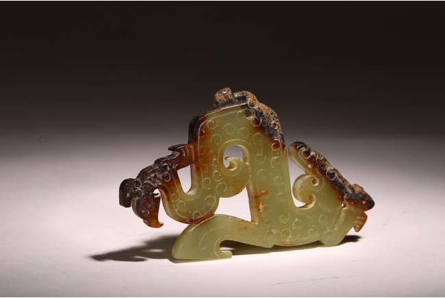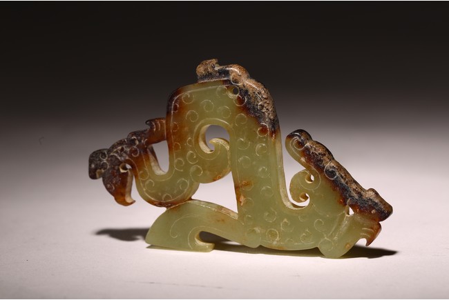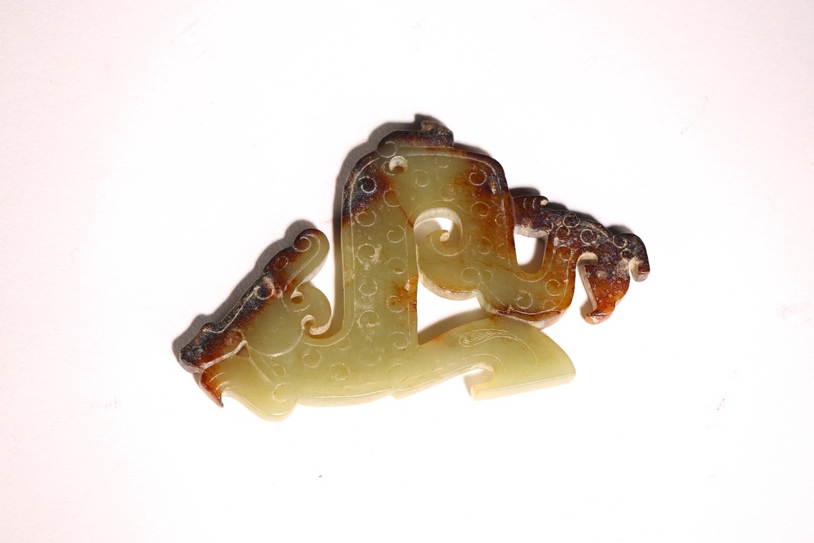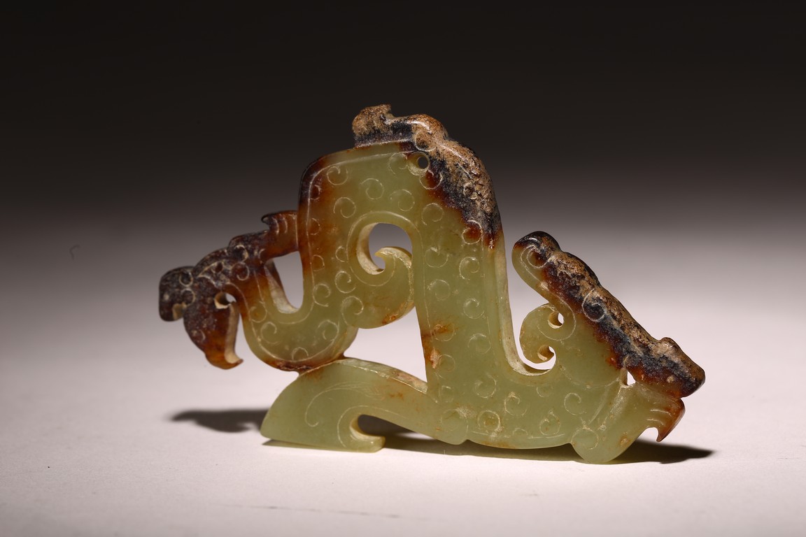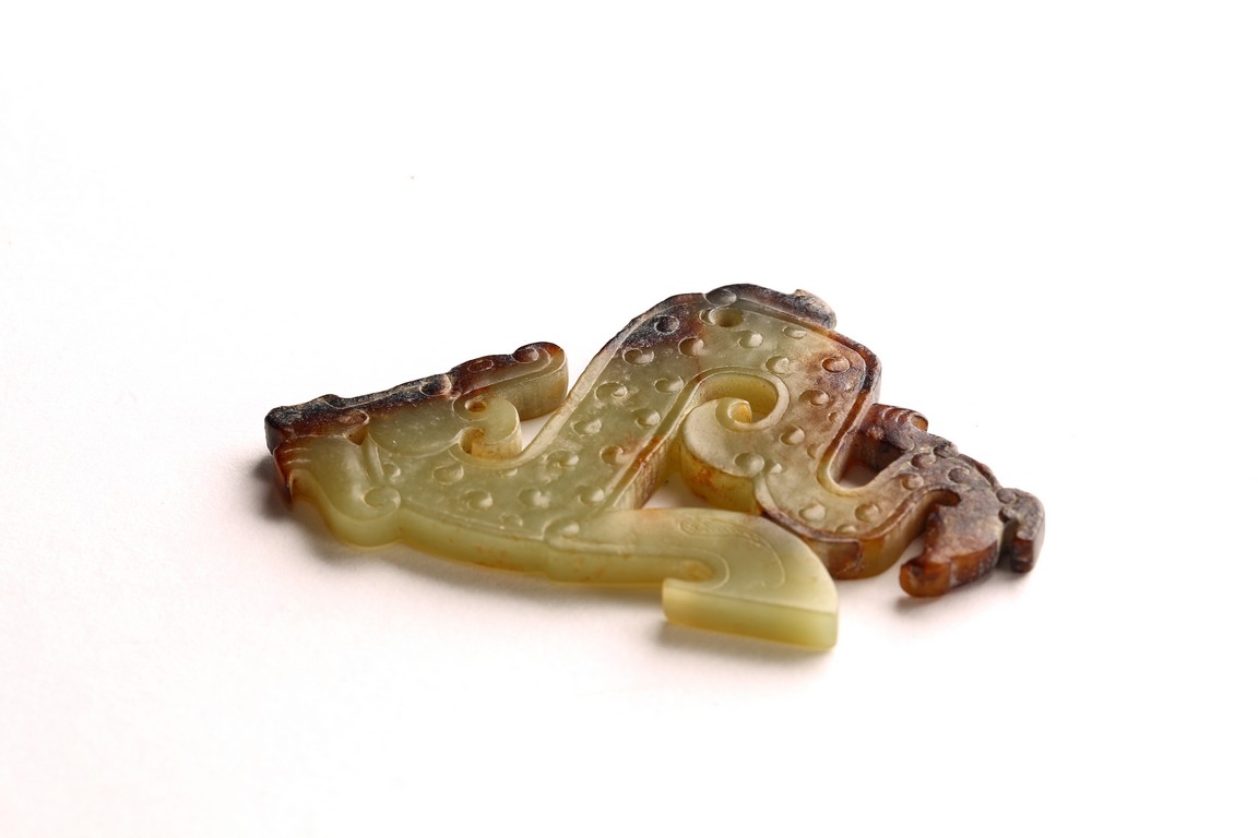 Han Dynasty period. Well worked from a russet and celadon stone, the thick S-shaped pendant skilfully rendered to depict a sinuous dragon with its coiled body detailed with spiral bosses and terminating in a phoenix head.