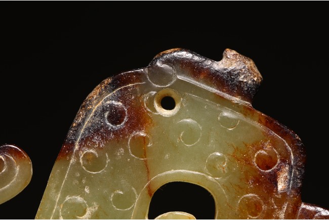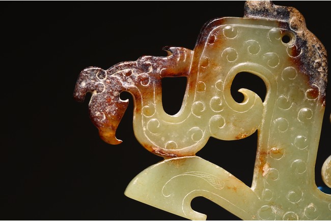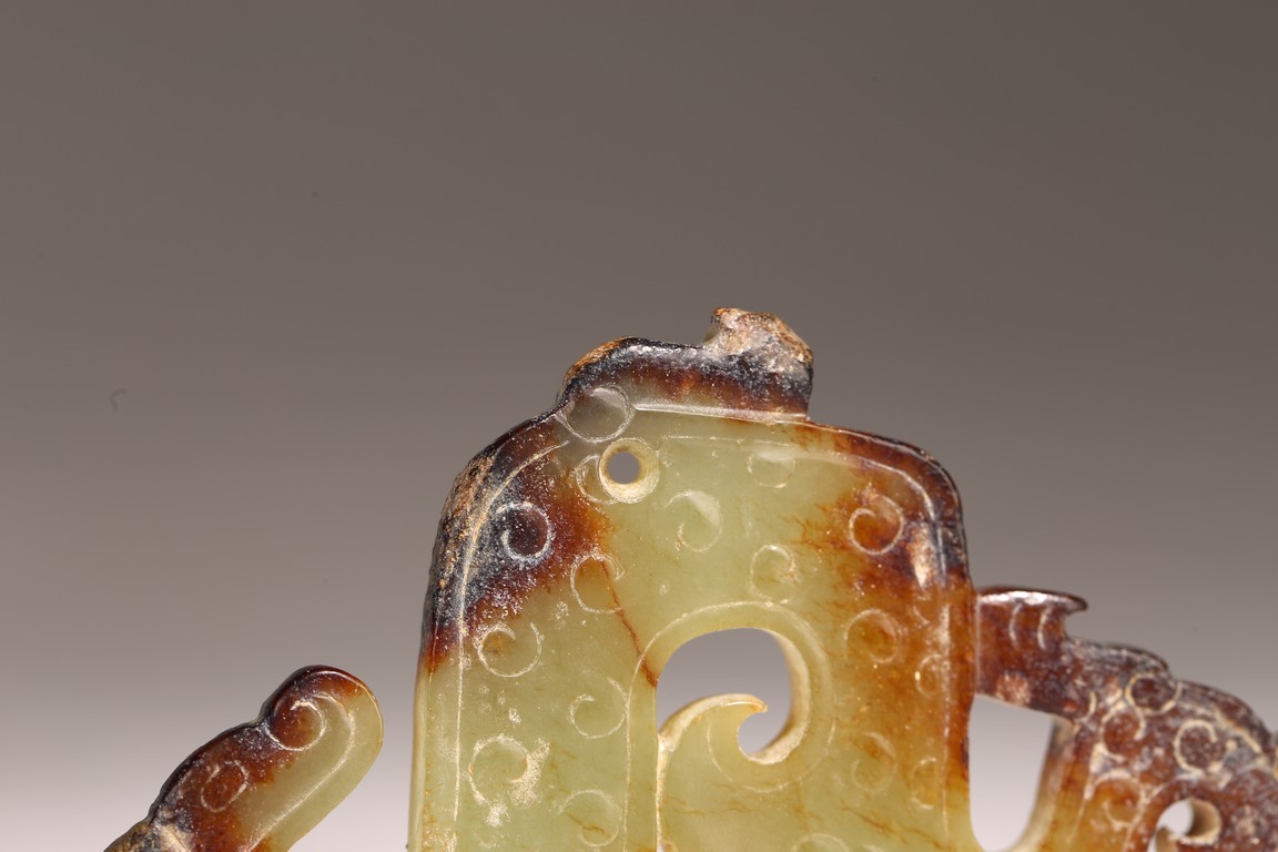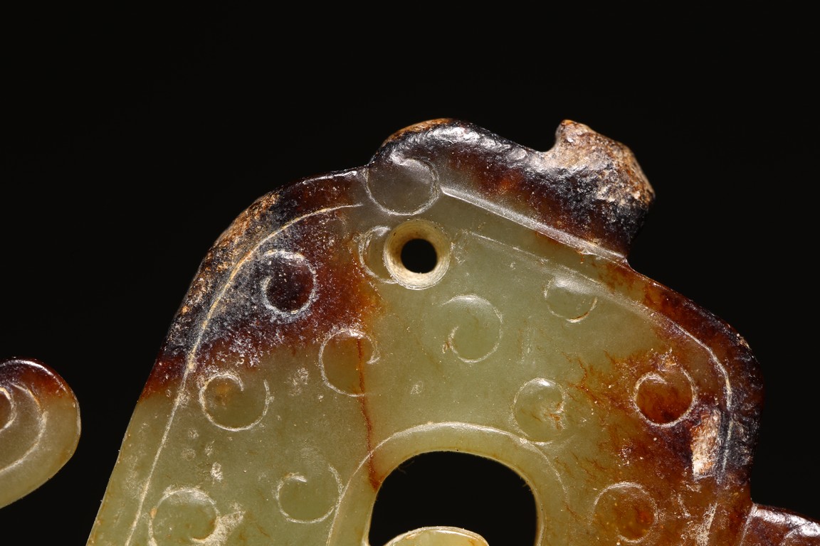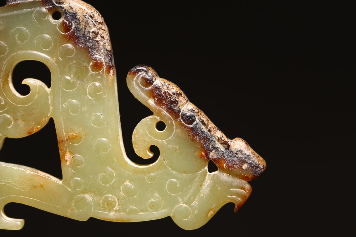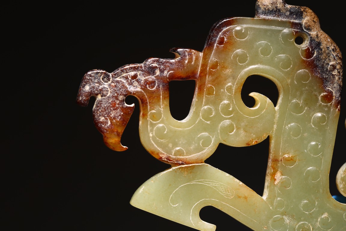 Han Dynasty period. Well worked from a russet and celadon stone, the thick S-shaped pendant skilfully rendered to depict a sinuous dragon with its coiled body detailed with spiral bosses and terminating in a phoenix head.