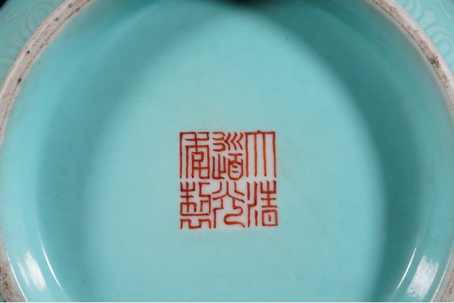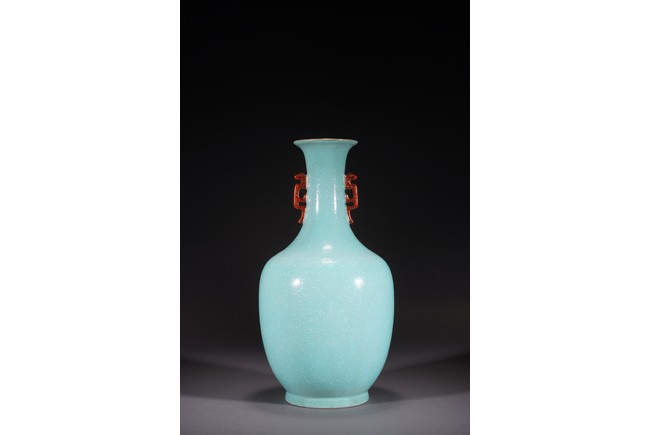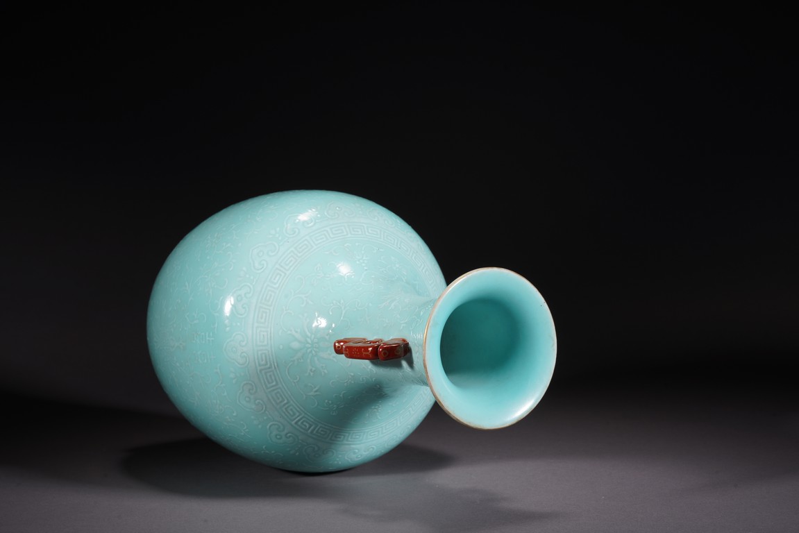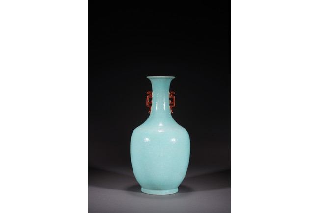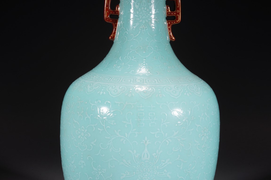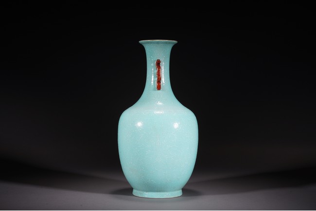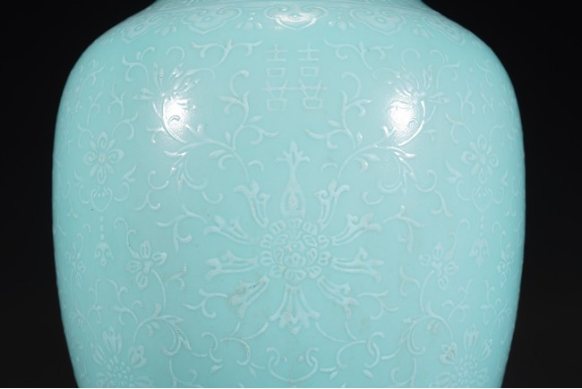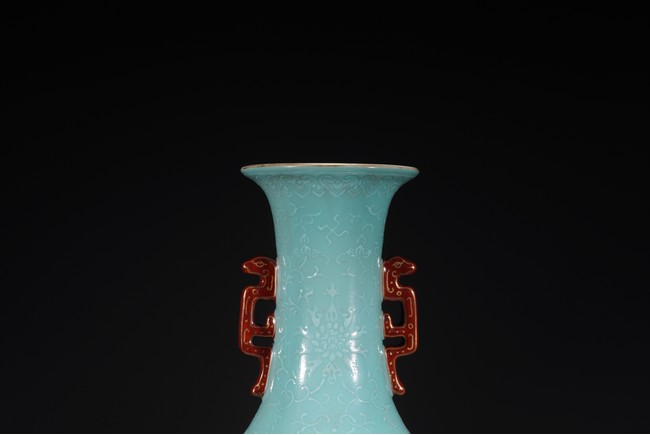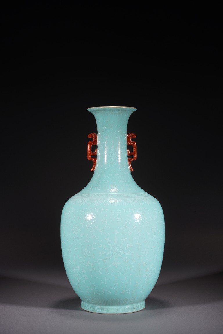 此式松石綠釉堆白裝飾工藝爲乾隆朝的一大發明,嘉道二朝偶有燒造,琢器唯見道光禦瓷 有之。嘉道二朝同類器皿相比較,道光窯禦瓷往往彩料精研程度不輸于乾隆,設色更趨清雅 柔和,氣息尤其在嘉慶之上,究其原因,無不與道光皇帝自身審美性格密切攸關。道光皇帝 一生以儉德著稱,力戒奢華之色,在瓷器的制作方面亦然。 本品俊秀挺拔,撇口,長頸,鼓腹下收,圈足。飾礬紅描金夔龍雙耳,通體施松石綠釉, 清麗淡雅,光潔如玉,在碧翠釉面以白彩堆畫。頸部前後繪“纏枝花卉紋”,肩部飾“回紋” “倒挂如意紋”一周,腹部主題紋飾繪“寶相花托“囍”紋”,底部圈足飾“蕉葉紋”“回紋” 一周。工藝精致,勾描流暢,松石綠釉往往多爲彩瓷色地,以彰彩繪之美,而此式工藝不獨 如此,更多突出松石綠釉之勻淨質感。本品觀之,雖簡約淡雅,卻韻味無窮,本品寓意吉祥, 爲道光朝大婚用器之珍品,地位尊貴。“大清道光年制”款識。(可參閱倫敦蘇富比,2002 年 11 月 13 日,Lot. 156;《清康雍乾名瓷特展》,台北故宮博物院,1986 年,頁 113,圖 98; 《宮廷珍藏—中國清代官窯瓷器》,上海文化出版社,2003 年,頁 265)