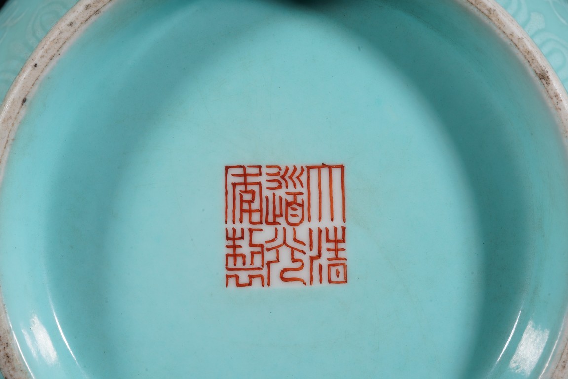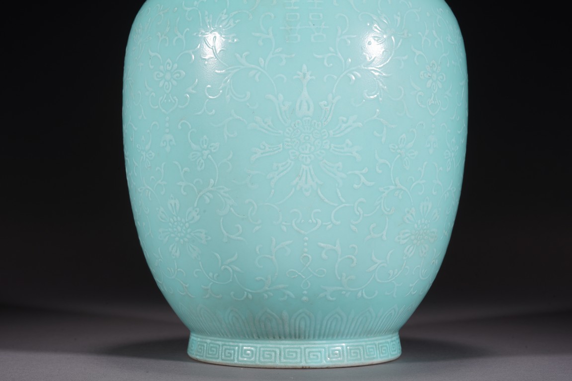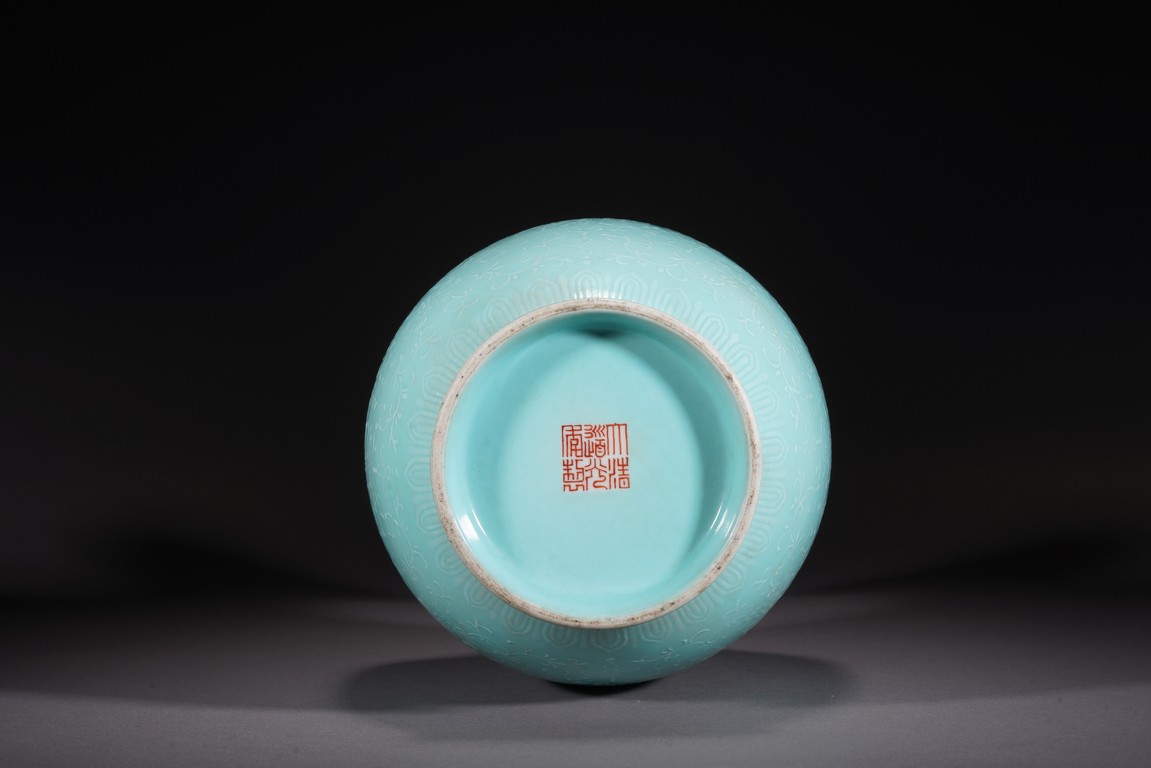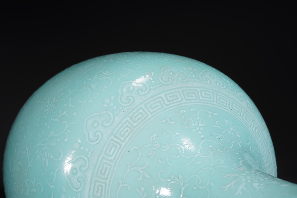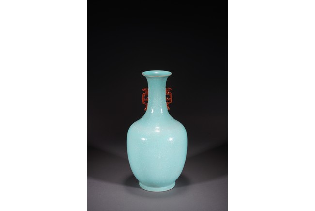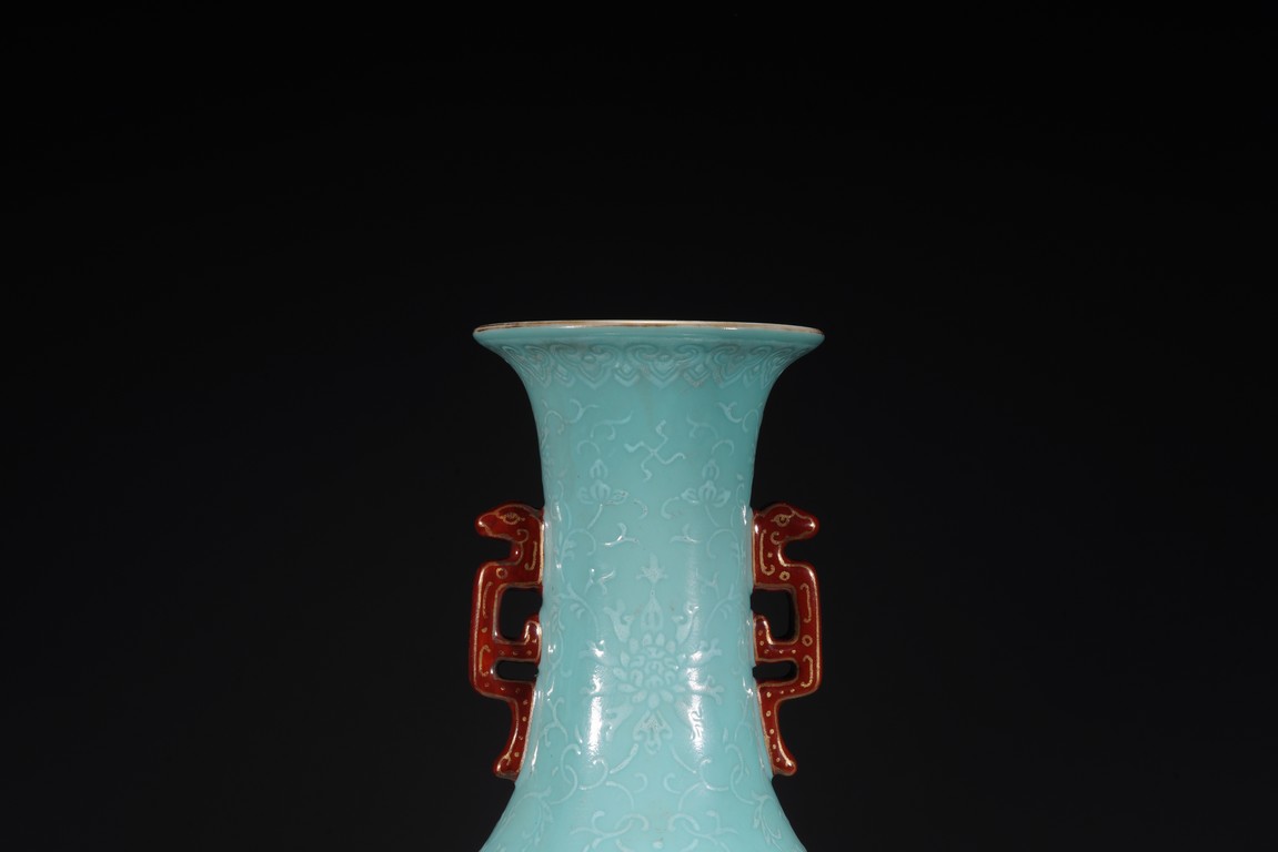 此式松石綠釉堆白裝飾工藝爲乾隆朝的一大發明,嘉道二朝偶有燒造,琢器唯見道光禦瓷 有之。嘉道二朝同類器皿相比較,道光窯禦瓷往往彩料精研程度不輸于乾隆,設色更趨清雅 柔和,氣息尤其在嘉慶之上,究其原因,無不與道光皇帝自身審美性格密切攸關。道光皇帝 一生以儉德著稱,力戒奢華之色,在瓷器的制作方面亦然。 本品俊秀挺拔,撇口,長頸,鼓腹下收,圈足。飾礬紅描金夔龍雙耳,通體施松石綠釉, 清麗淡雅,光潔如玉,在碧翠釉面以白彩堆畫。頸部前後繪“纏枝花卉紋”,肩部飾“回紋” “倒挂如意紋”一周,腹部主題紋飾繪“寶相花托“囍”紋”,底部圈足飾“蕉葉紋”“回紋” 一周。工藝精致,勾描流暢,松石綠釉往往多爲彩瓷色地,以彰彩繪之美,而此式工藝不獨 如此,更多突出松石綠釉之勻淨質感。本品觀之,雖簡約淡雅,卻韻味無窮,本品寓意吉祥, 爲道光朝大婚用器之珍品,地位尊貴。“大清道光年制”款識。(可參閱倫敦蘇富比,2002 年 11 月 13 日,Lot. 156;《清康雍乾名瓷特展》,台北故宮博物院,1986 年,頁 113,圖 98; 《宮廷珍藏—中國清代官窯瓷器》,上海文化出版社,2003 年,頁 265)