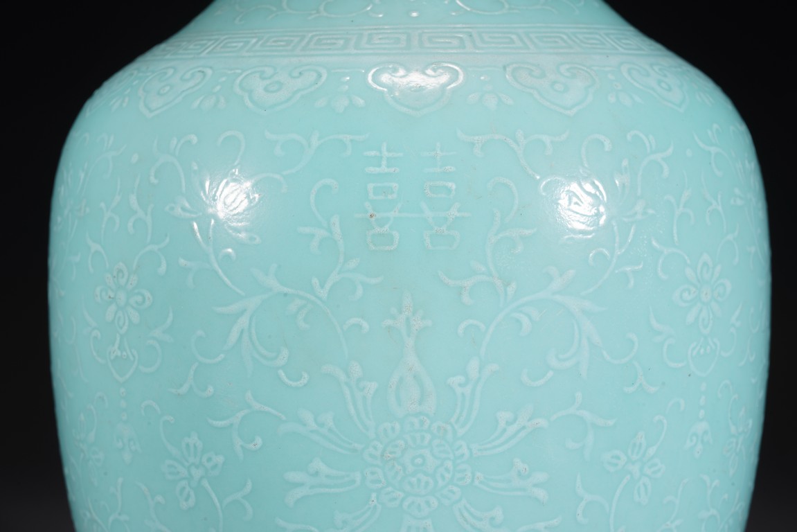 The body moulded with lotus blooms and smaller floral scrolls flanking xi characters, the wasted neck bears similar design, base with mark.