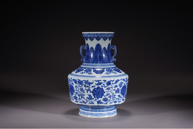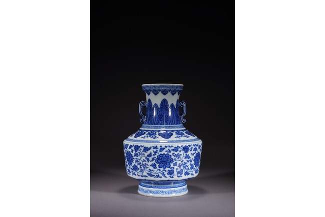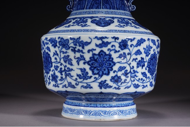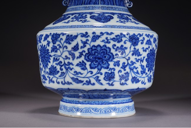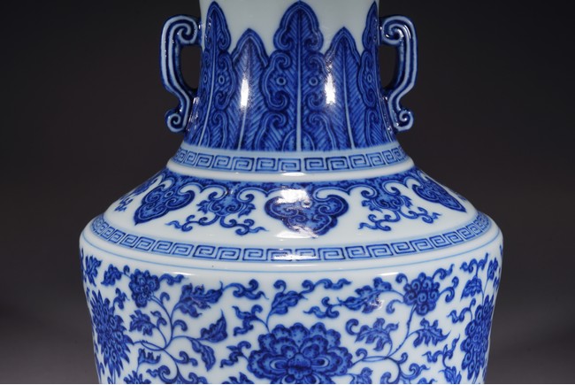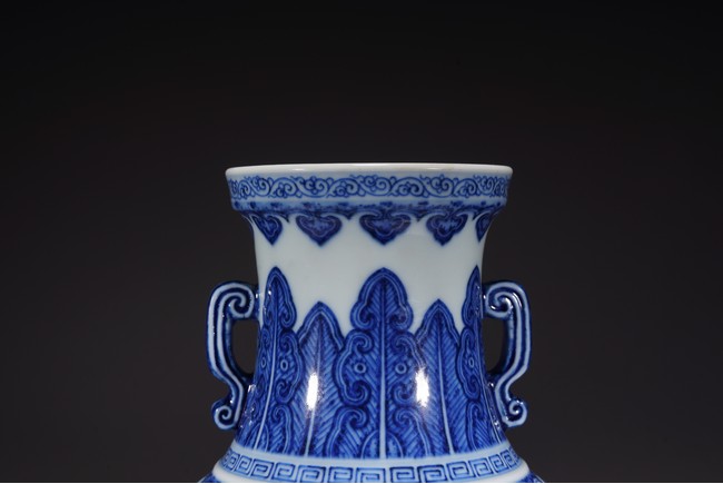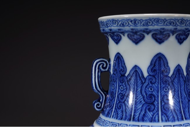 本品直口,束頸,飾雙如意耳,直腹下收,圈足。青花滿飾紋飾,上部四周繪“卷草紋” “倒挂如意紋”“回紋”“蕉葉紋”;腹部爲主體,繪纏枝蓮紋,其布局疏密有致,活潑婉轉, 毫無拘泥拖沓之感;圈足繪“卷草紋”一周。小而細碎的卷草紋,襯托“纏枝蓮紋”之間, 其流轉間精到的筆觸與自然活潑的意蘊完美融合。整體線條秀美,形制莊重典雅,胎質細膩 潔白,青花發色明快,紋飾描繪細膩。“大清乾隆年制”款識。