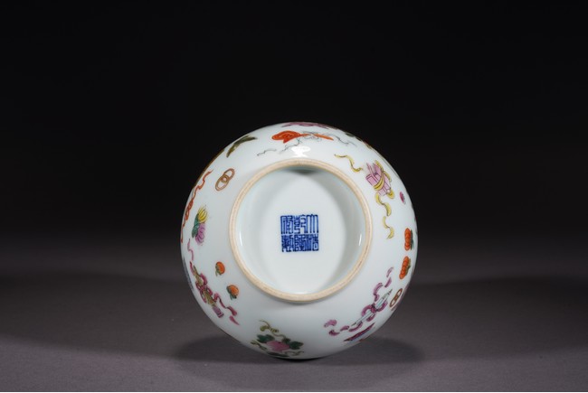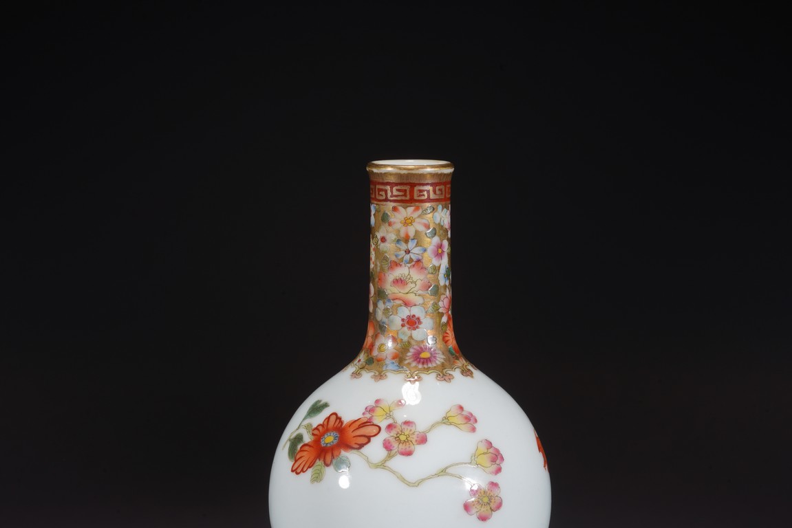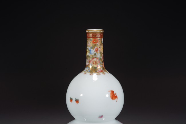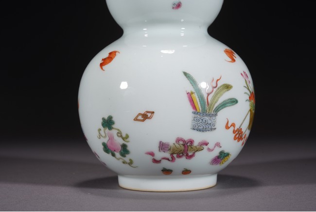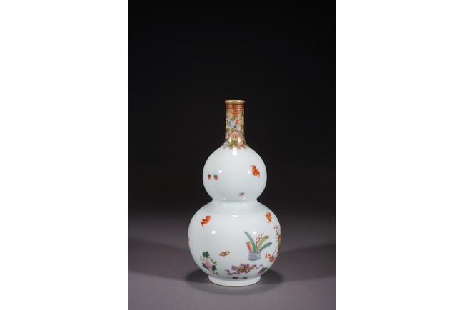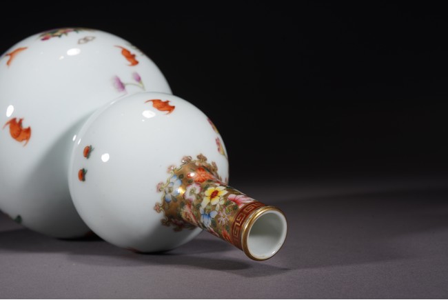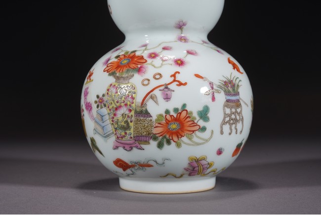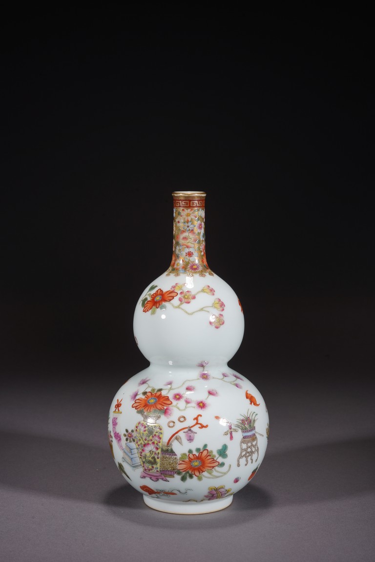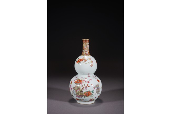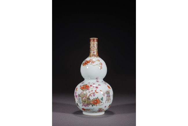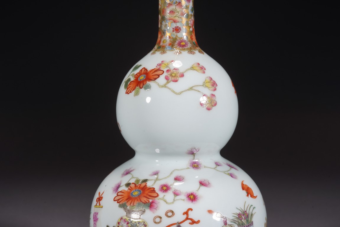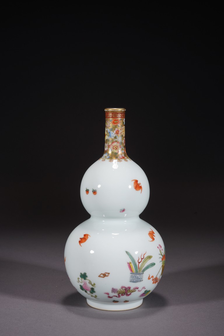 葫蘆因其獨有的外形與特性,被先人賦予了許多美好寓意,葫蘆之形狀似“吉”字,故 而常被寓以“吉祥”之意。本品造型端莊穩重,形似葫蘆,豐盈飽滿,口微斂,細長頸,斜 肩,束腰,腹部渾圓,圈足。胎質細白堅實,釉水肥厚。直口以金彩爲地,金色燦爛,口沿 飾“回紋”,其下“萬花地”繪滿四周,器身滿繪“博古圖”,分別有“花卉”“書籍”“燈籠” “吉磬”“蝙蝠”等吉祥圖案。全器裝飾效果強烈,具有鮮明的喜慶色彩,寓意美好。“大清 乾隆年制”款識。