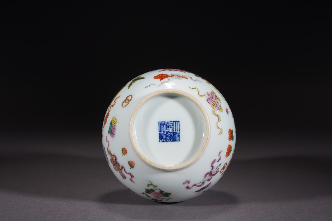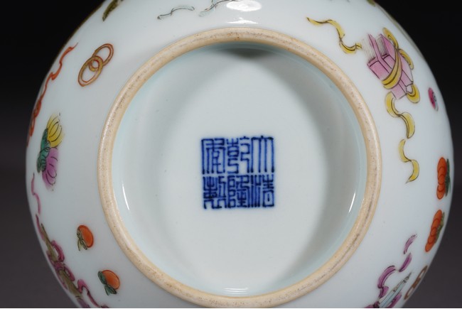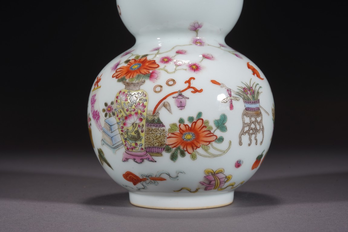 Of double gourd form, the body painted on the exterior with various precious objects and auspicious motifs, base bears reign mark.