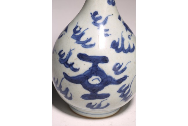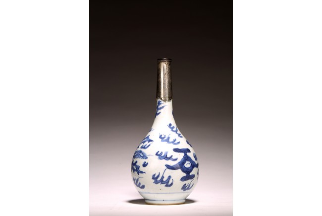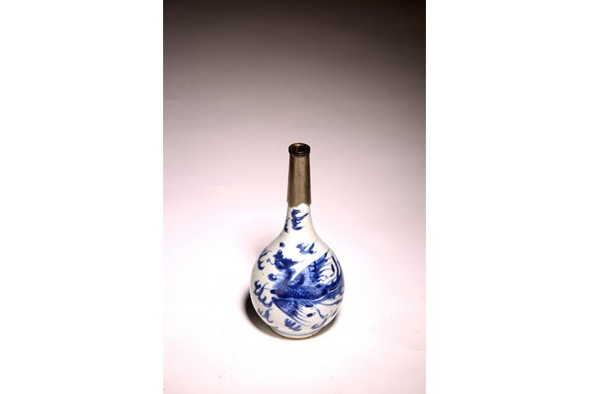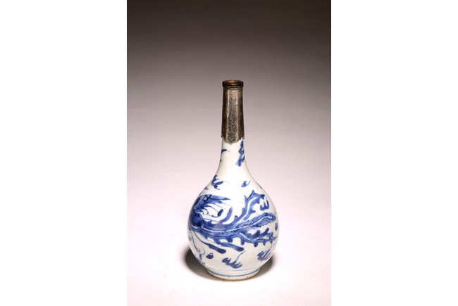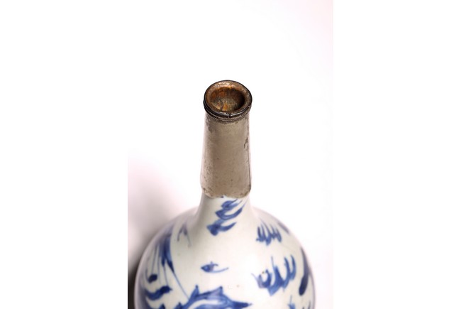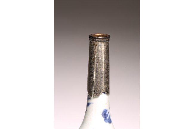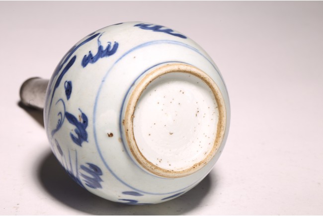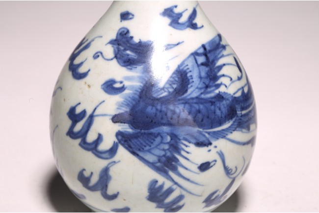 長頸,鼓圓腹,圈足,青花繪“鳳鳥紋”,鳳鳥展翅飛翔,祥雲飄逸升騰,動感十足, 口頸用錫包住,可能有殘缺,整體釉色潔白,青花發色明麗,紋飾繪工精細。 來源:南加州Anaheim女士Christina Jefferson 收藏 Provenance: Private collection of Christina Jefferson, Anaheim, California