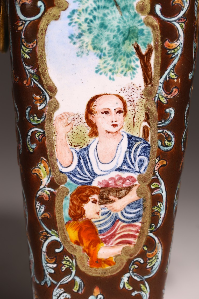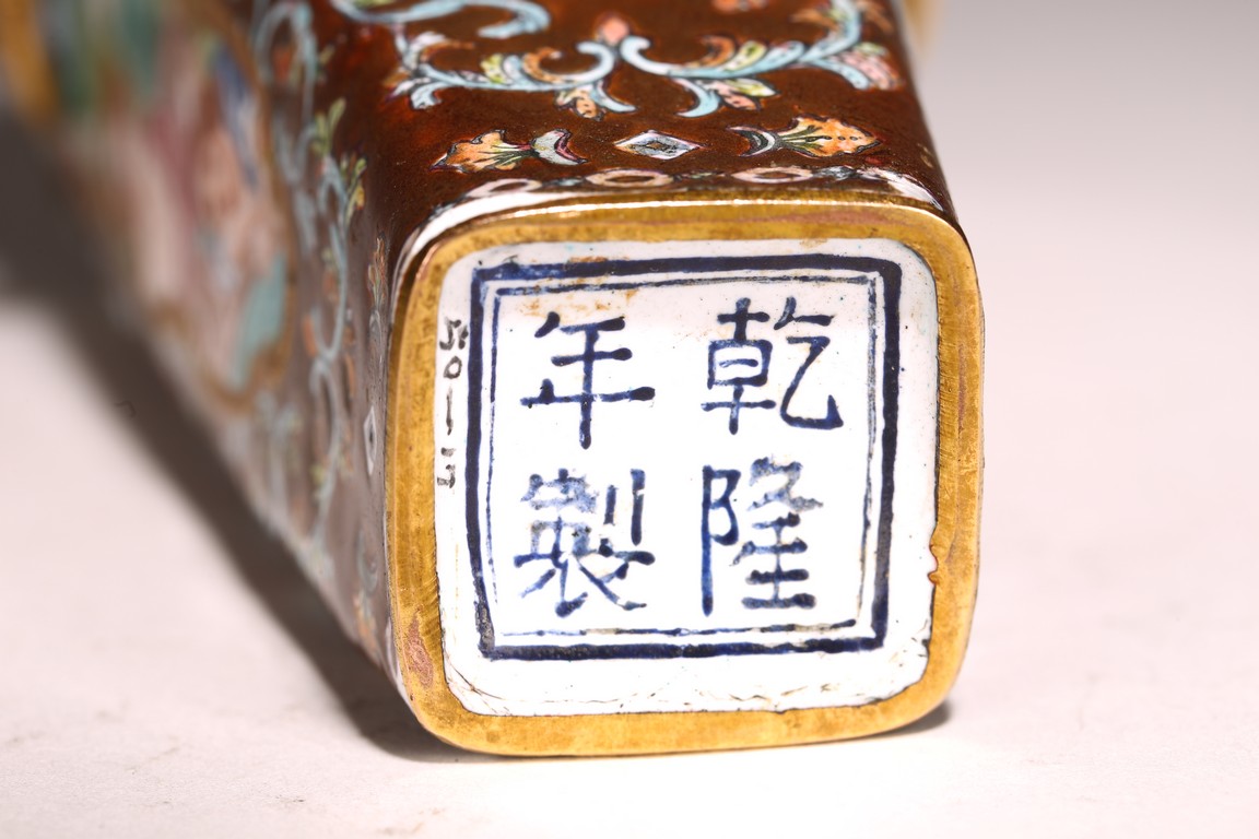 Qing Dynasty period. Of tapering square section, the body enameled with European figures enclosed within shaped cartouche, all against floral scrolls against a dark brown ground, base bears reign mark, wood stand.