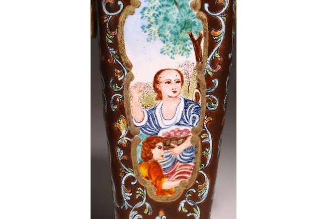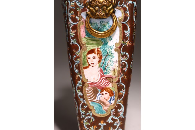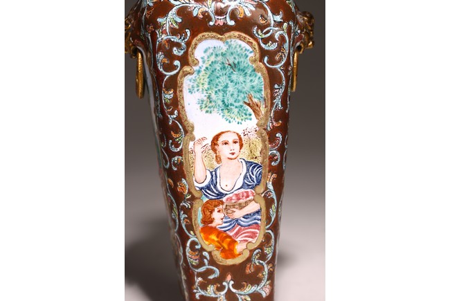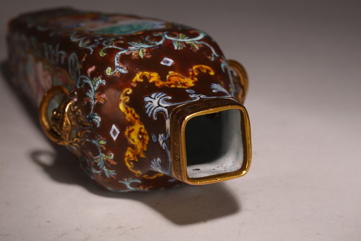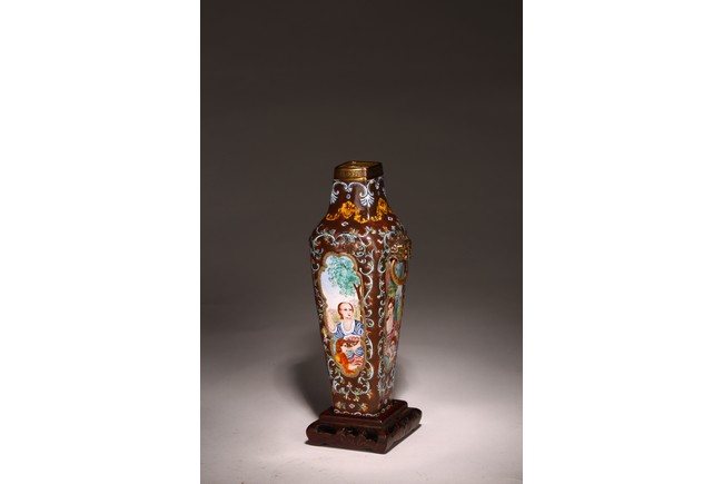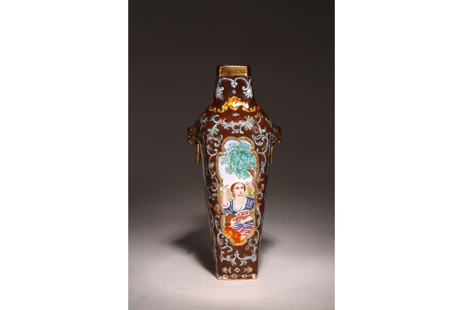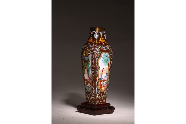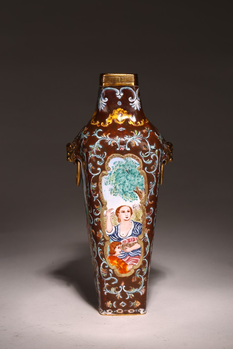 直口,直頸,直腹漸下收,飾雙獅銜環耳。口沿描金繪“回紋”一周,施琺琅 彩繪紋樣,以“纏枝花卉紋”爲地,開光繪“西洋婦女嬰戲人物”。整器外形小 巧精致,形體秀美,畫工精湛,柔美細膩,帶木座。