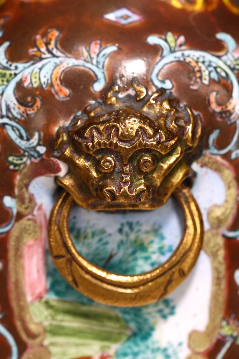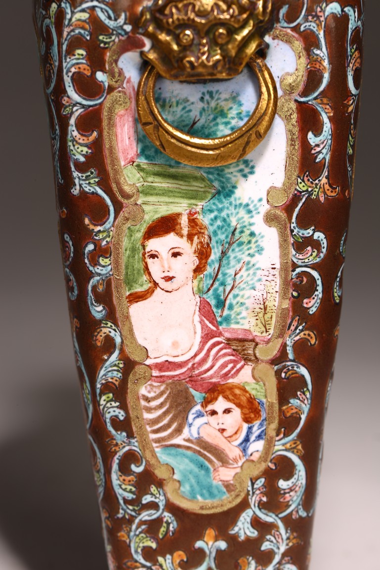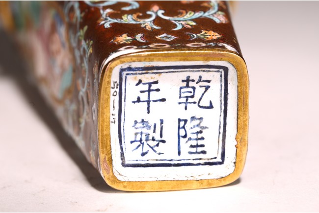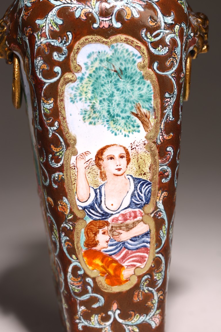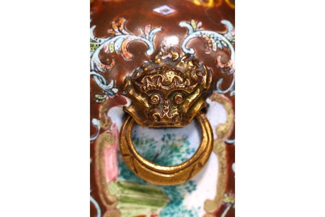 直口,直頸,直腹漸下收,飾雙獅銜環耳。口沿描金繪“回紋”一周,施琺琅 彩繪紋樣,以“纏枝花卉紋”爲地,開光繪“西洋婦女嬰戲人物”。整器外形小 巧精致,形體秀美,畫工精湛,柔美細膩,帶木座。