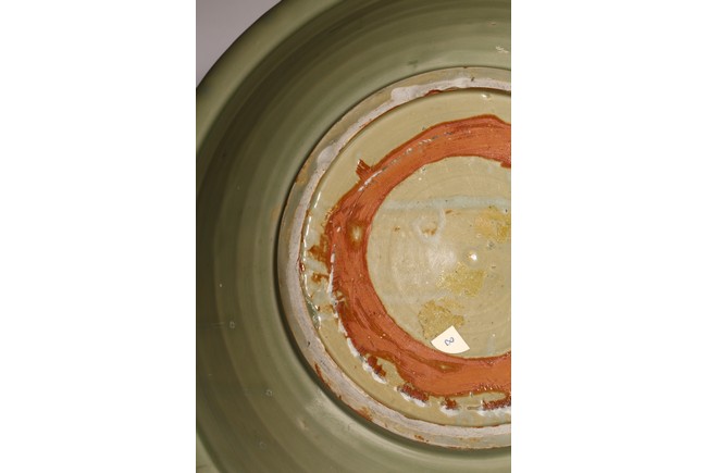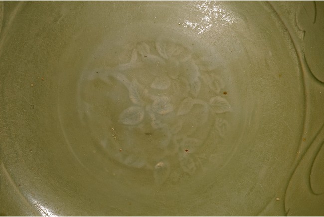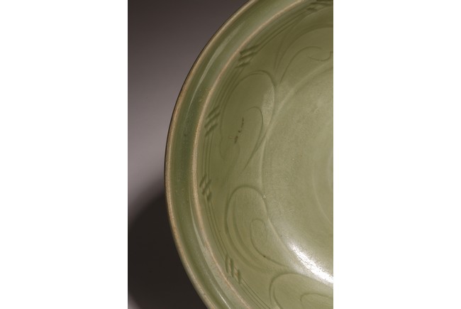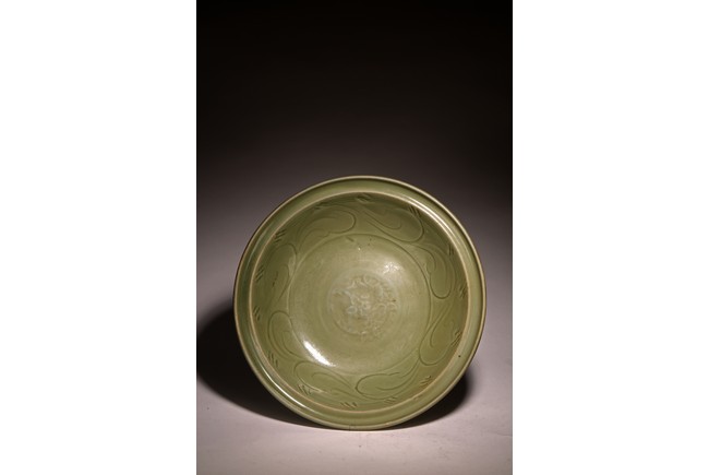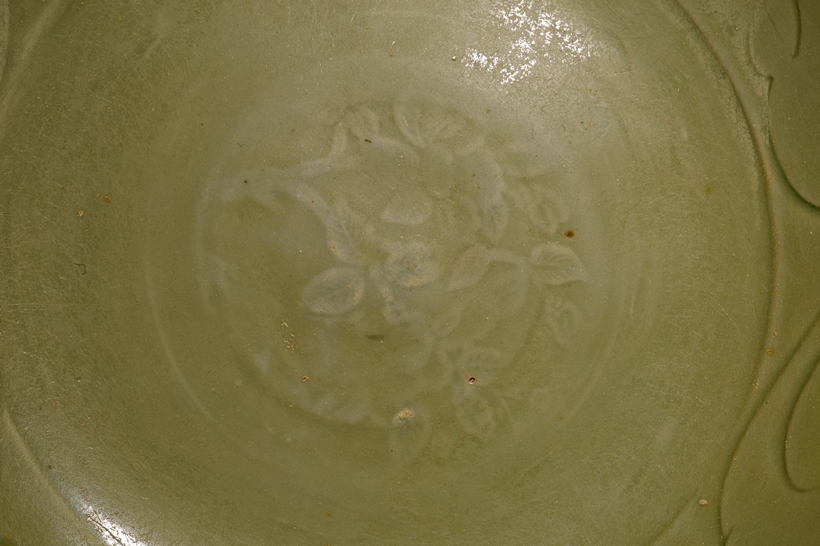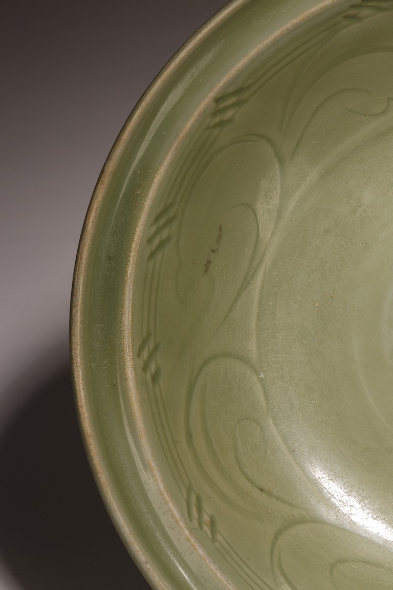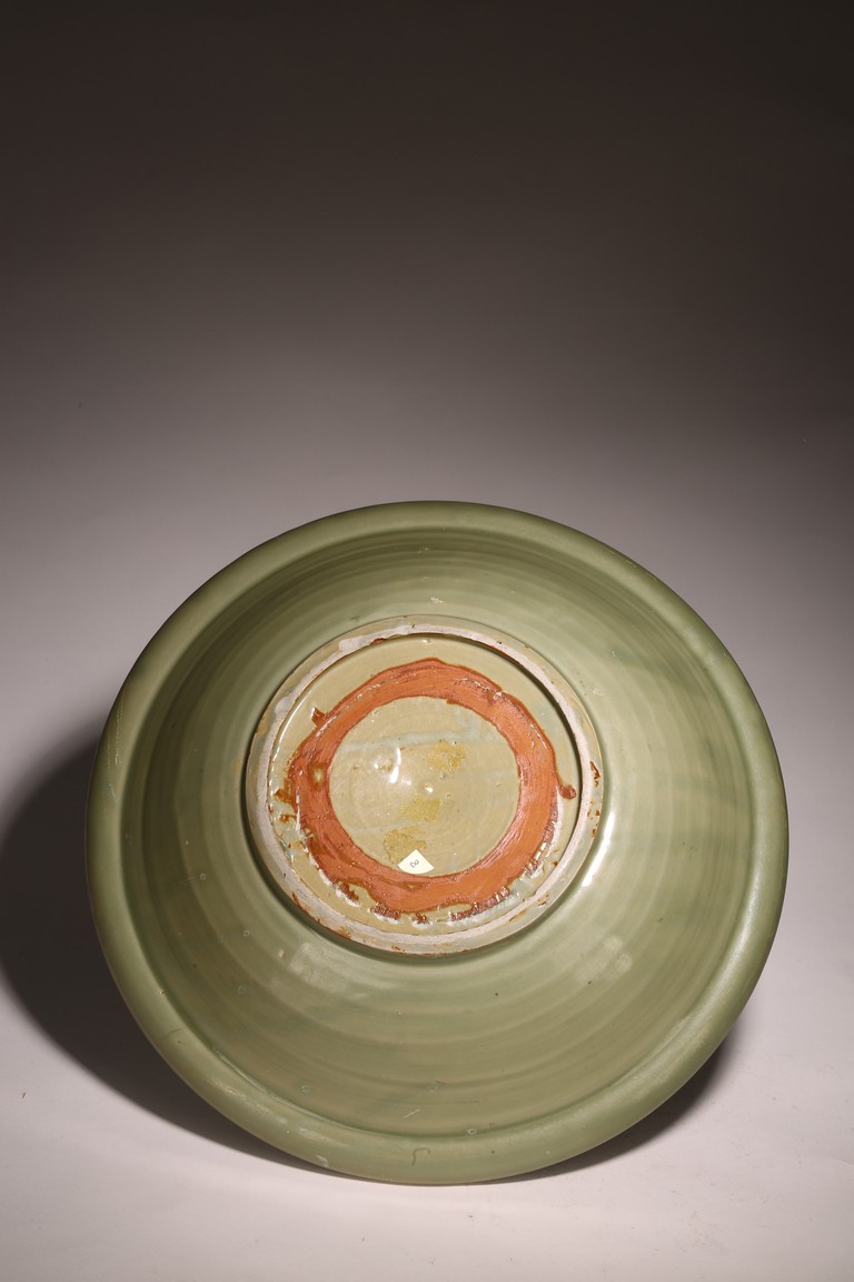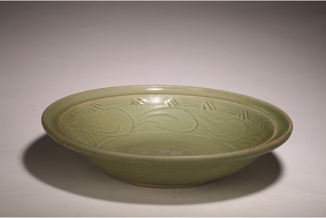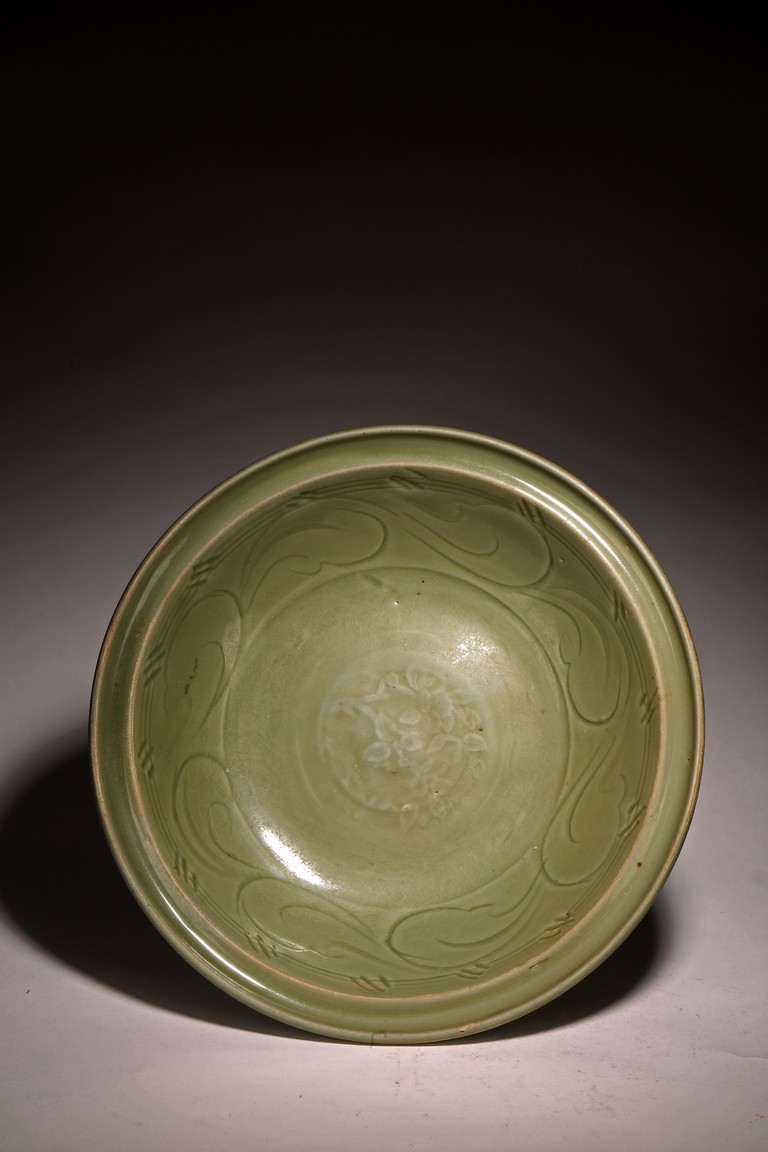 Ming Dynasty period. Sturdily potted with shallow sides and everted rim, carved to the interior with large lotus bloom, overall covered in olive green glaze.