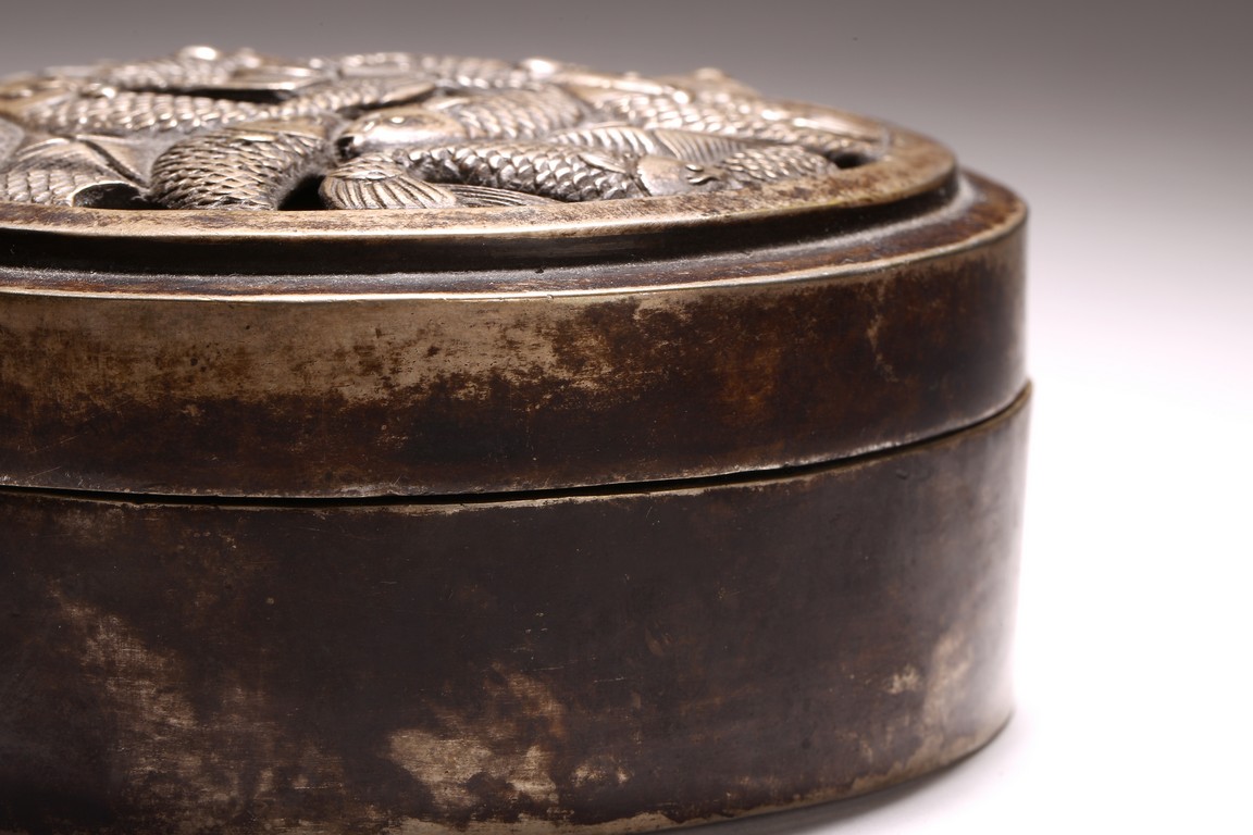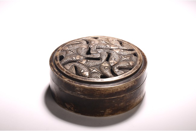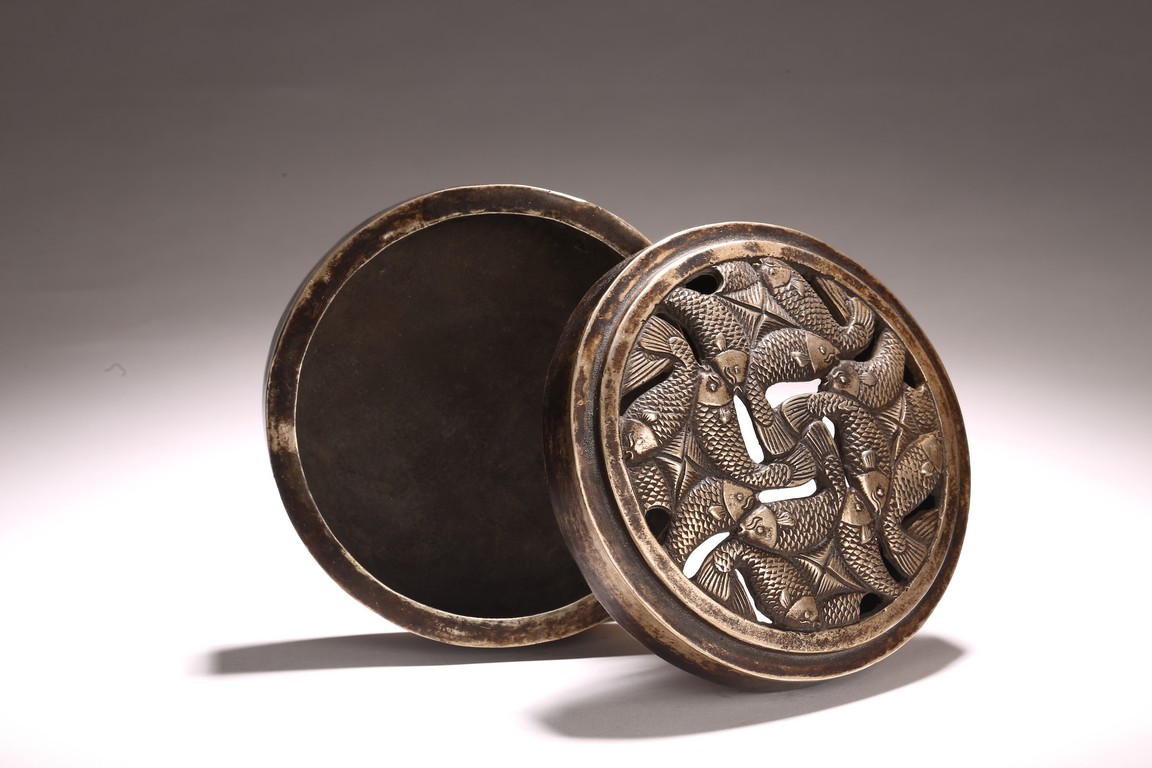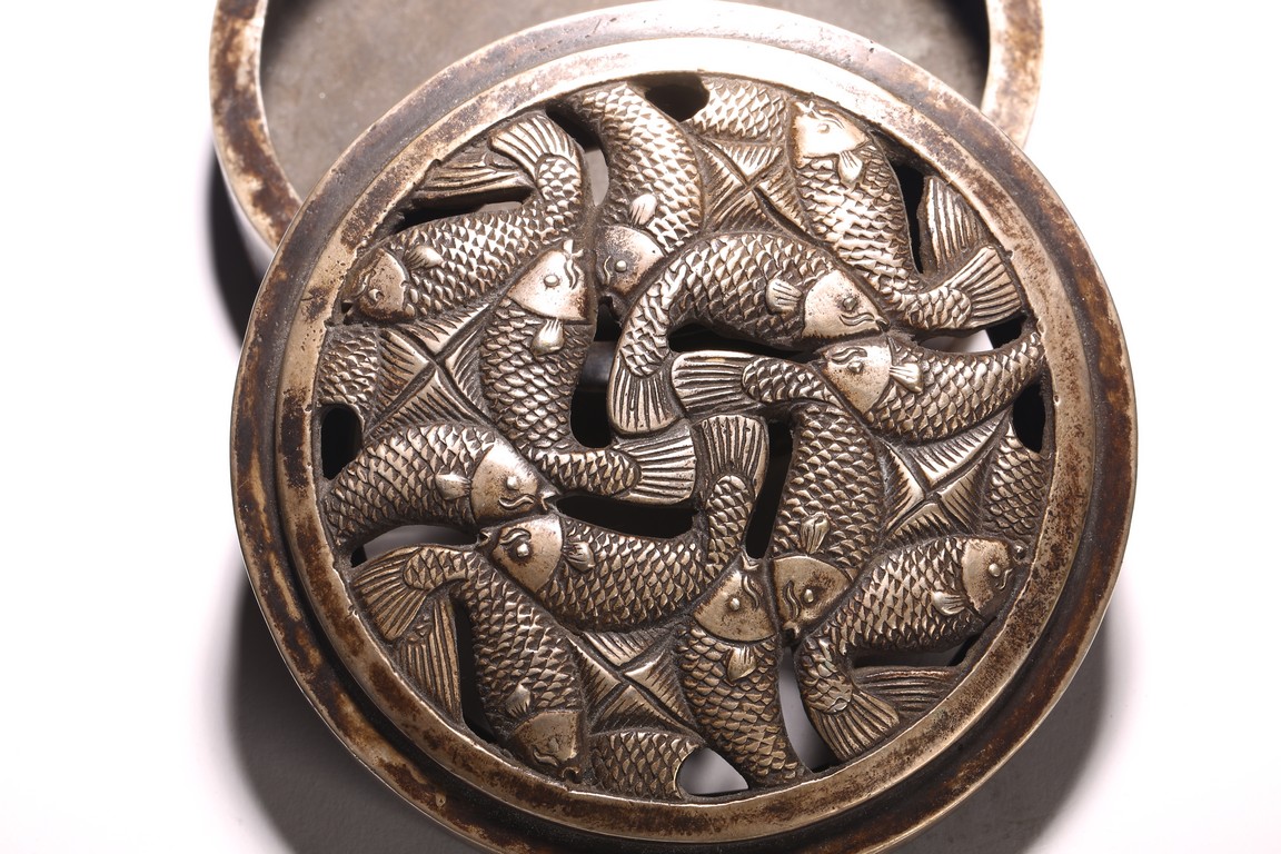 Qing Dynasty period. Of circular form, the top cast in openwork with intertwining fish detailed with scales, the box base inscribed with three character mark.