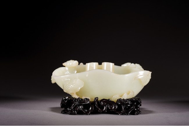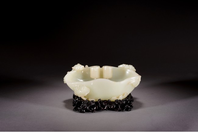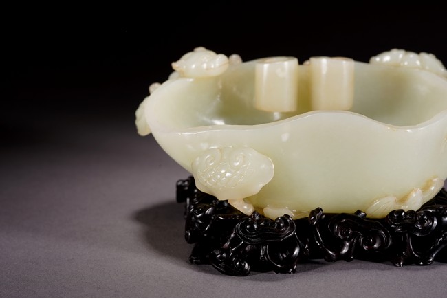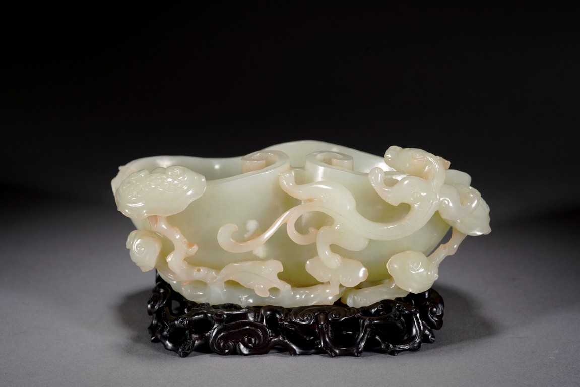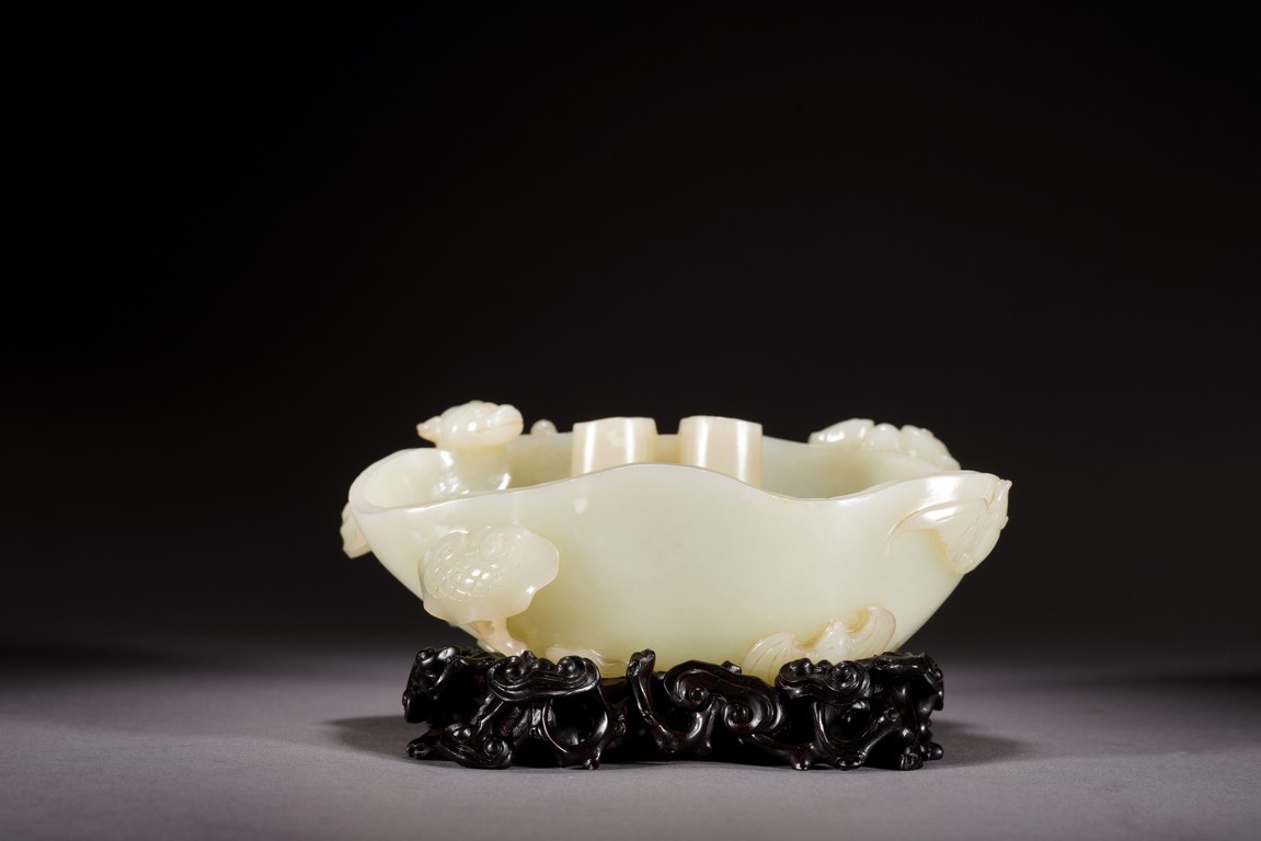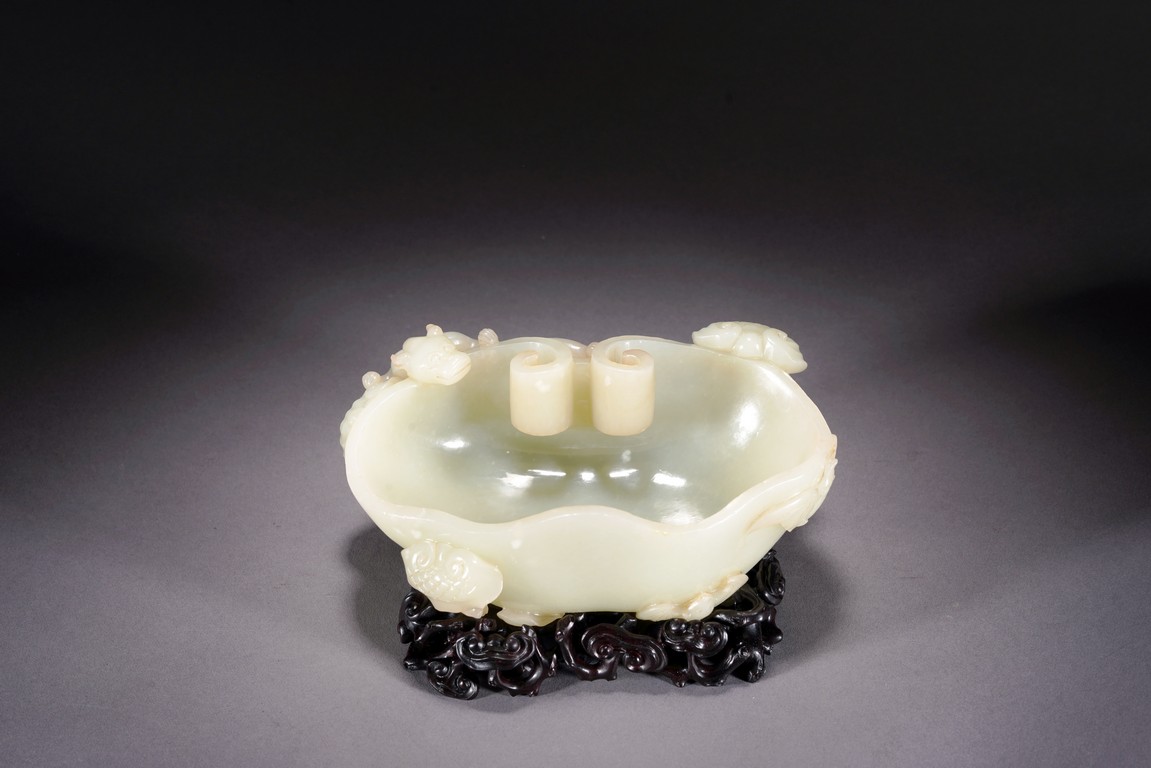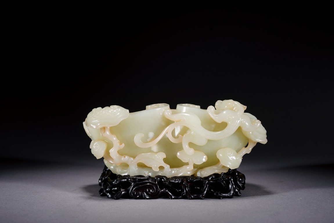 此件玉洗白玉爲材,玉質通透,純淨而凝潤。造型以文房雅具中水洗的形式而制,如意型的洗身敞口,外沿凸雕螭龍,龍身矯健,身軀健壯,指爪犀利。象征生活美滿如意,太平盛世祥。 來源:奧勒岡州華盛頓縣私人藏家提供 Provenance: Property from a private collection, Washington County, Oregon