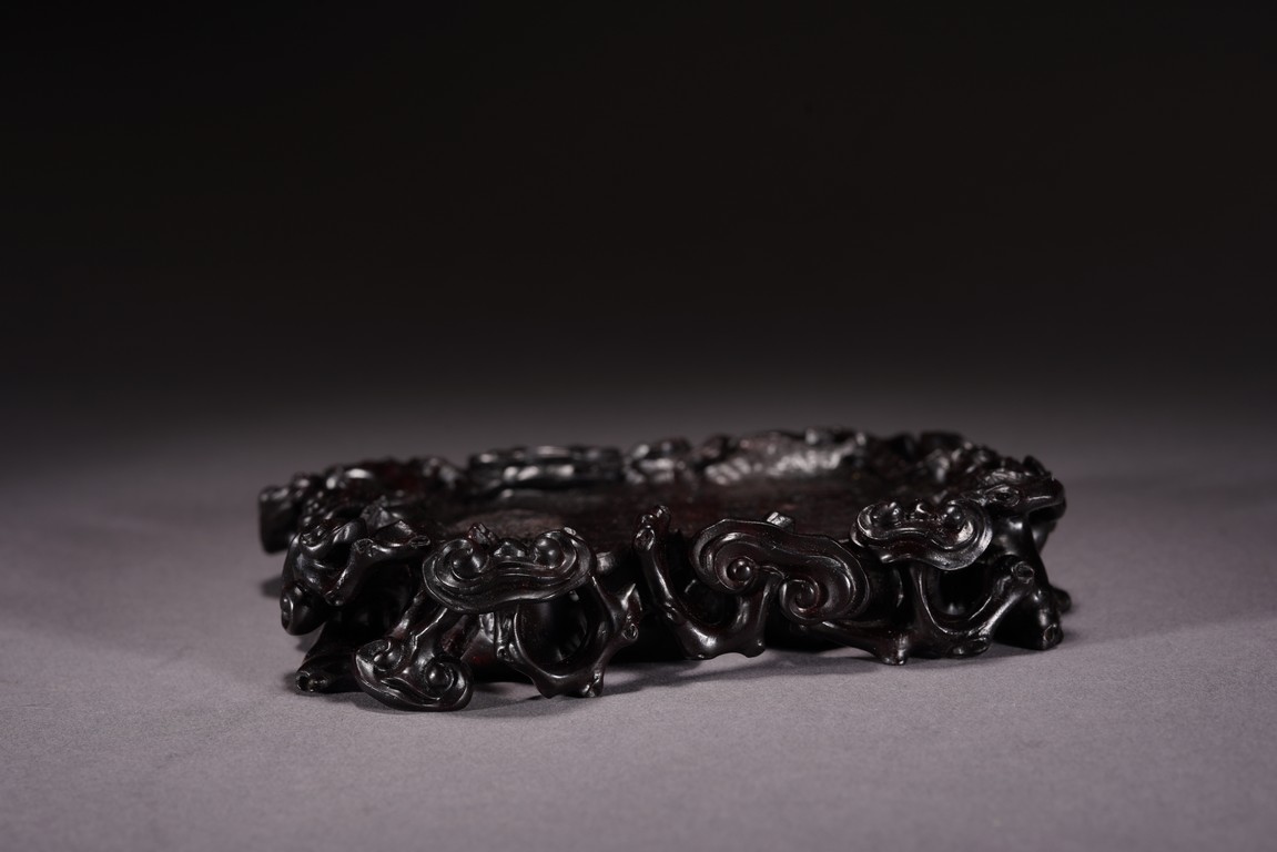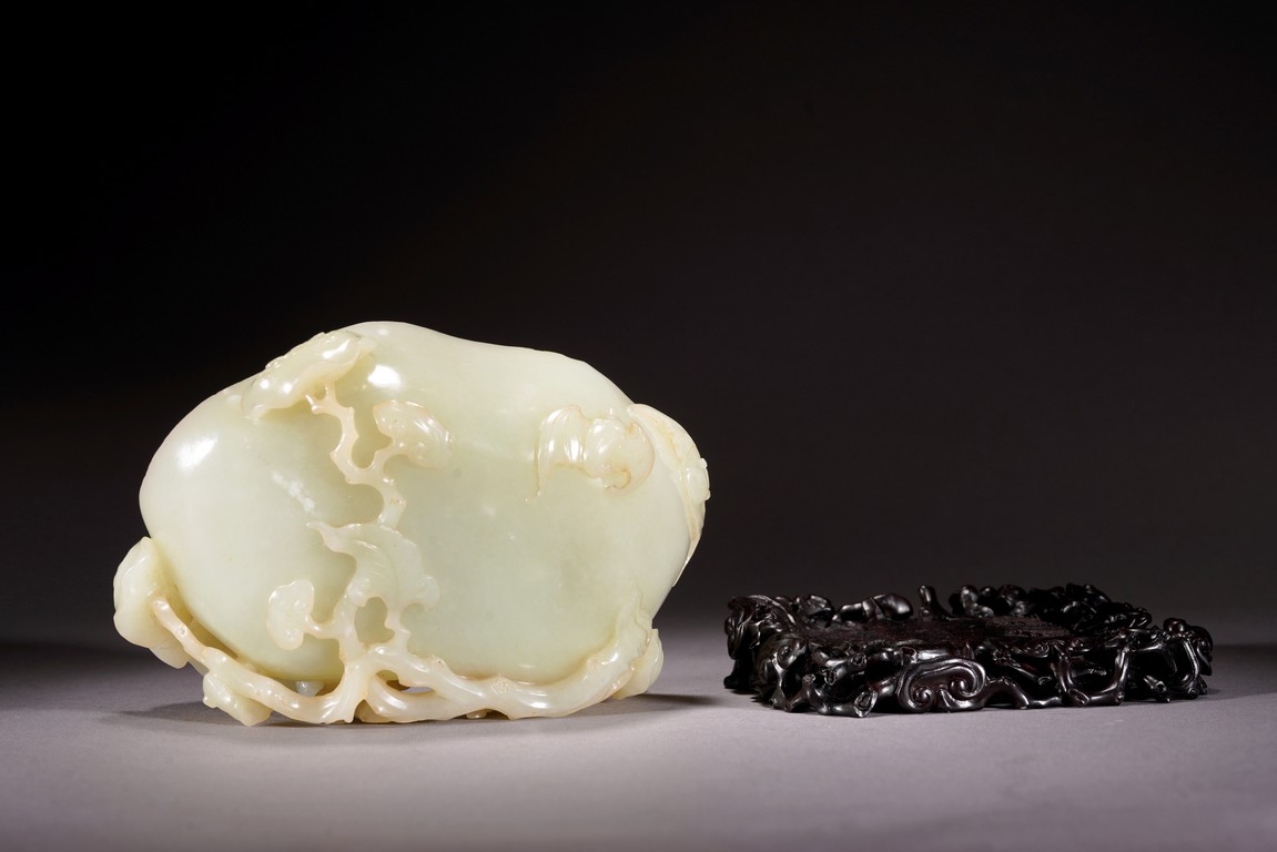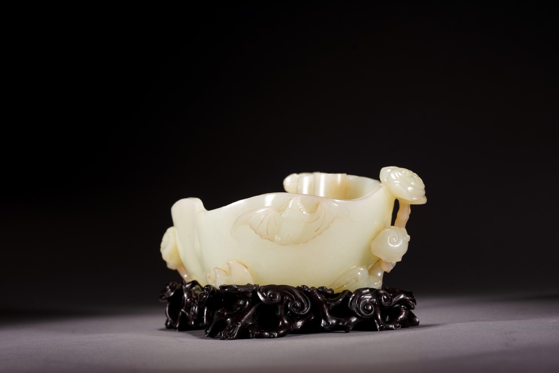 Qing Dynasty period. Carved in the form of ruyi head with chi dragons, bats, and lingzhi fungus heads on the exterior, the stone is of smooth polished white tone, with carved hardwood stand.