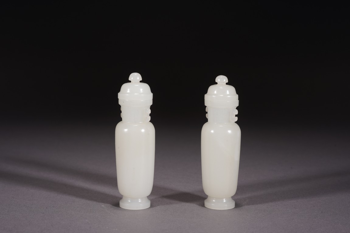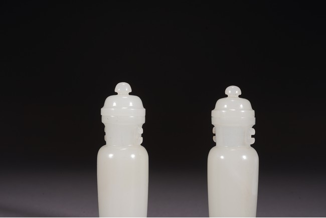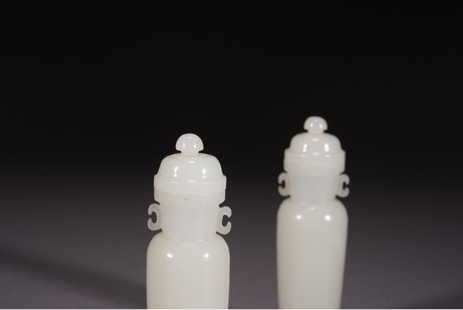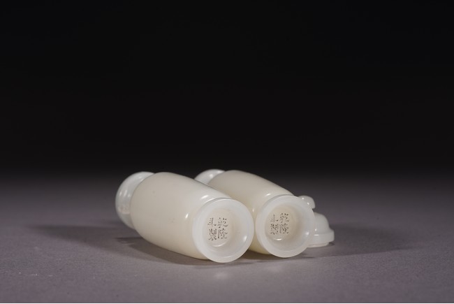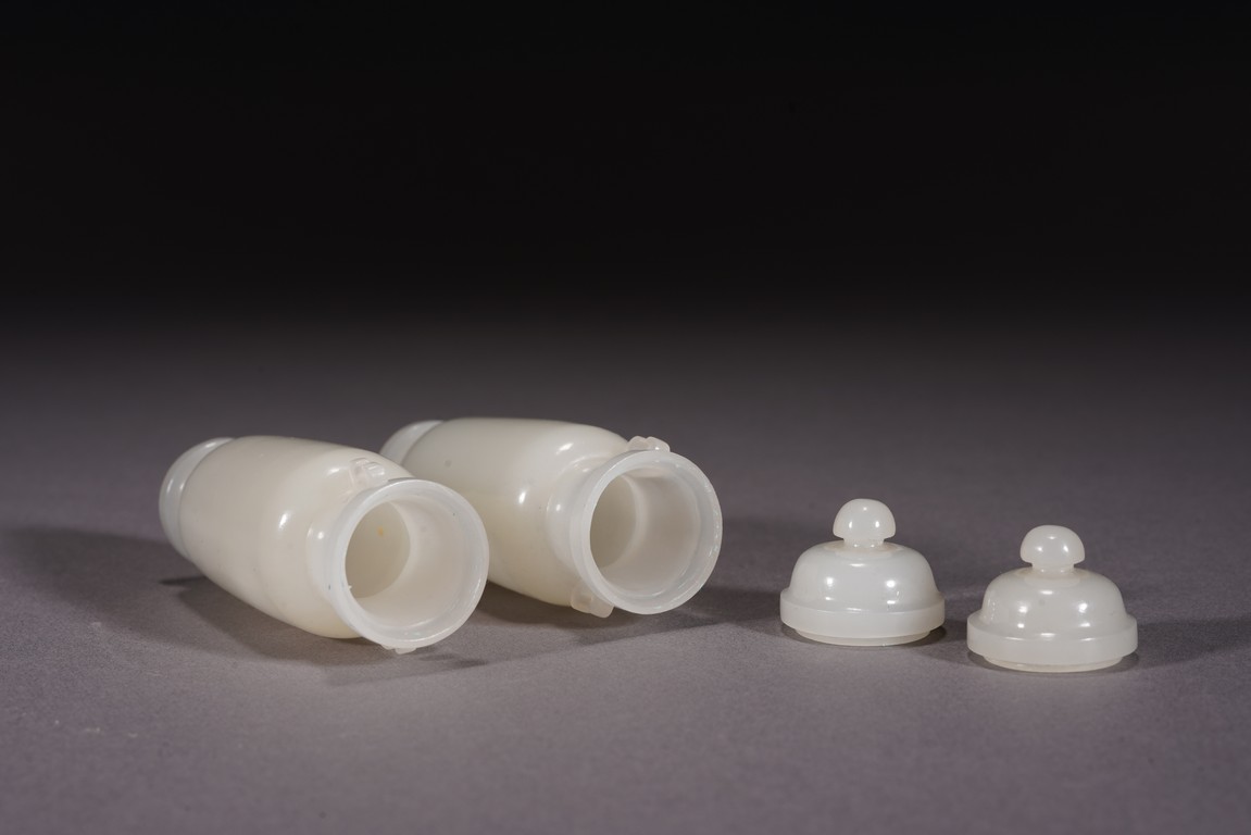 瓶帶蓋,子母口,短頸,飾雙耳,鼓腹下收,通體光素無紋,用上等羊脂白玉制 作而成,玉質純淨,瑩潤無暇,質白細膩,玻璃感極強。形制規整,素雅秀美, 充分顯示出玉石的“體如凝脂,精光內蘊,質厚溫潤,脈理緊密”之本。“乾隆 年制”款識,字迹工整,排列整齊,爲案頭陳設佳品。