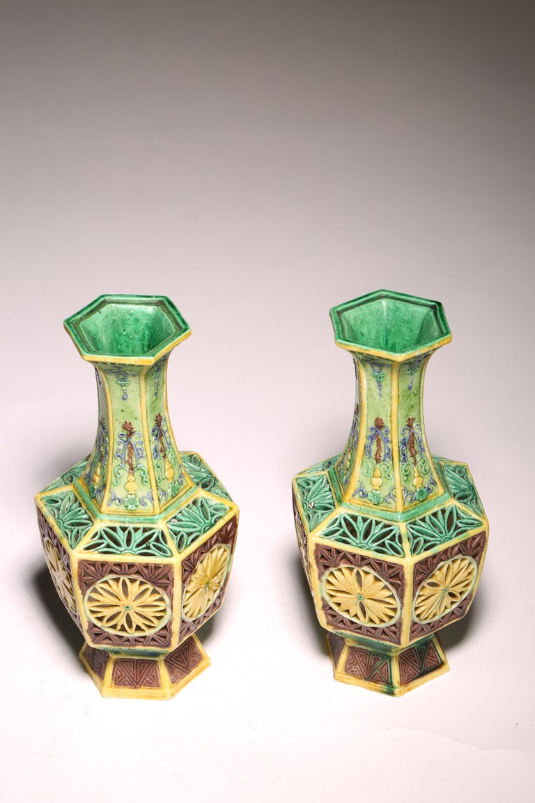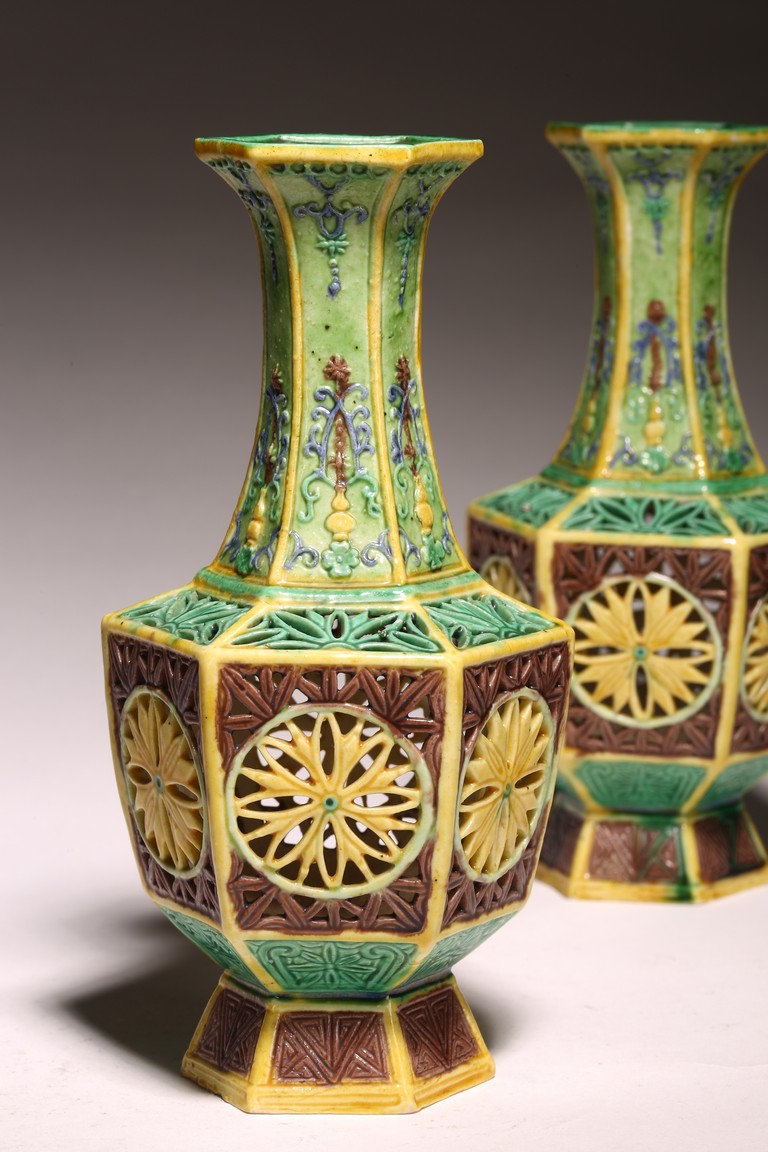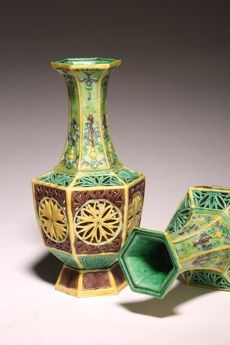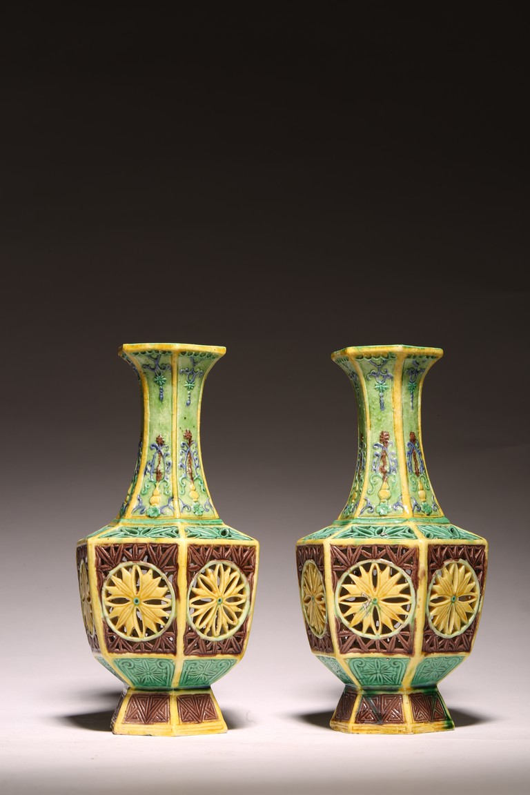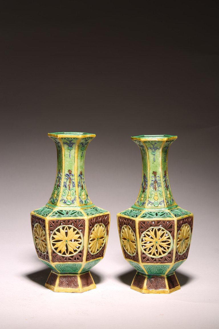 敞口,長頸,型作六方,圈足外撇。施素三彩,頸部繪“花卉紋”“葫蘆紋”, 腹部镂空繪“花瓣紋”,成對保存。